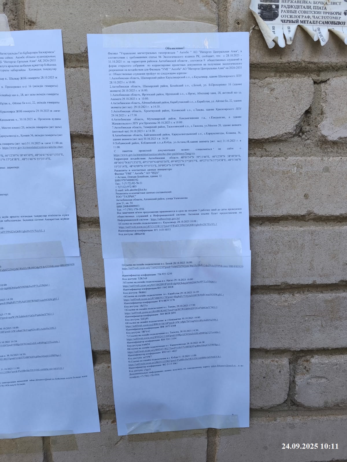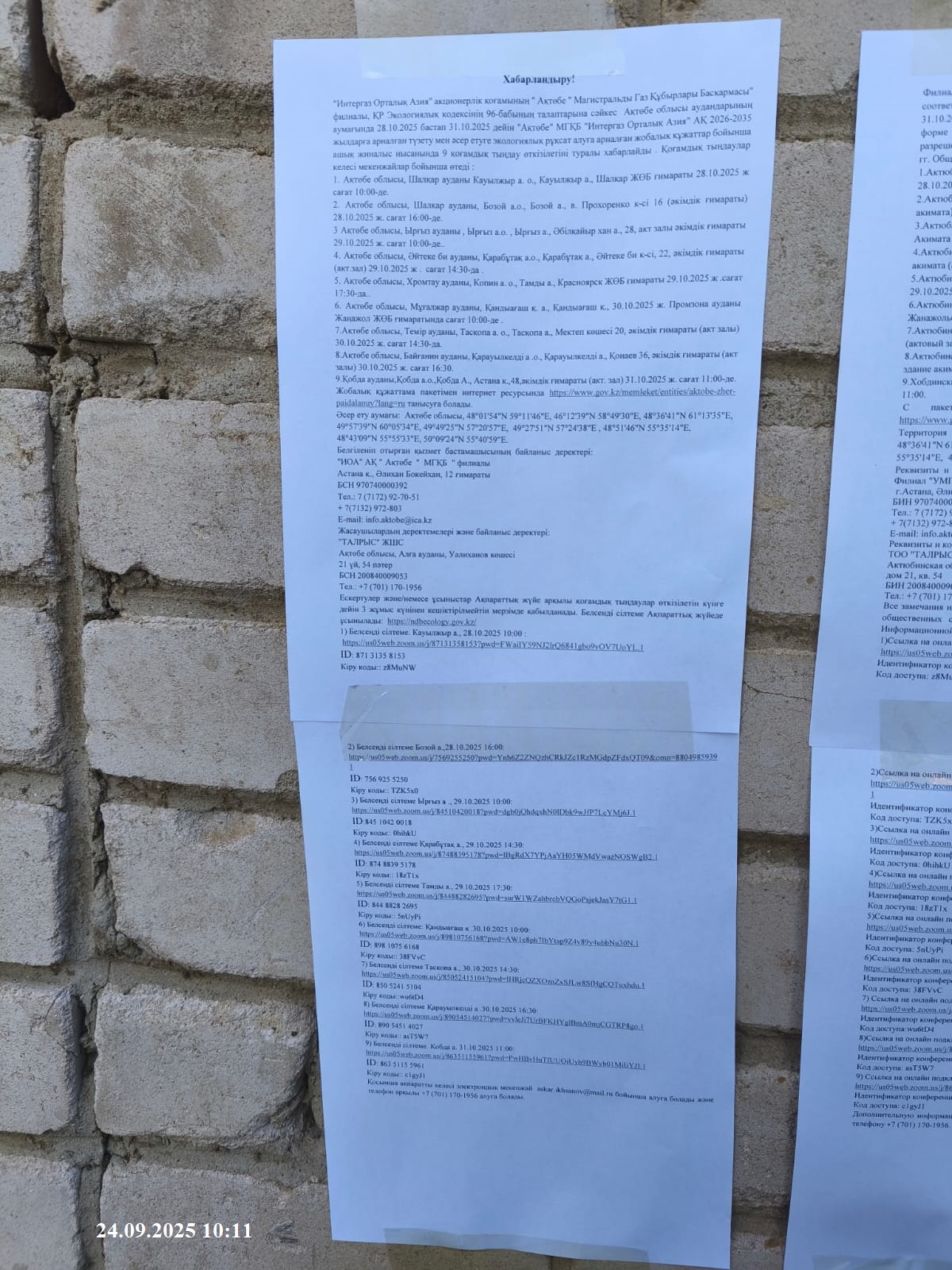 4. Повестка дня общественных слушаний: Управление магистральных газопроводов (УМГ) «Актобе» осуществляет оперативную эксплуатацию и управление технологически связанными магистральными газопроводами (МГ) «Бухара-Урал», газопровод-отвод на город Актобе, «Жанажол-Актобе»,«Жанажол - КС-13», а также эксплуатация подземного хранилища газа ПХГ «Бозой» через линейные производственные управления (ЛПУ), а также эксплуатацию распределительных газо-проводов АО «QazaqGazAimaq» на договорной основе и включает в состав 4 линейно – производственные управления: • Аральское ЛПУ; • Шалкарское ЛПУ; • Краснооктябрьское ЛПУ; • Жанажолское ЛПУ. ссылка на онлайн подключение: https://us05web.zoom.us/j/86351155961?pwd=PwHBvHuTfUUOiUyh9BWvb01MiIiYJI.1 Идентификатор конференции: 863 5115 5961 Код доступа: c1gyJ1