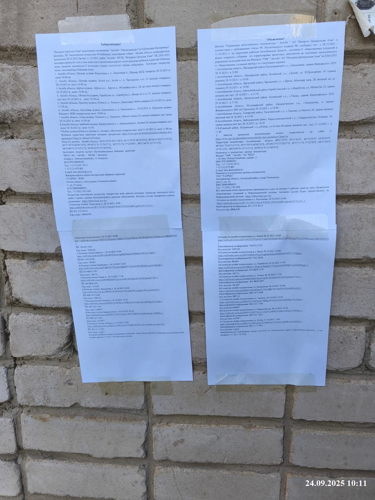 6. Объявление о проведении общественных слушаний на казахском и русском языках будет распространено следующими способами: