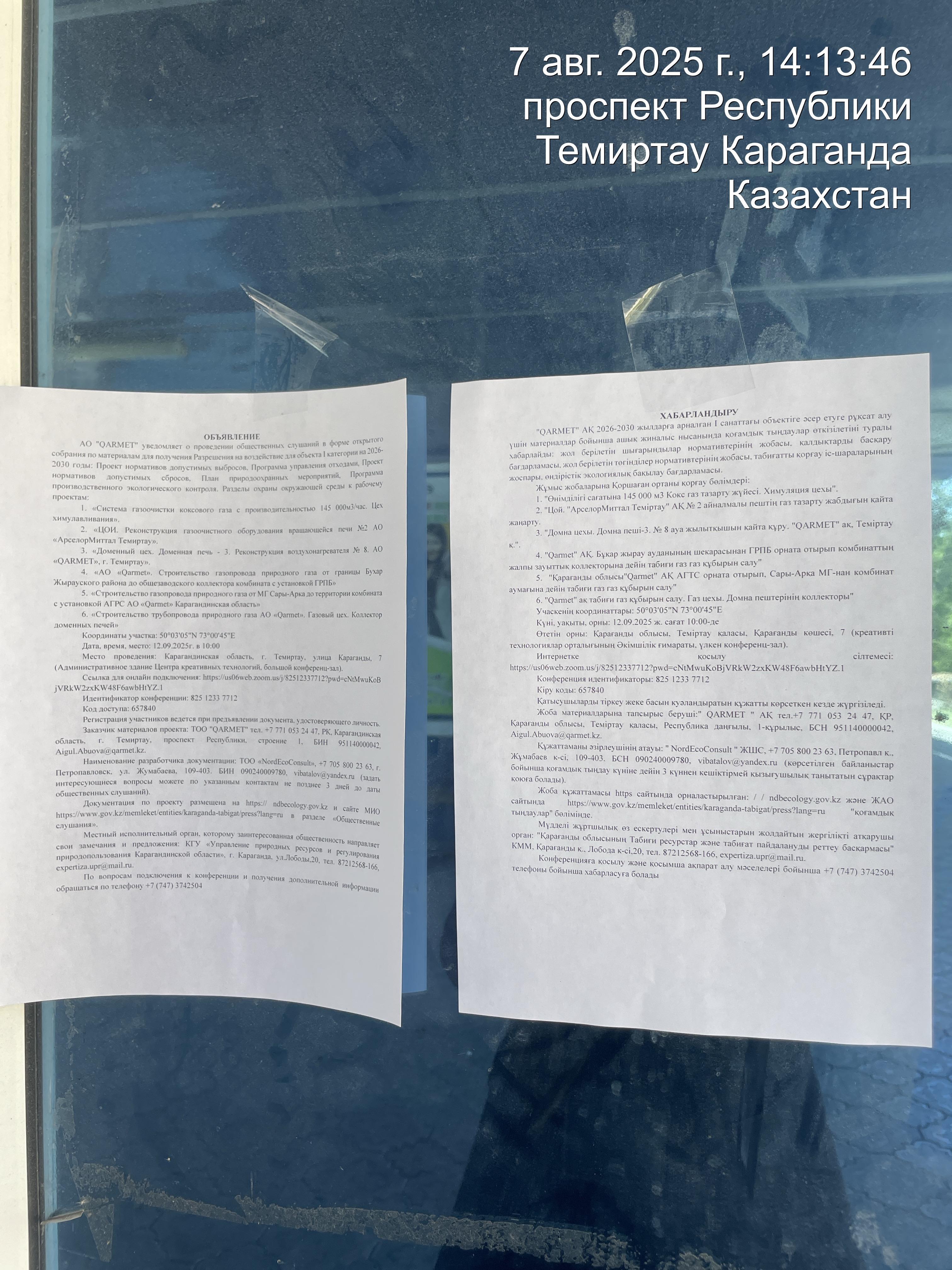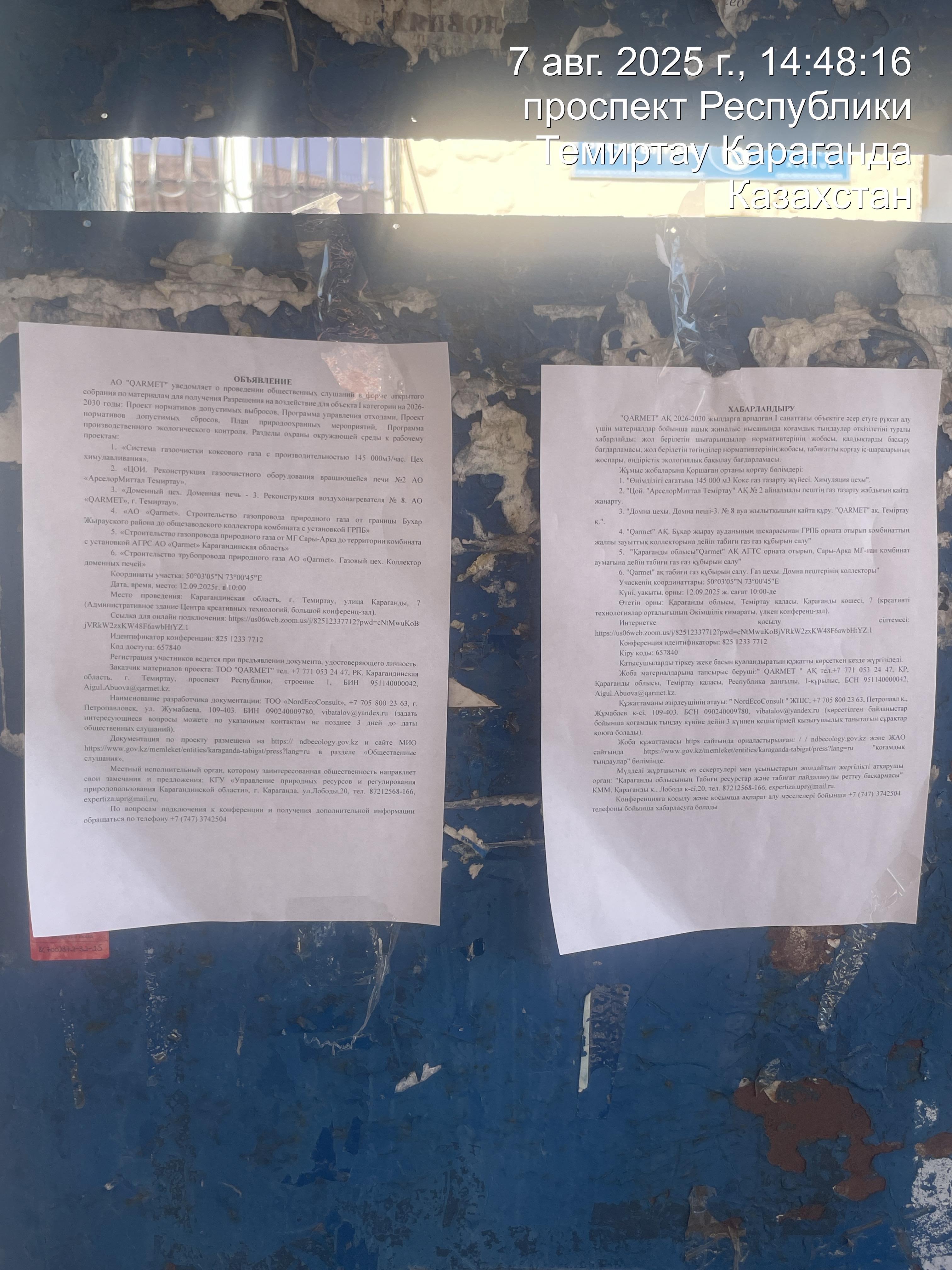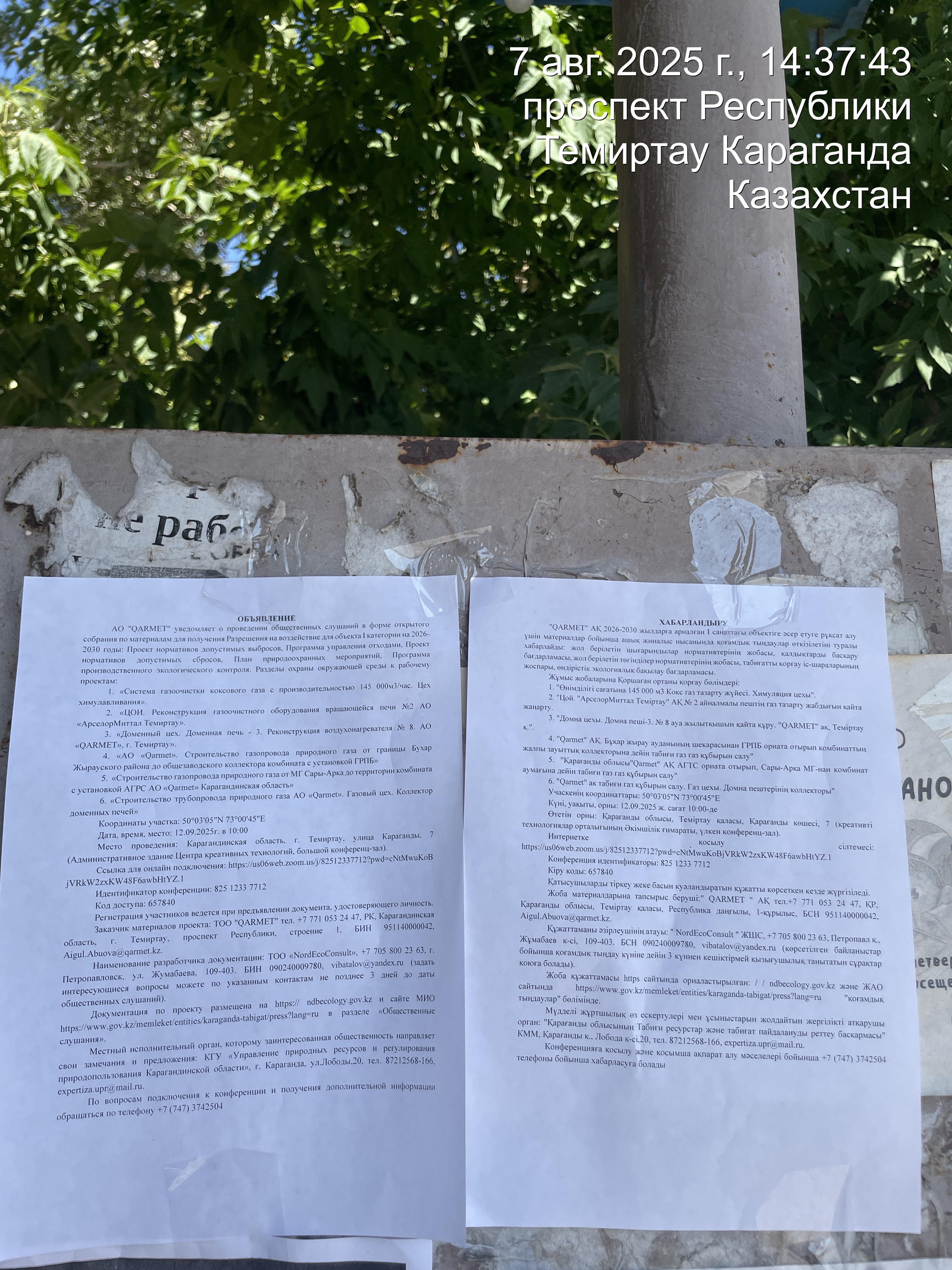 4. Повестка дня общественных слушаний: АО «Qarmet» расположен по адресу: Республика Казахстан, Карагандинская область, г. Темиртау, пр. Республики, 1. Координаты участка: 50°03'05"N 73°00'45"E В соответствии с «Решением по определению категории объекта, оказывающего негативное воздействие на окружающую среду» от 23 августа 2021 года определена I категория объекта (решение представлено в Приложении 2). Основная металлургическая площадка АО «Qarmet» расположена к востоку от г. Темиртау на левом берегу Самаркандского водохранилища. Площадь, занимаемая основным участком СД АО «Qarmet» составляет 3098,2692 га. Основной деятельностью АО «Qarmet» является производство кокса, агломерата, чугуна, стали, а также непрерывно-литых сляб, сортовой заготовки, горячекатаного, холоднокатаного и сортового проката, электросварных труб, белой и черной жести, проката с цинковым и алюмоцинковым, цветным полимерным покрытиями, ряда химических продуктов, сырья для строительной индустрии. Производит электроэнергию, оказывает коммунальные услуги городу (электро-, тепло-, водоснабжение). Расстояния от предприятия СД АО «Qarmet» до ближайшей жилой зоны : В северно-западном направлении на расстоянии 703 м от жилой застройки расположен склад известняка и доломита (цех обжига известняка). На расстоянии 512 м (в северо-западном направлении) от жилой застройки расположен склад металлолома (отделение копрового цеха). На расстояний 422 м от жилой застройки на ст.Аккудык расположен отвал доменных шлаков. АО «Qarmet» является предприятием с полным металлургическим циклом, в состав которого входят также электростанции ТЭЦ-ПВС и ТЭЦ-2. Корректировка проекта нормативов допустимых воздействий в части выбросов загрязняющих веществ в окружающую среду для СД АО «Qarmet» связана выработкой новой стратегии, направленной на увеличение объемов производства и достижения поставленных целей на 2026-2030 годы. Нормативы предельно допустимых выбросов (без учета выбросов от передвижных источников и с учетом плана природоохранных мероприятий) на 2025 г. Составляют 215 484,207513 т/год. Расчетные с учетом производственной мощности составят: На 2026 год – 226904,8705 тонн; на 2027 год – 247806,8386 тонн; на 2028 год -263537,1858 тонн на 2029 год – 276035,2698 тонн; на 2030 год – 283577,2171 тонн. Ссылка для онлайн подключения: https://us06web.zoom.us/j/82512337712?pwd=cNtMwuKoBjVRkW2zxKW48F6awbHtYZ.1 Идентификатор конференции: 825 1233 7712 Код доступа: 657840