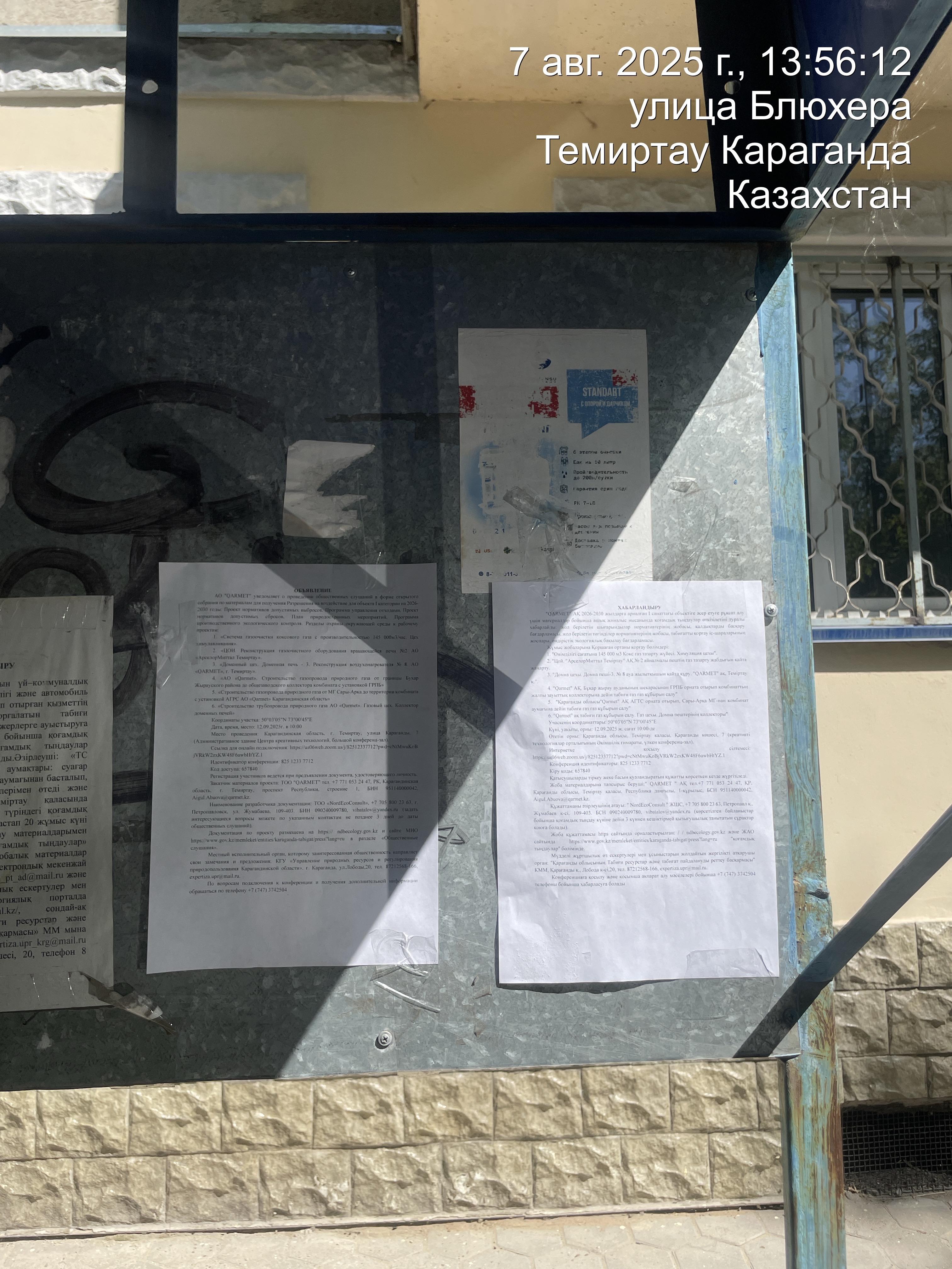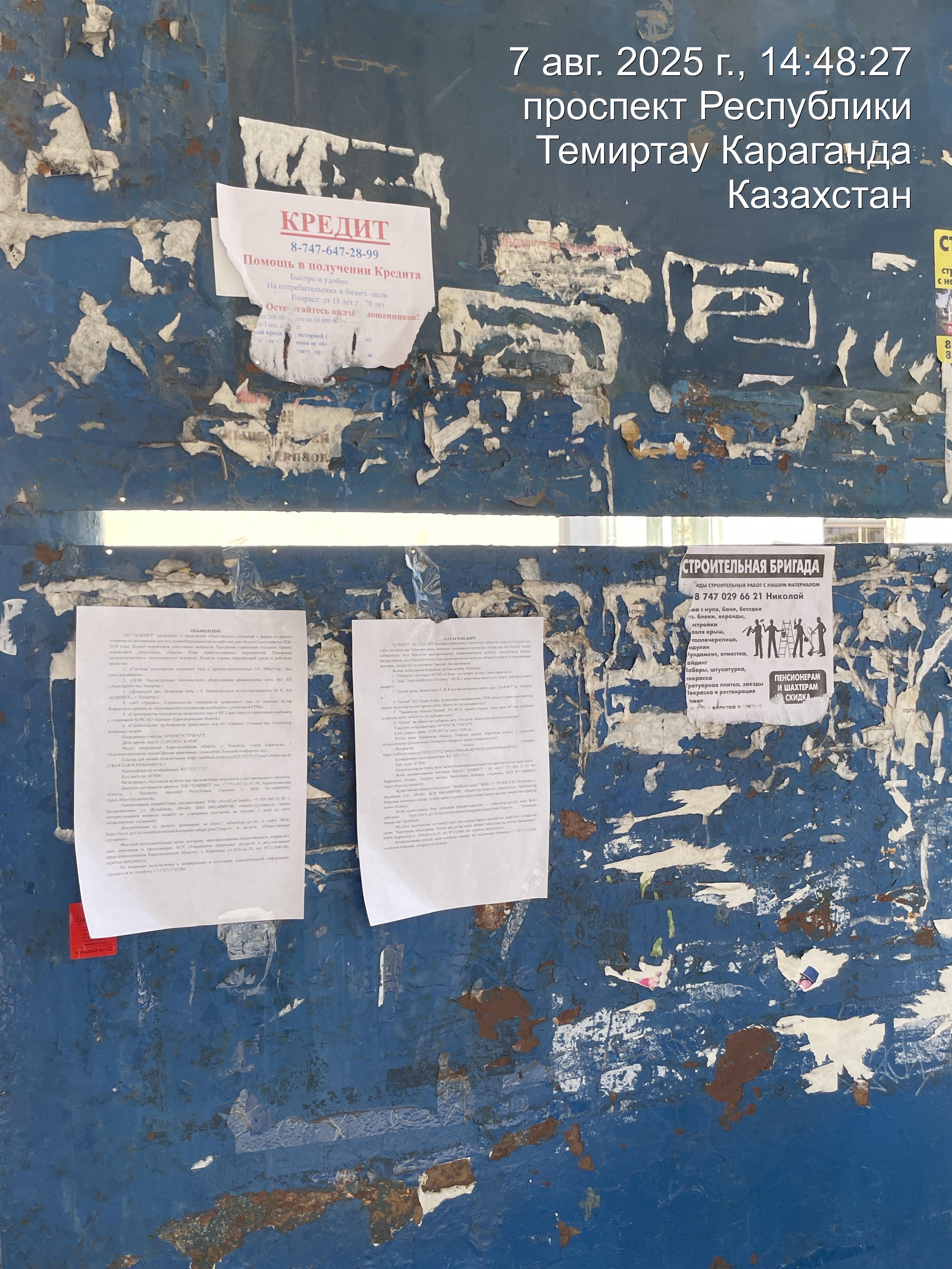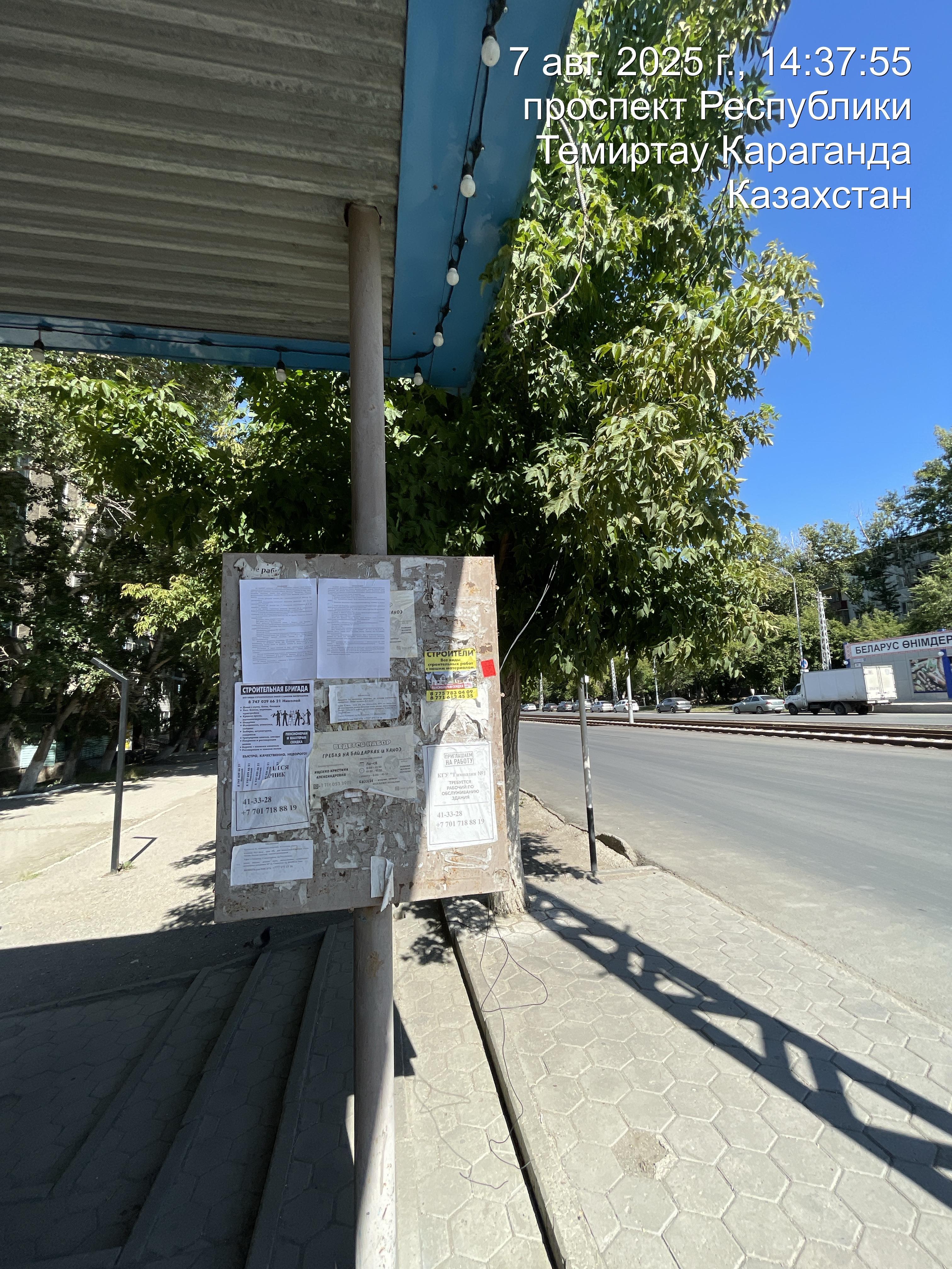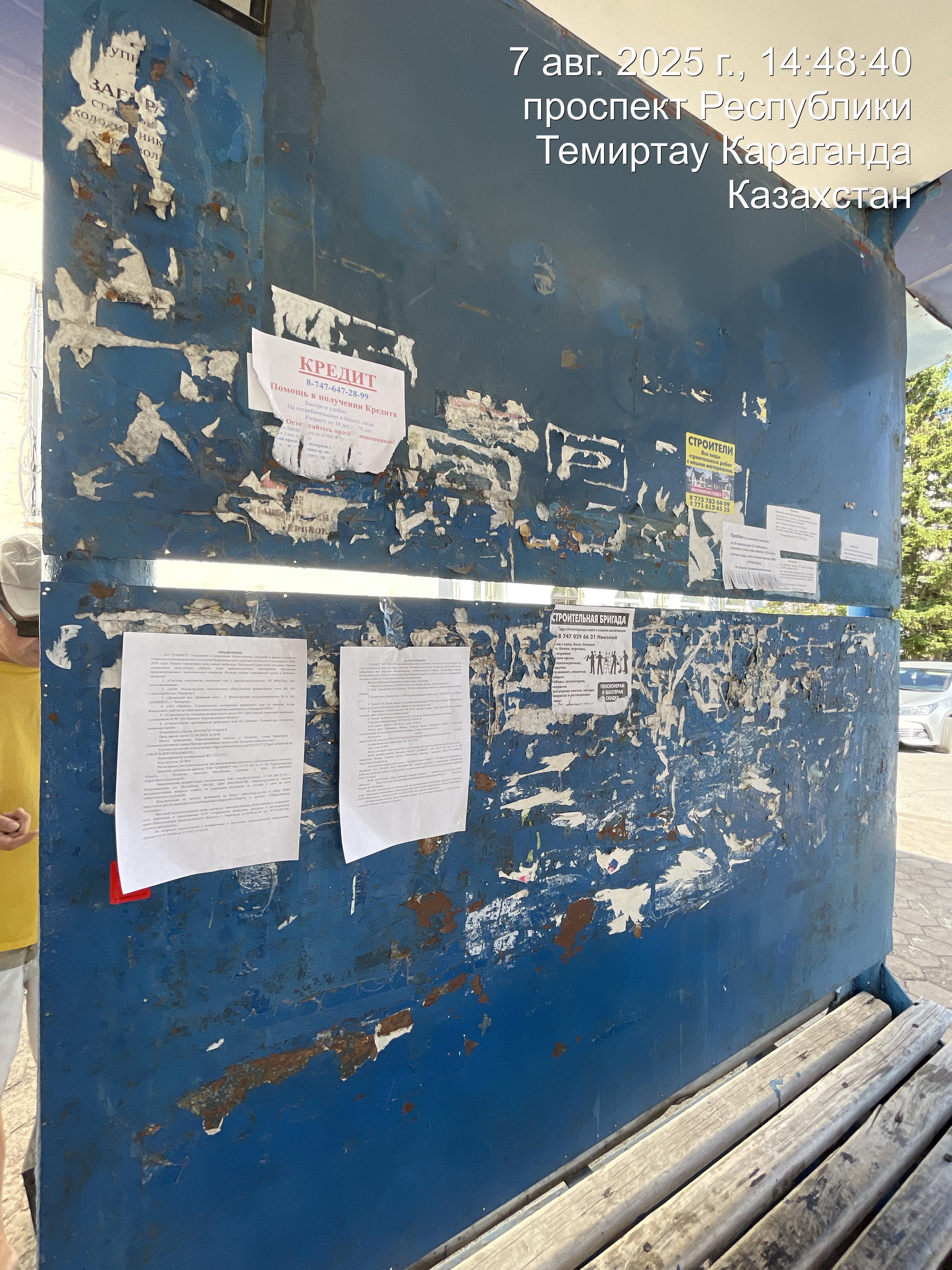 6.3. расположение мест, специально предназначенных для Размещения печатных объявлений (доски объявлений): доска объявлении на остановочных пунктах, отделение Казпочты.
