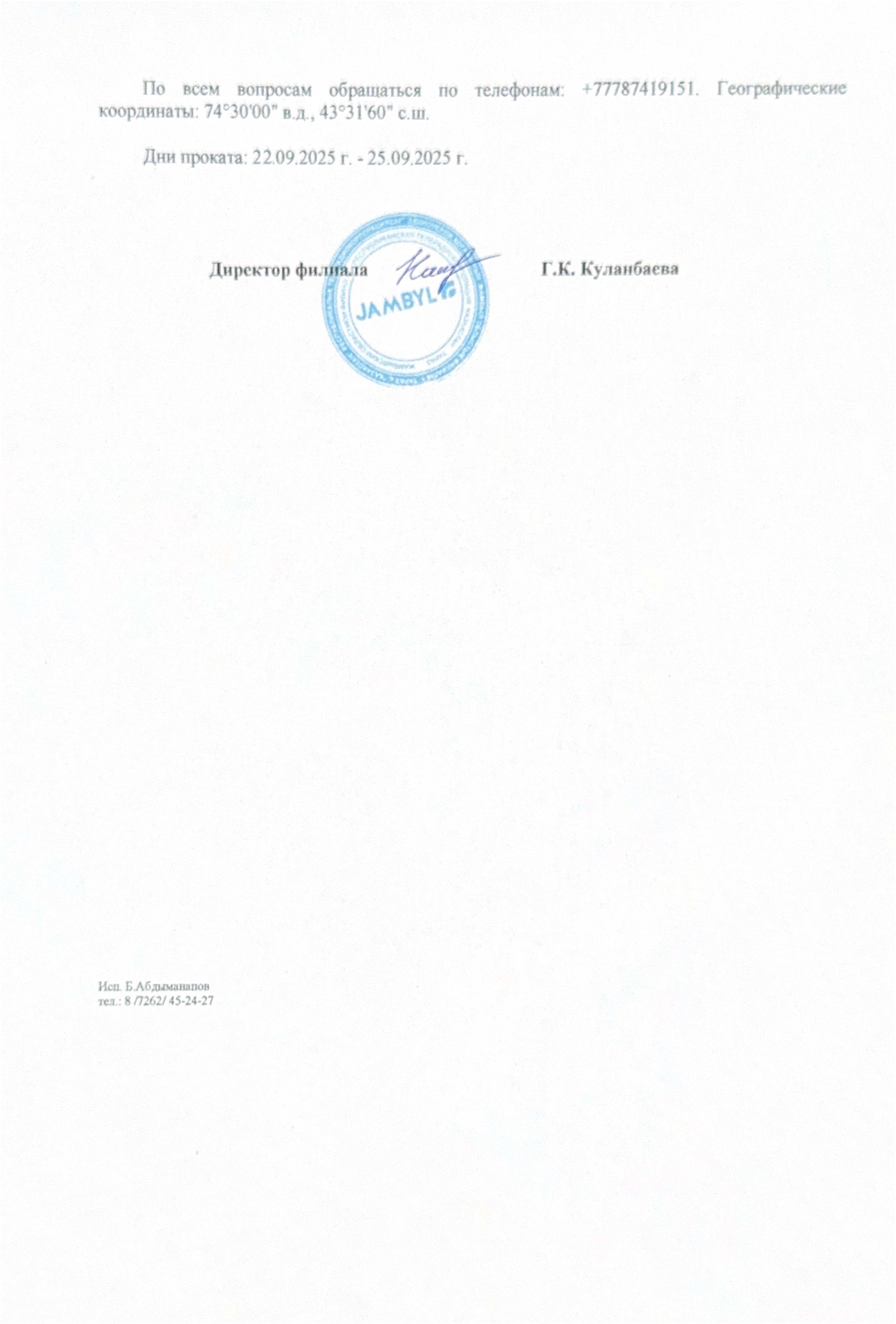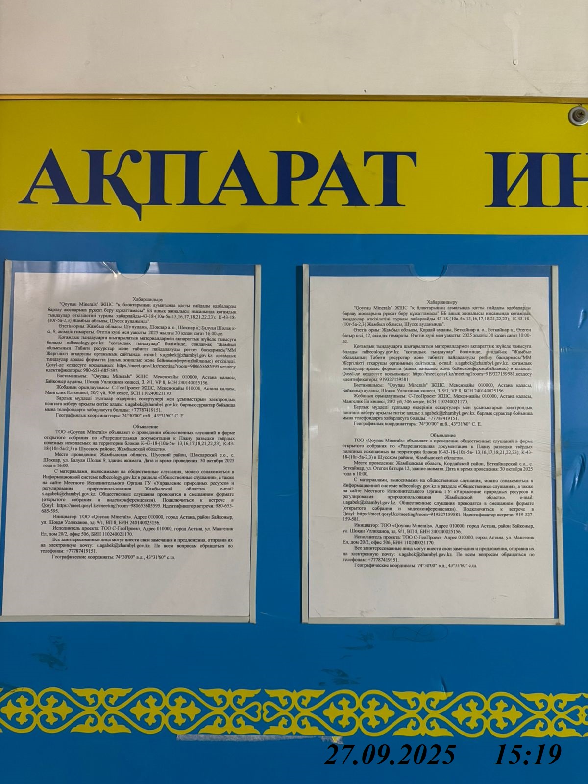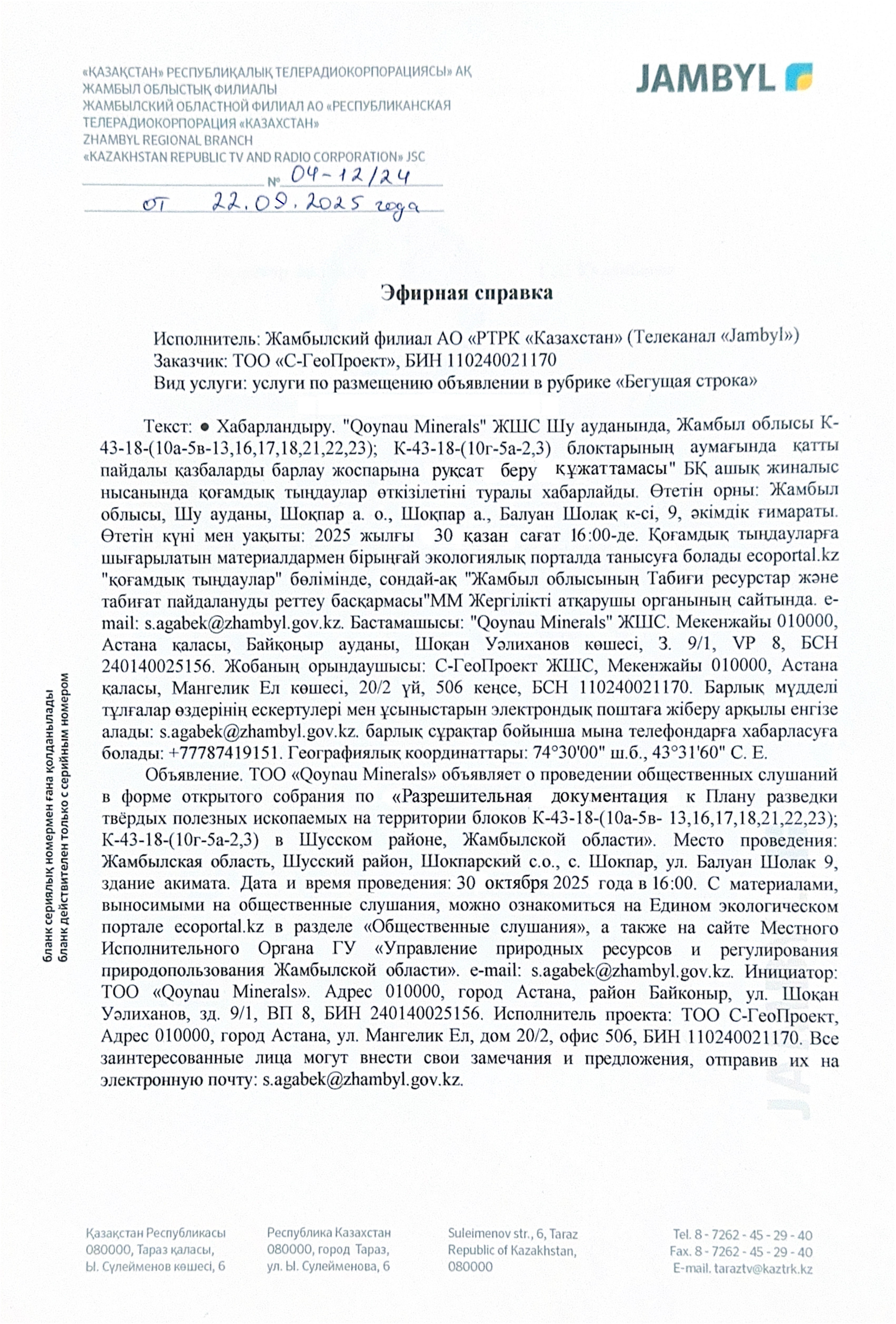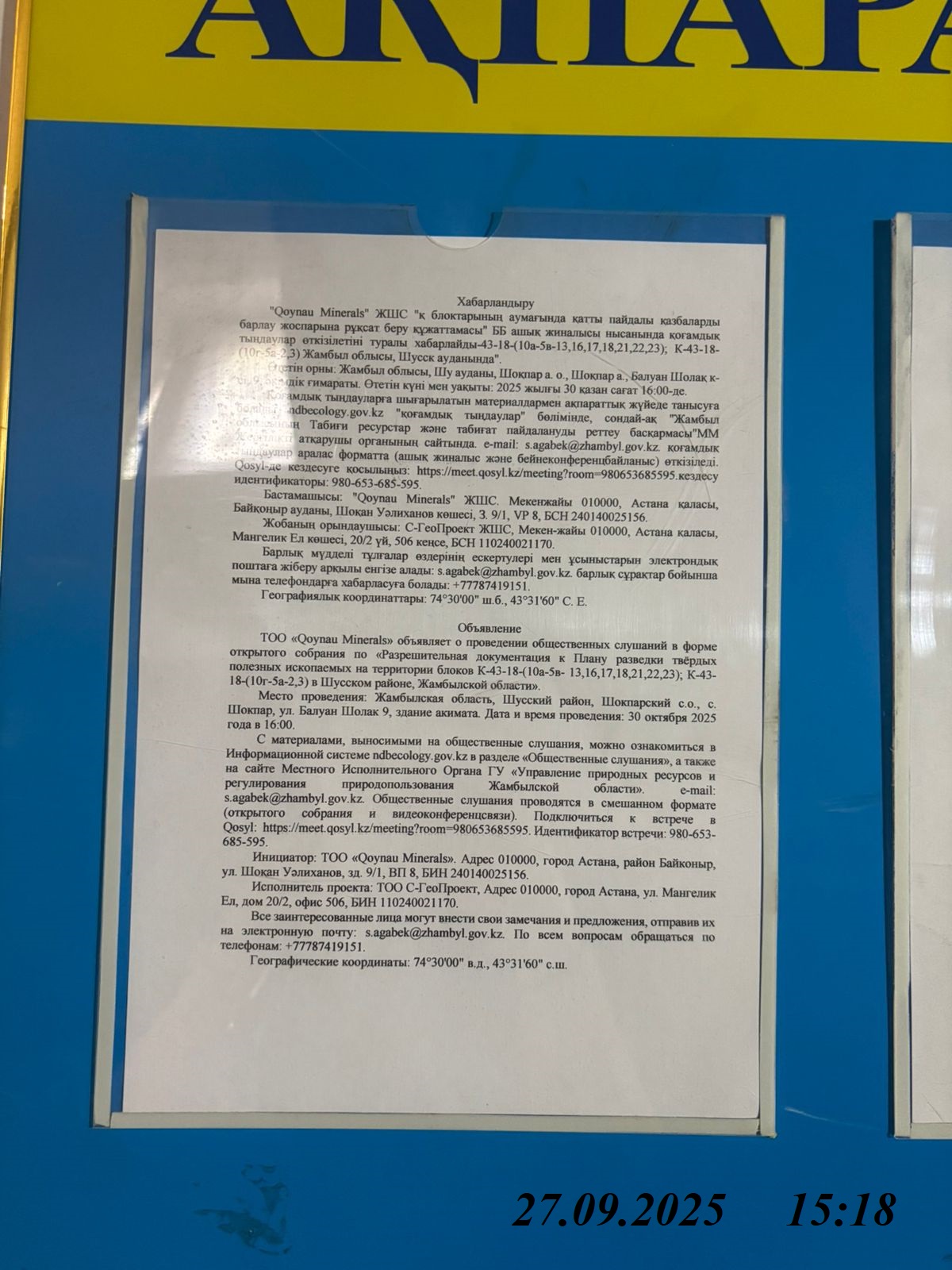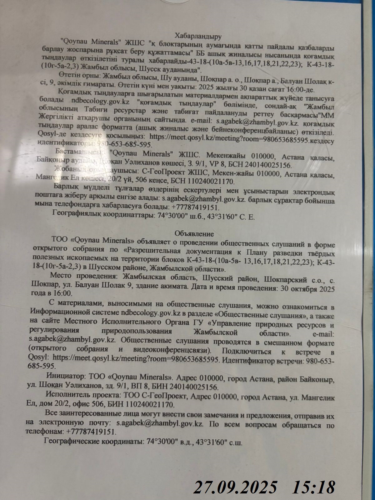 3. Общественные слушания организованны: Управление природных ресурсов и регулирования природопользования Жамбылской области, s.agabek@zhambyl.gov.kz,