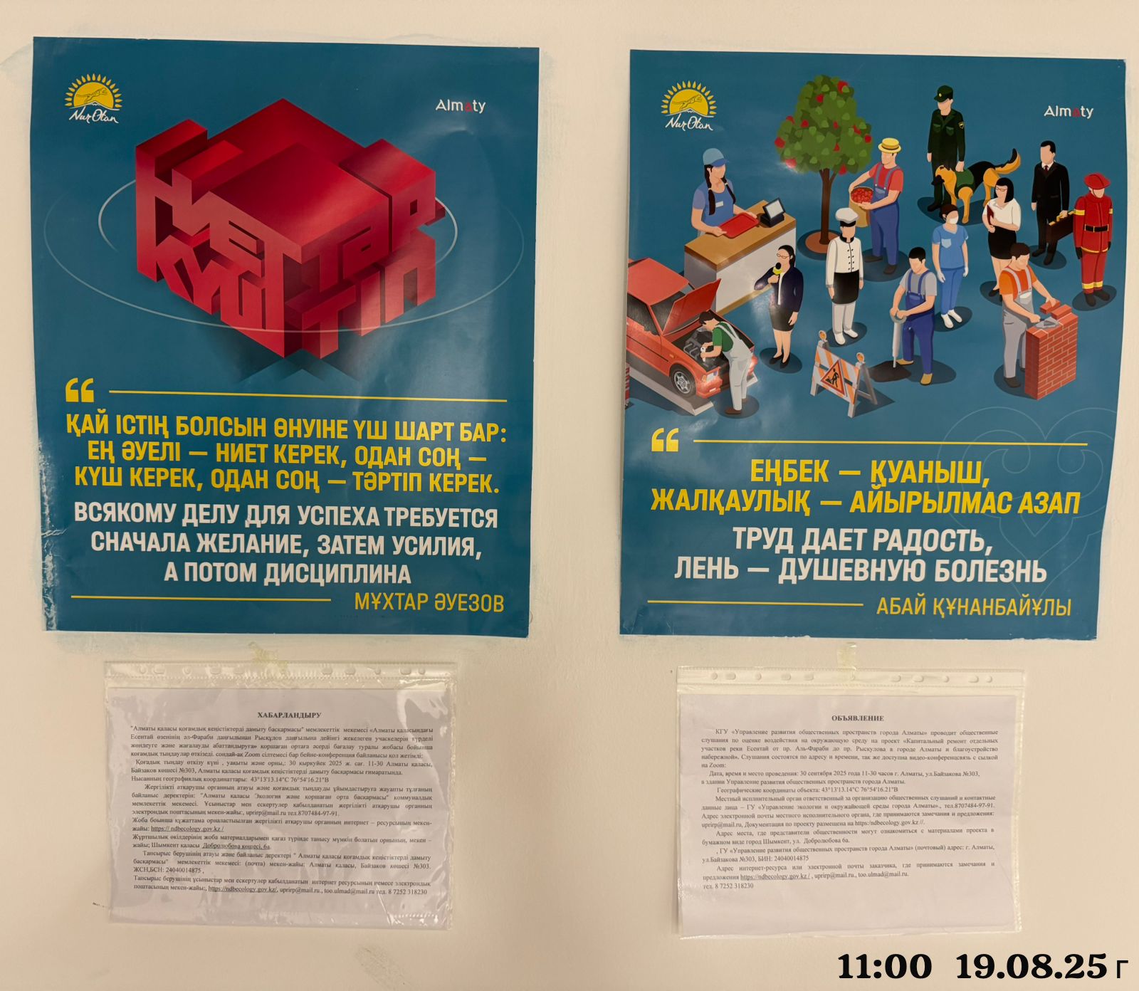 6.3. расположение мест, специально предназначенных для Размещения печатных объявлений (доски объявлений): Доска объявлений в здании Управления развития общественных пространств города Алматы