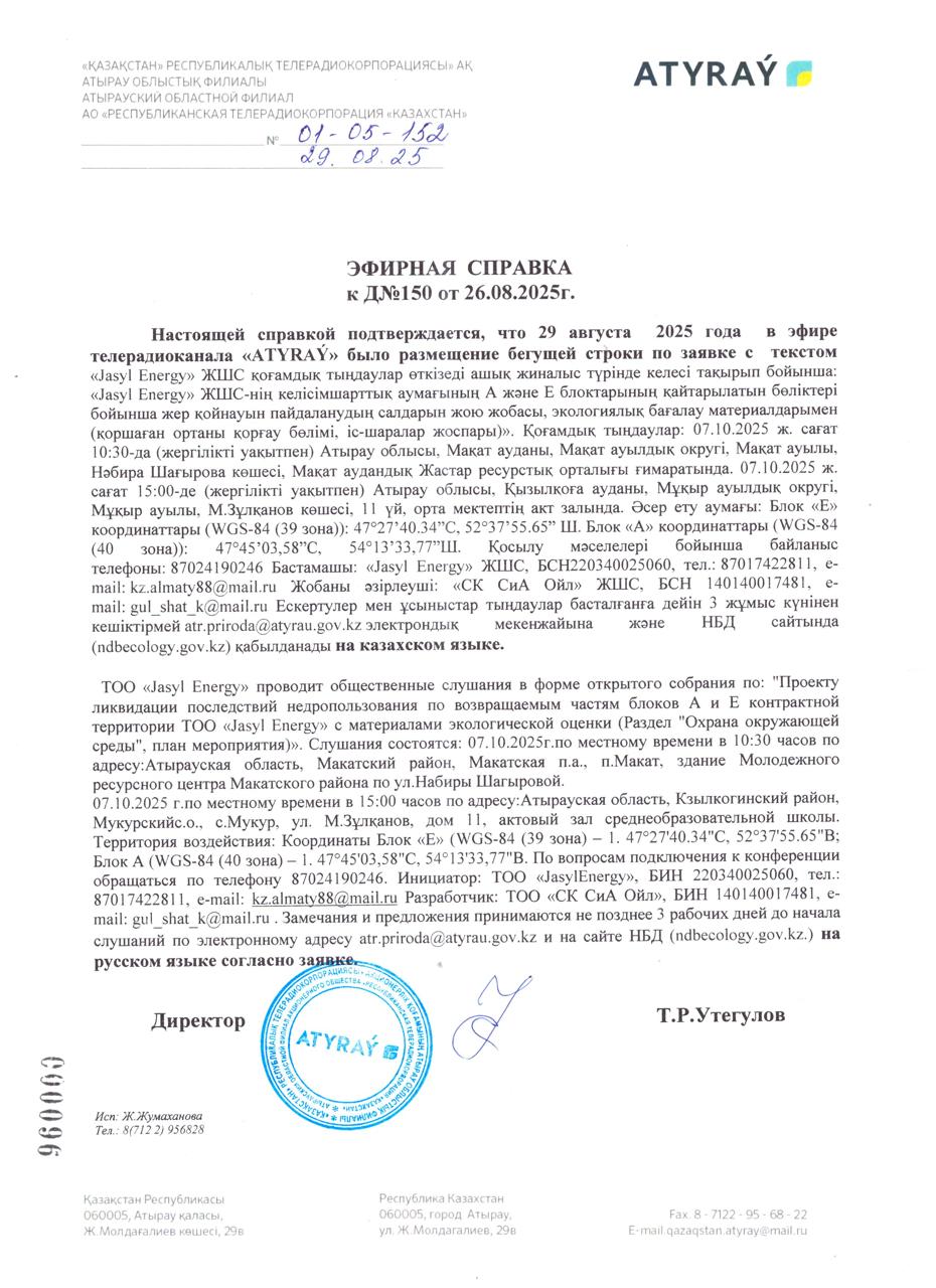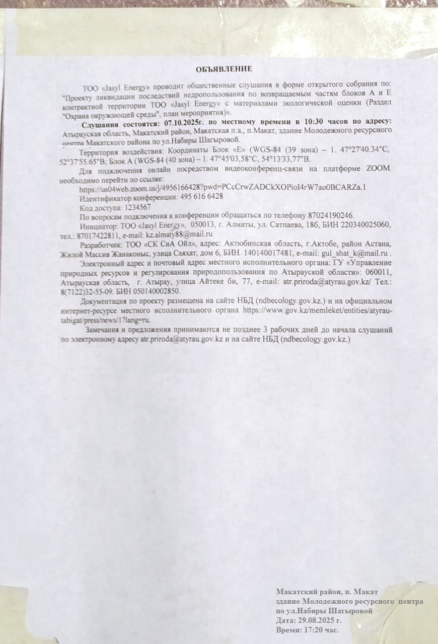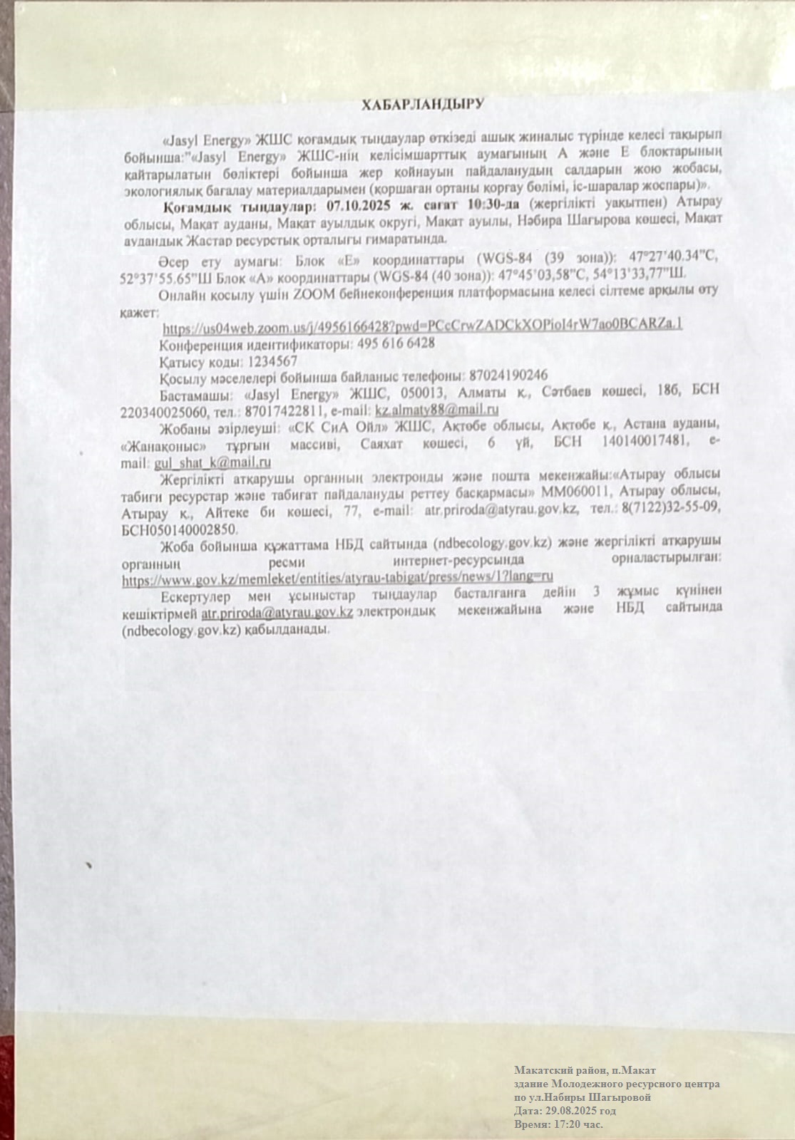 3. Общественные слушания организованны: Управление природных ресурсов и регулирования природопользования Атырауской области, atr.priroda@atyrau.gov.kz,