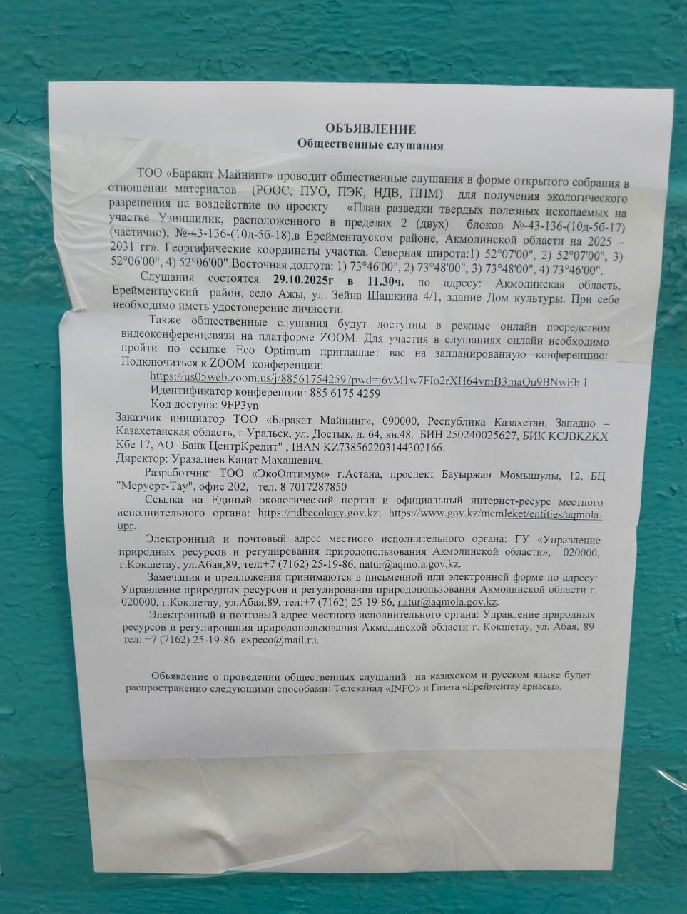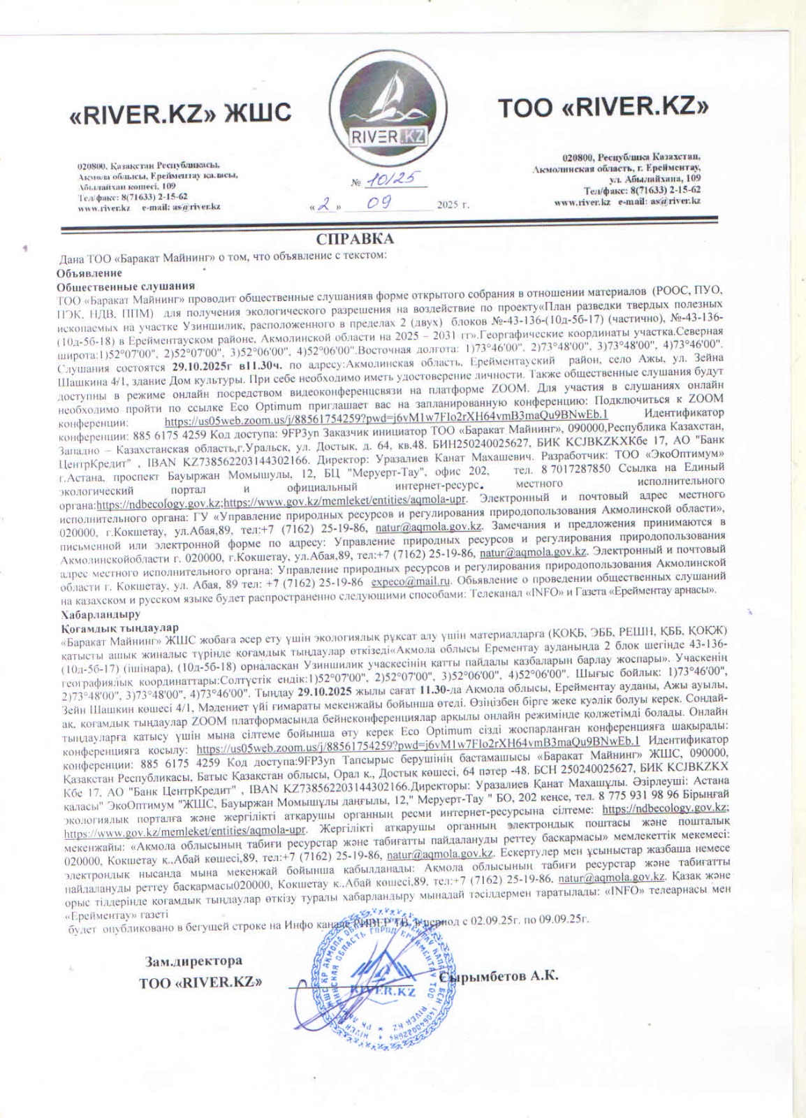 3. Общественные слушания организованны: Управление природных ресурсов и регулирования природопользования Акмолинской области, expeco@mail.ru,