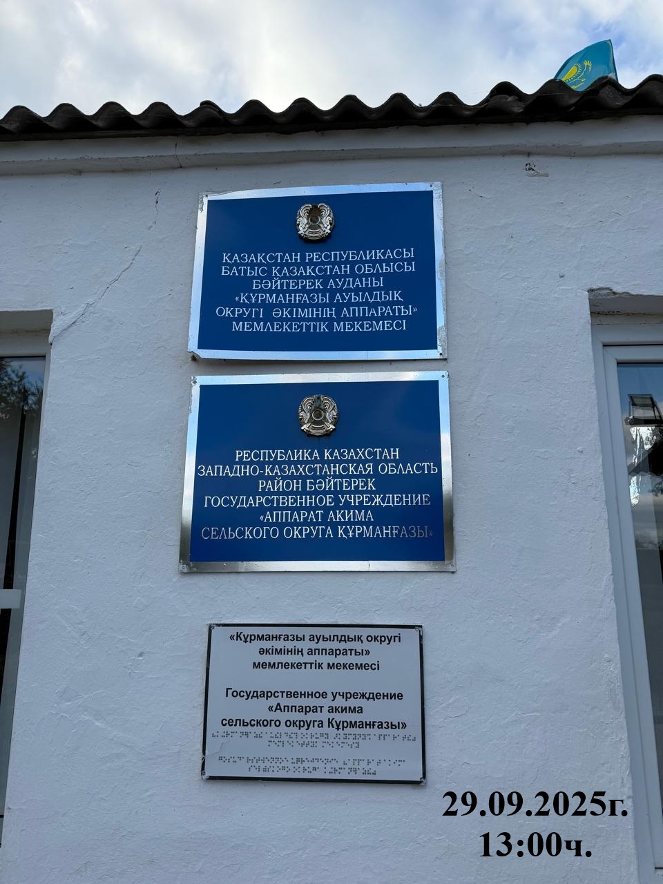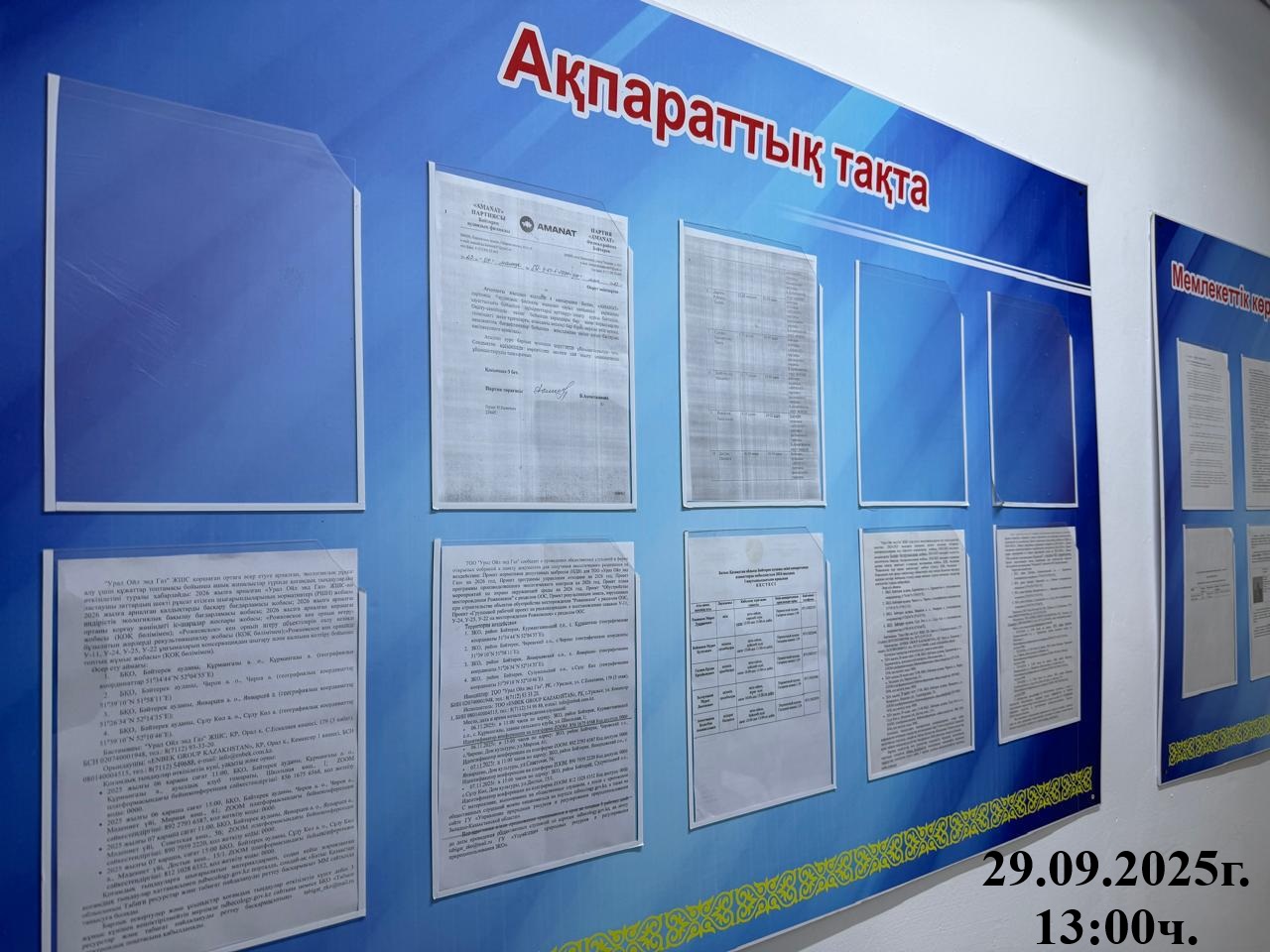6.3. расположение мест, специально предназначенных для Размещения печатных объявлений (доски объявлений): Западно-Казахстанская область, район Бәйтерек, Курмангазинский с.о. , ГУ "Аппарат акима Курмангазинского с.о."