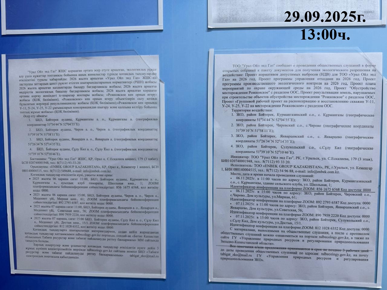 По проекту: Проект нормативов допустимых выбросов (НДВ) для ТОО «Урал Ойл энд Газ» на 2026 год, Проект программы управления отходами на 2026 год, Проект программы производственного экологического контроля на 2026 год, Проект плана мероприятий по охране окружающей среды на 2026 год, Проект "Обустройство месторождения Рожковское" с разделом ООС, Проект рекультивации земель, нарушаемых при строительстве объектов обустройства месторождения "Рожковское" с разделом ООС, Проект «Групповой рабочий проект на расконсервацию и восстановлению скважин У-11, У-24, У-25, У-22 на месторождении Рожковское» с разделом ООС.