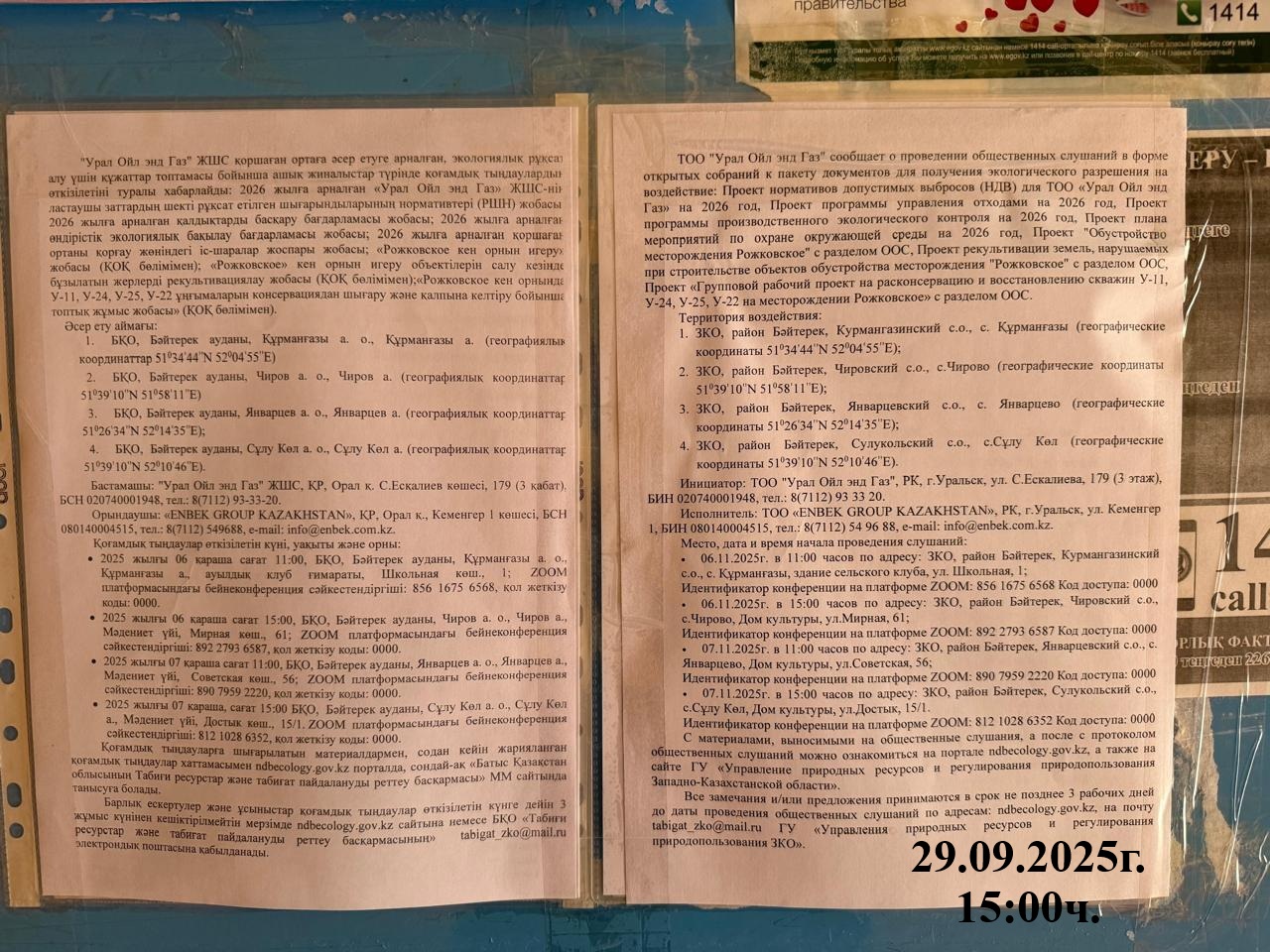 По проекту: Проект нормативов допустимых выбросов (НДВ) для ТОО «Урал Ойл энд Газ» на 2026 год, Проект программы управления отходами на 2026 год, Проект программы производственного экологического контроля на 2026 год, Проект плана мероприятий по охране окружающей среды на 2026 год, Проект "Обустройство месторождения Рожковское" с разделом ООС, Проект рекультивации земель, нарушаемых при строительстве объектов обустройства месторождения "Рожковское" с разделом ООС, Проект «Групповой рабочий проект на расконсервацию и восстановлению скважин У-11, У-24, У-25, У-22 на месторождении Рожковское» с разделом ООС.