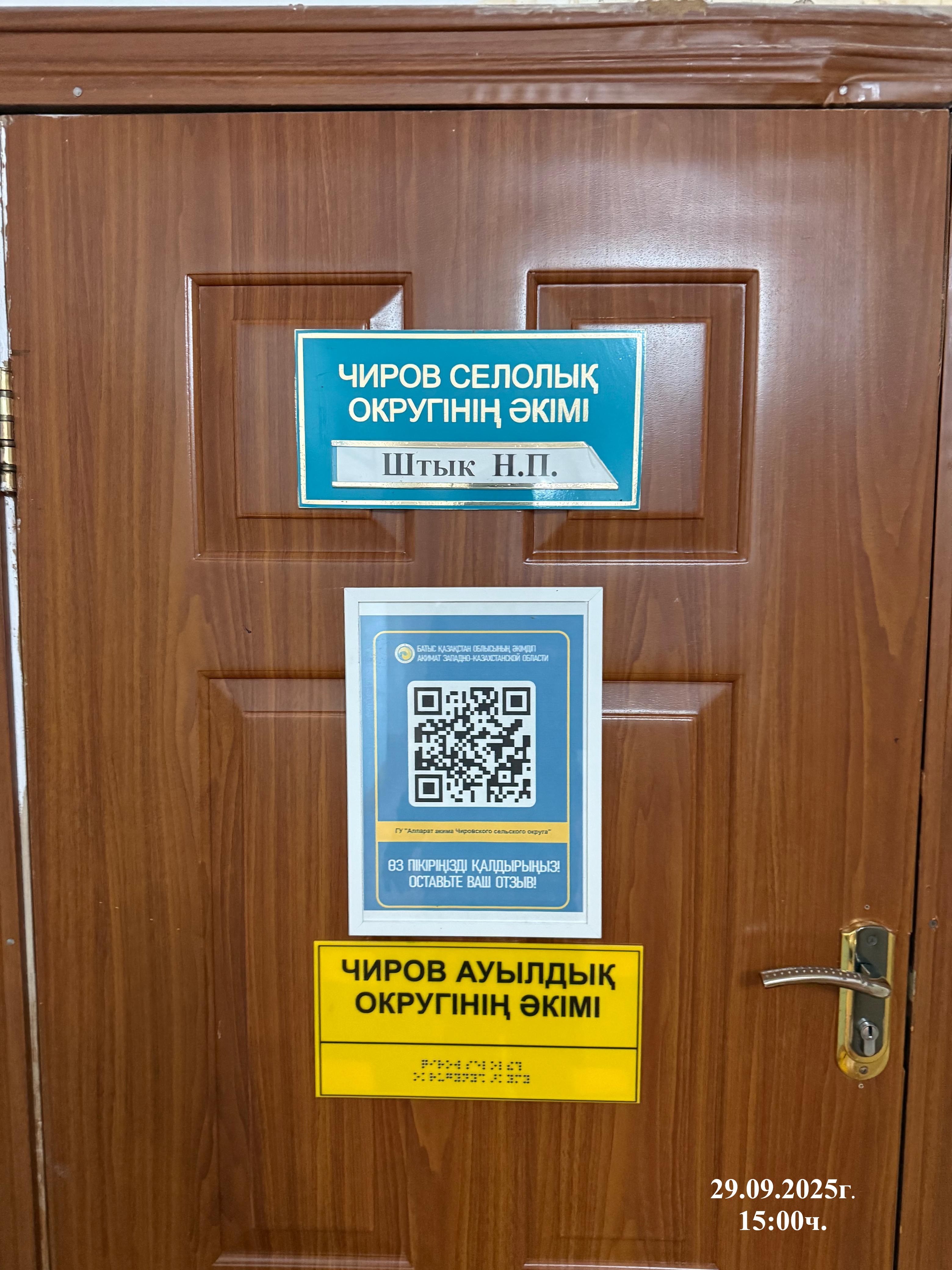 6.3. расположение мест, специально предназначенных для Размещения печатных объявлений (доски объявлений): Западно-Казахстанская область, район Бәйтерек, Чировский с.о., ГУ "Аппарат акима Чировского с.о."