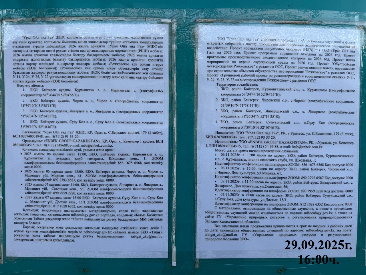 По проекту: Проект нормативов допустимых выбросов (НДВ) для ТОО «Урал Ойл энд Газ» на 2026 год, Проект программы управления отходами на 2026 год, Проект программы производственного экологического контроля на 2026 год, Проект плана мероприятий по охране окружающей среды на 2026 год, Проект "Обустройство месторождения Рожковское" с разделом ООС, Проект рекультивации земель, нарушаемых при строительстве объектов обустройства месторождения "Рожковское" с разделом ООС, Проект «Групповой рабочий проект на расконсервацию и восстановлению скважин У-11, У-24, У-25, У-22 на месторождении Рожковское» с разделом ООС.