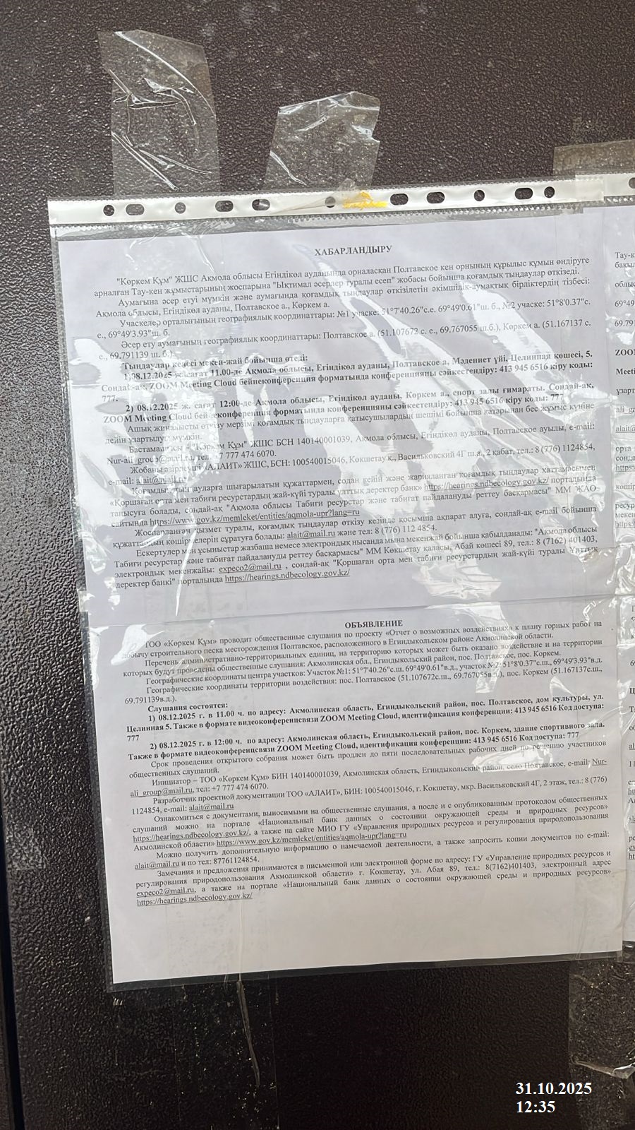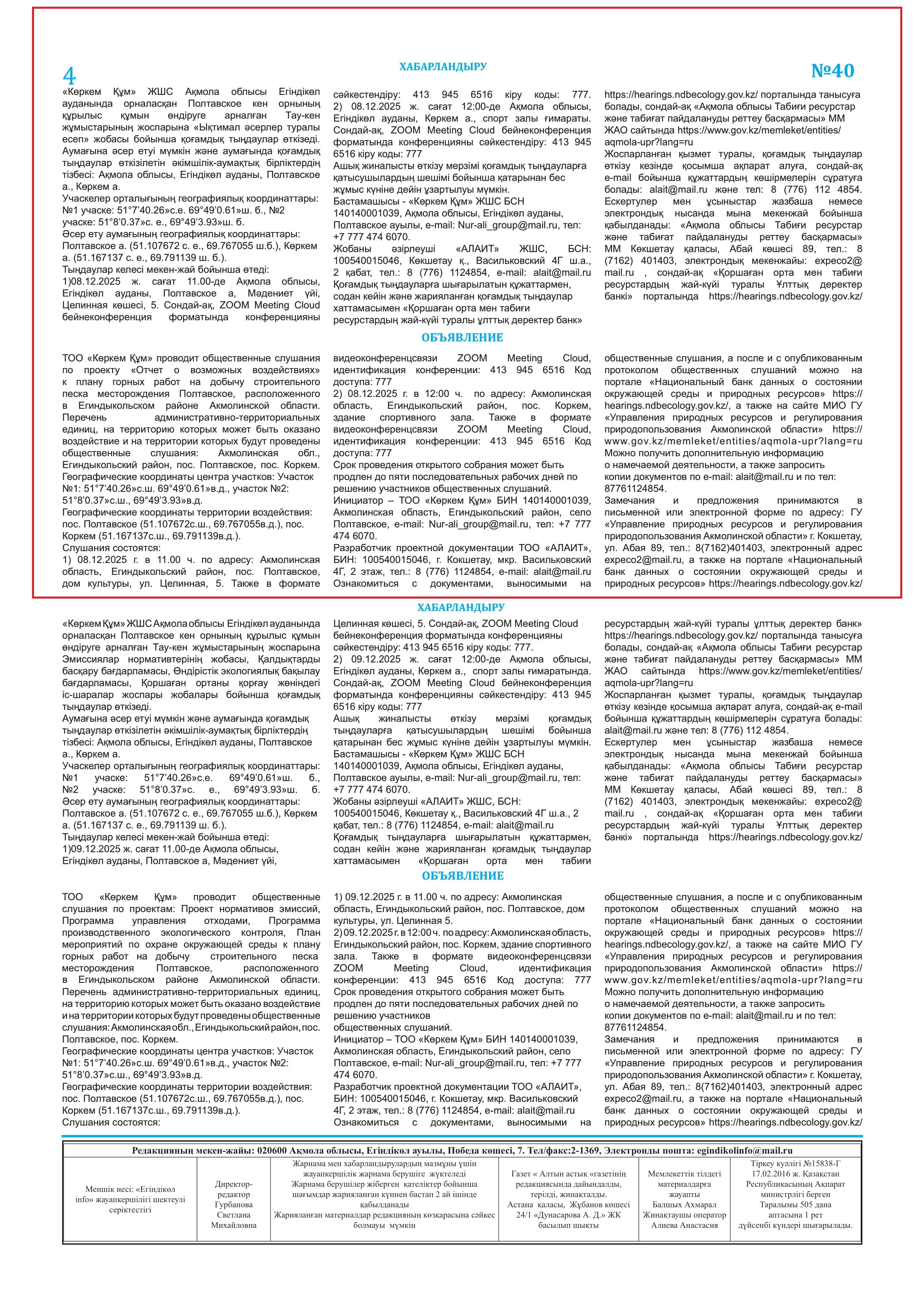 3. Общественные слушания организованны: Управление природных ресурсов и регулирования природопользования Акмолинской области, expeco@mail.ru,