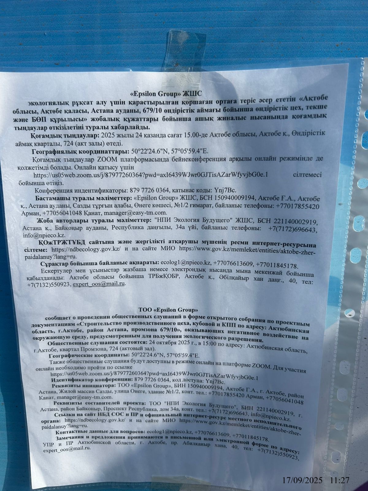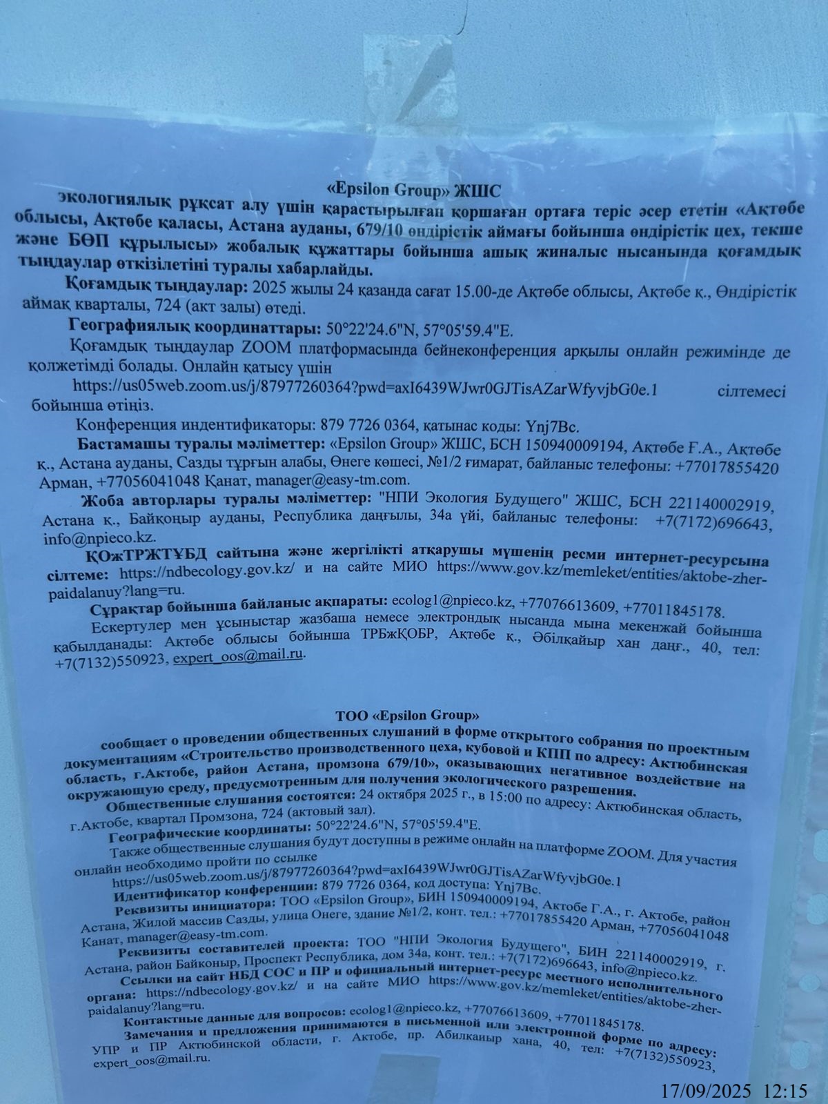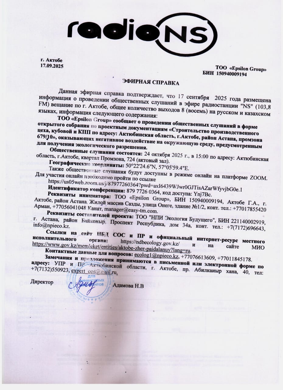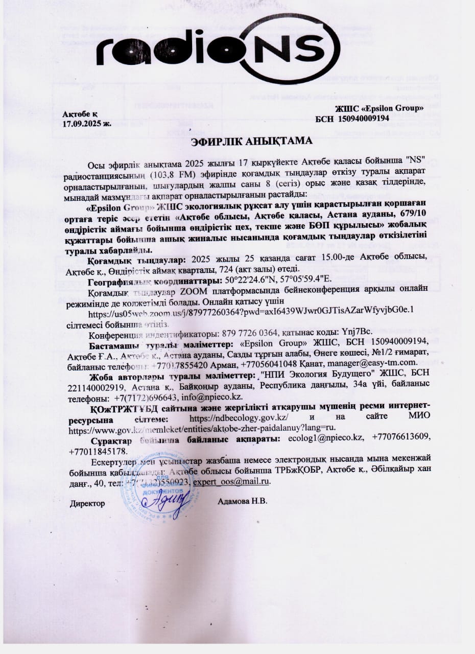 По проекту: ТОО "Epsilon Group" проводит общественные слушания по пакету документов предусмотренным для получения экологического разрешения для объектов I категории