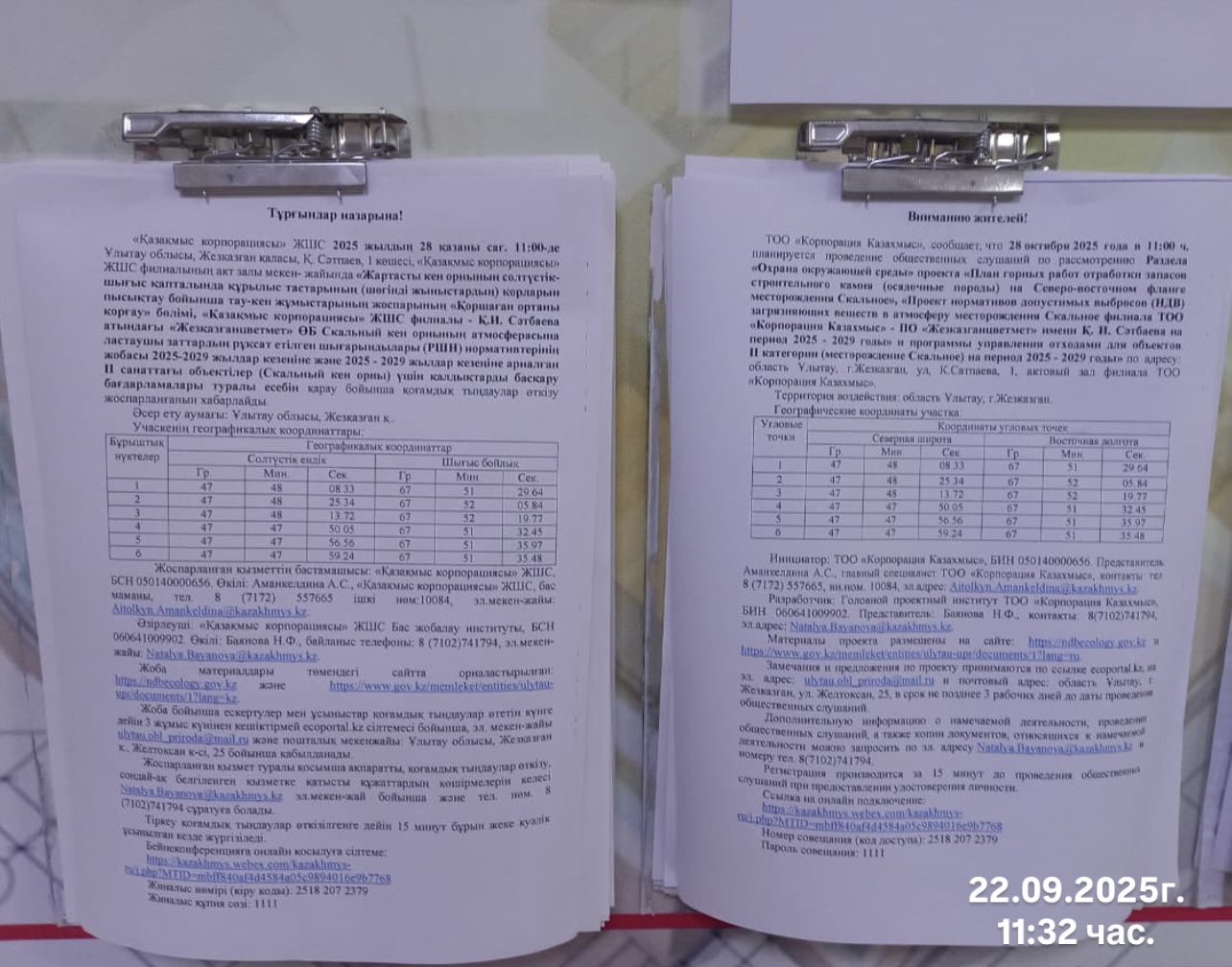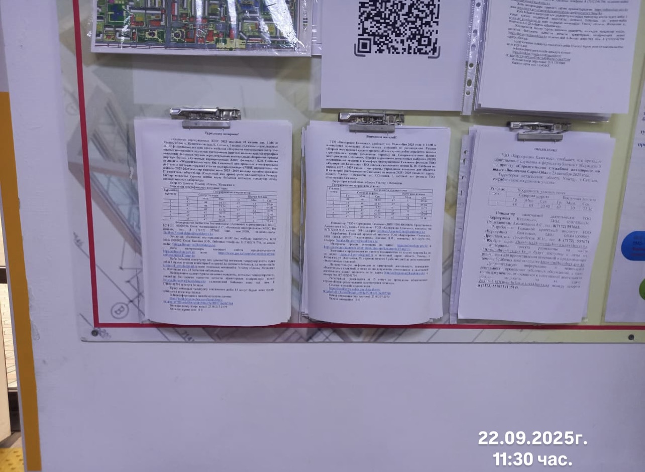 1.4. Описание для подключения к онлайн трансляции при прохождении общественного слушания: в соответствии с пп.4, п.11 прил. 3 Правил, информация о проведении общественных слушаний должна быть распространена на государственном и русском языках на досках объявлений местных исполнительных органов административно-территориальных единиц и в местах, специально предназначенных для размещения объявлений. В связи с чем необходимо дополнительно разместить печатные объявления на досках объявлений в акимате и в местах, специально предназначенных для размещения объявлений.
