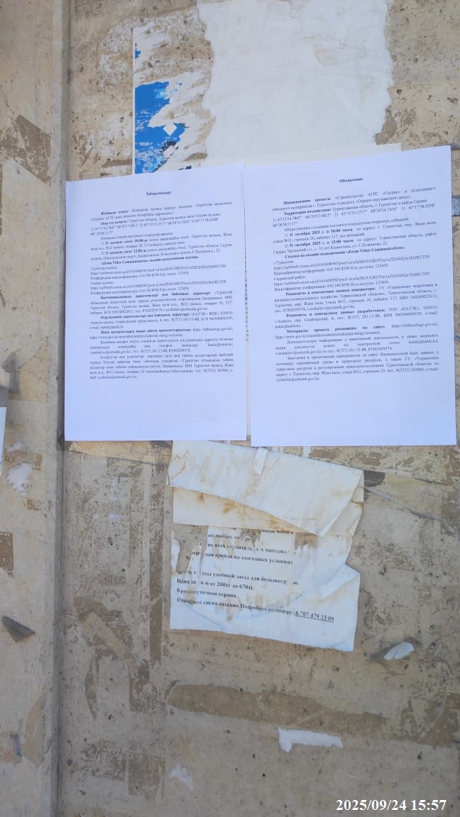 3. Общественные слушания организованны: Управление природных ресурсов и регулирования природопользования Туркестанской области, a.erkebai@ontustik.gov.kz,
