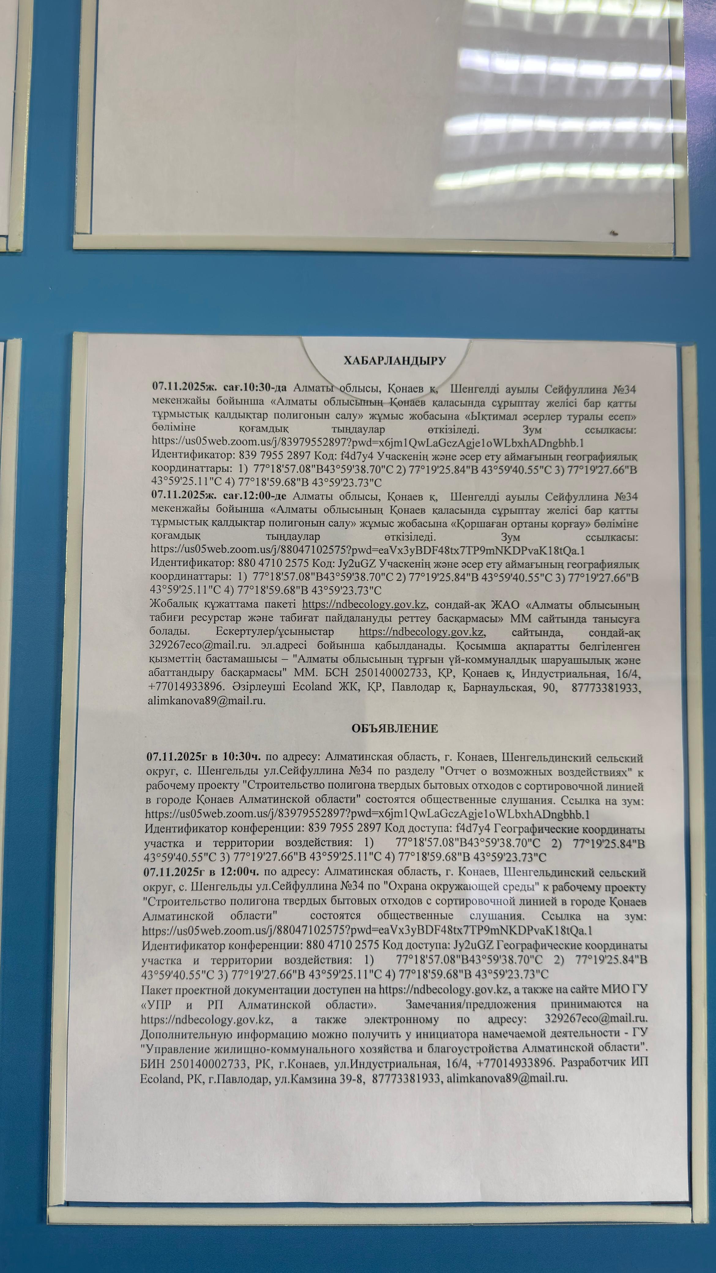 3. Общественные слушания организованны: Управление природных ресурсов и регулирования природопользования Алматинской области, 329267eco@mail.ru,