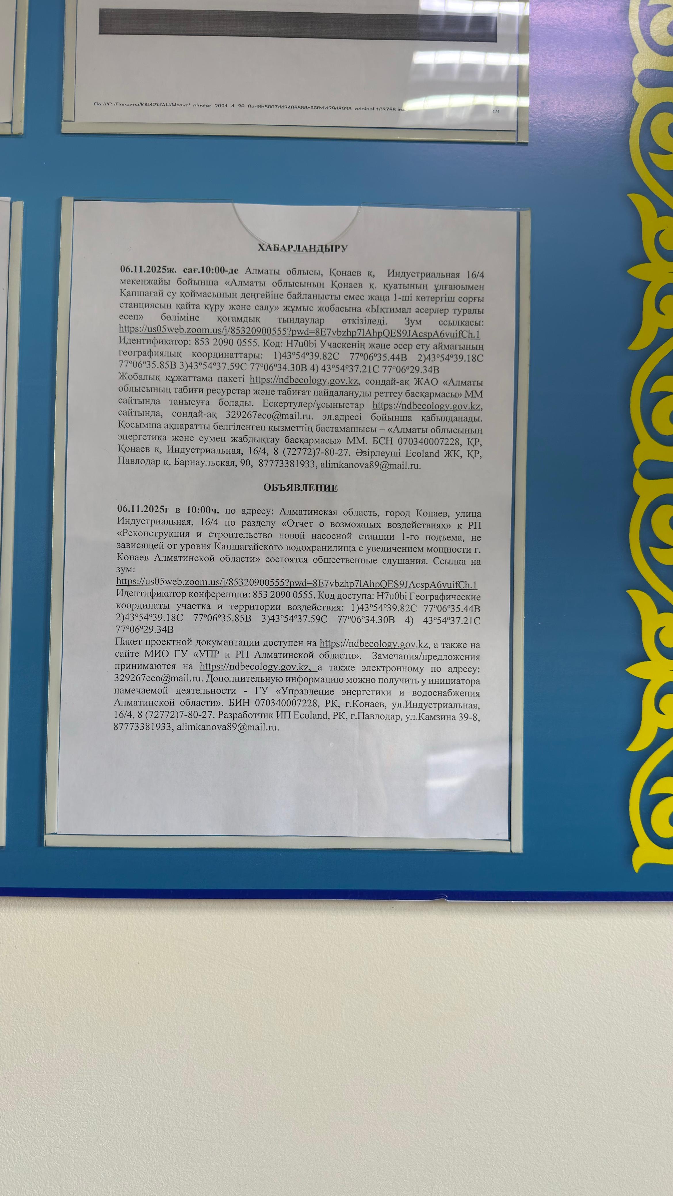 3. Общественные слушания организованны: Управление природных ресурсов и регулирования природопользования Алматинской области, 329267eco@mail.ru,