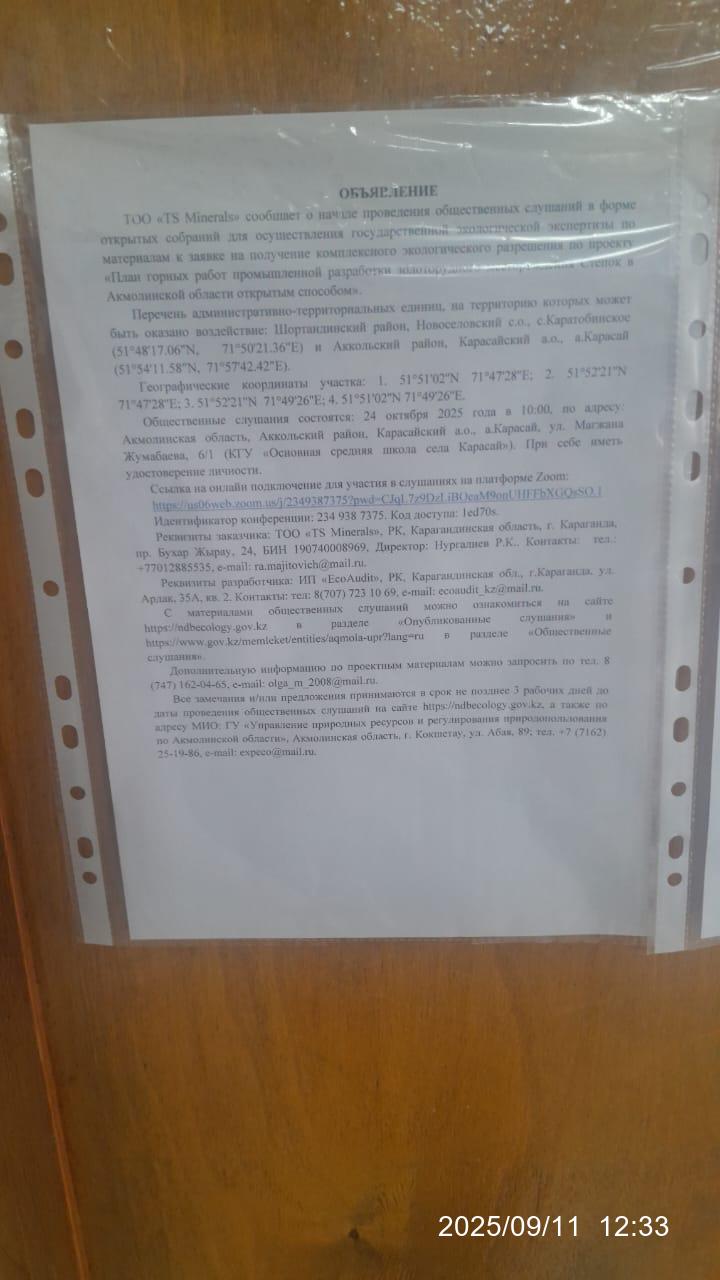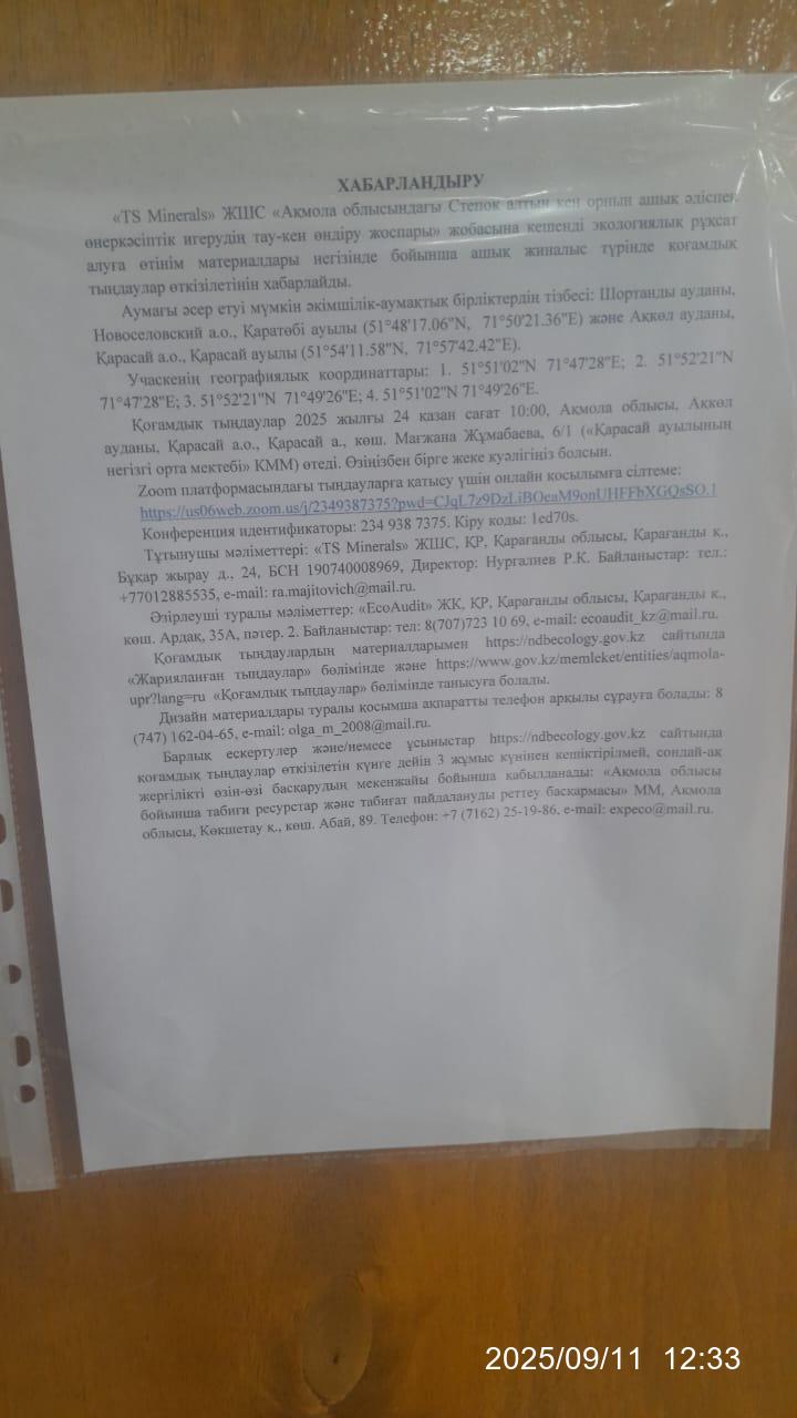 1.2. Место проведения: Акмолинская область, Аккольский район, Карасайский а.о., а.Карасай, ул. Магжана Жумабаева, 6/1 (КГУ "Основная средняя школа села Карасай"). Ссылка на онлайн подключение для участия в слушаниях на платформе Zoom: https://us06web.zoom.us/j/2349387375?pwd=CJqL7z9DzLiBOeaM9onUHFFbXGQsSO.1 Идентификатор конференции: 234 938 7375. Код доступа: 1ed70s