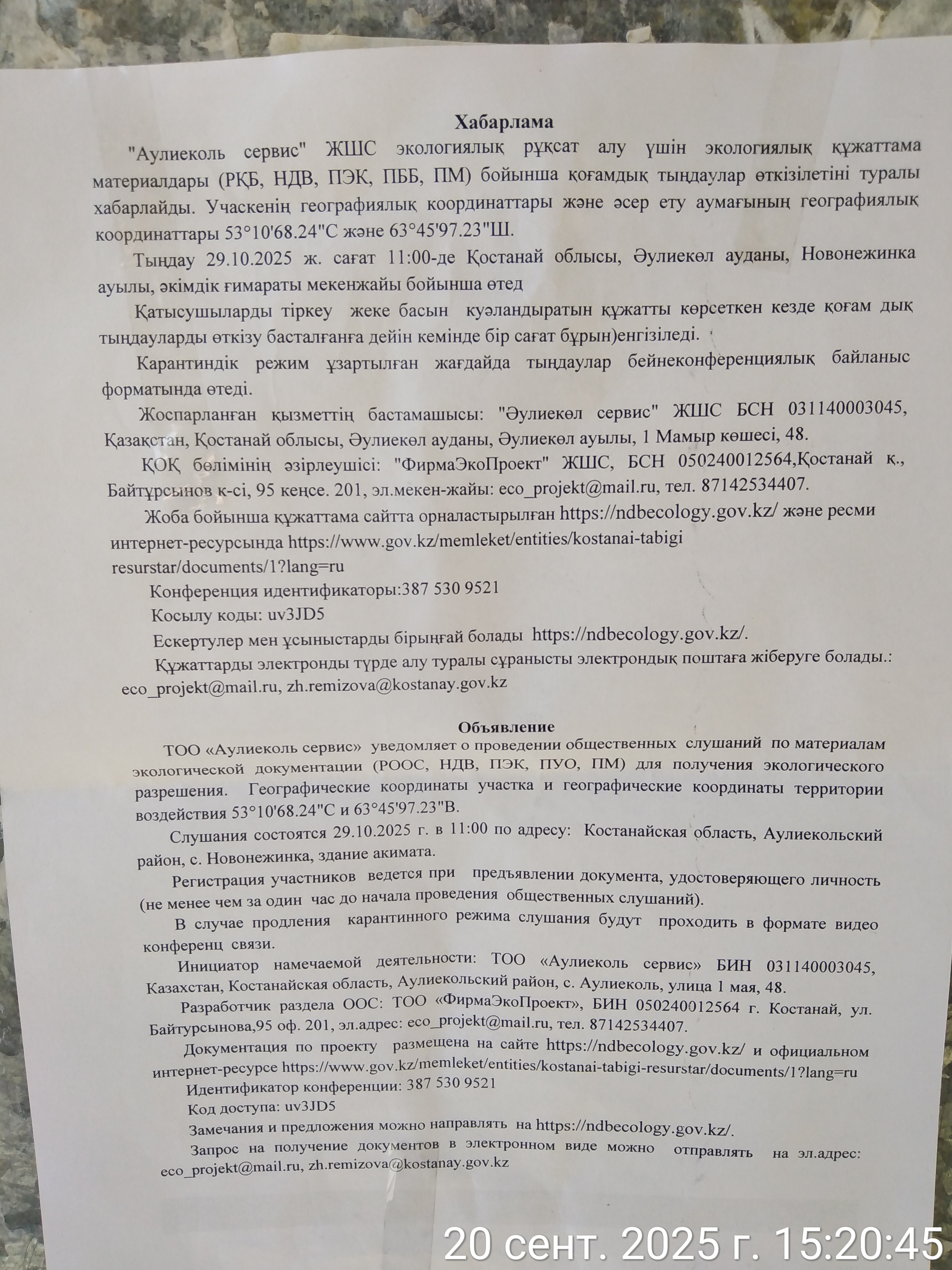6. Объявление о проведении общественных слушаний на казахском и русском языках будет распространено следующими способами: