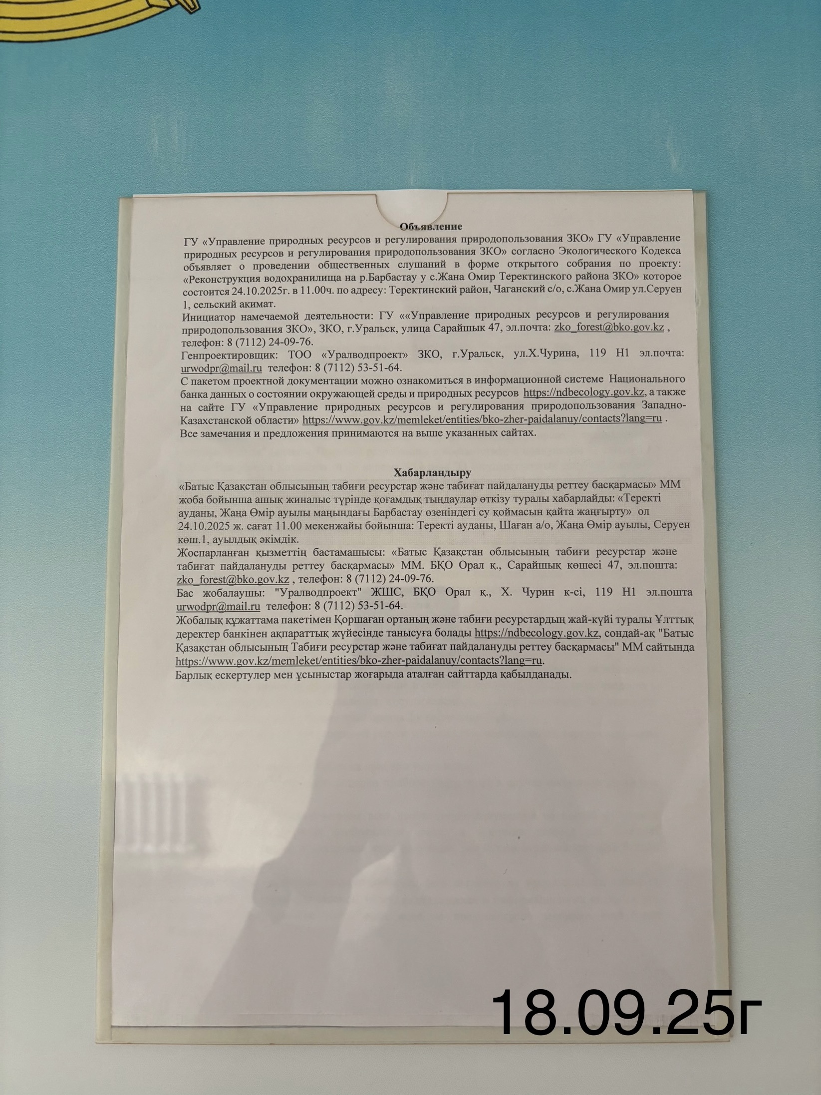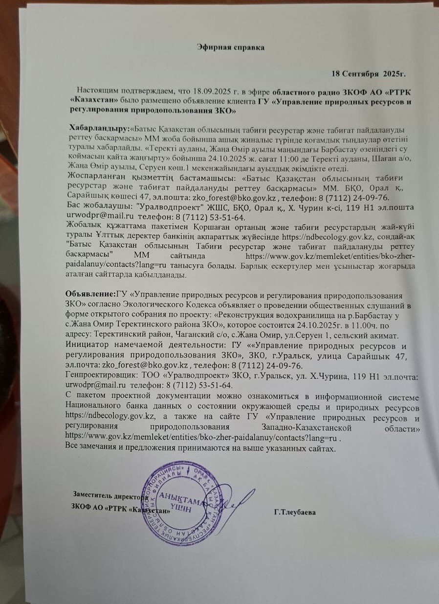 3. Общественные слушания организованны: Управление природных ресурсов и регулирования природопользования Западно-Казахстанской области, zko_forest@bko.gov.kz,