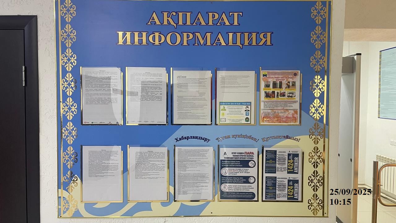 6.3. расположение мест, специально предназначенных для Размещения печатных объявлений (доски объявлений): Информационная доска в здании ГУ Аппарата акима поселка Зачаганск, ул. 25-й Чапаевской дивизии, 2.