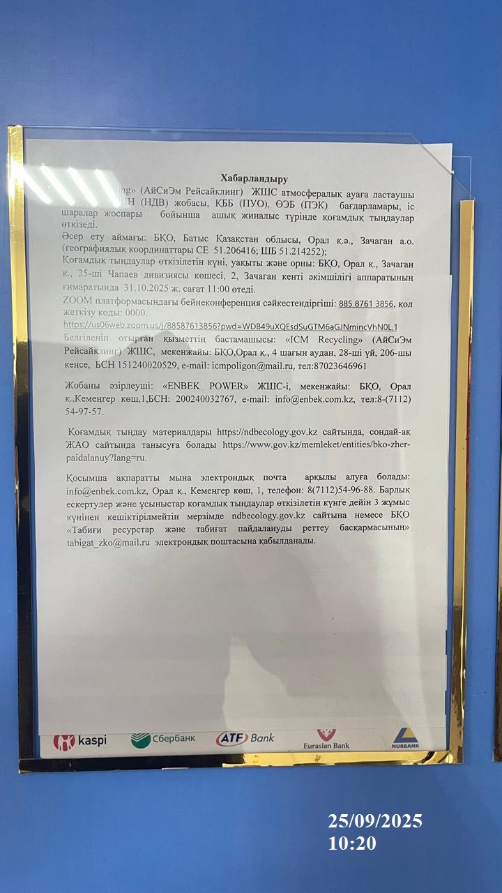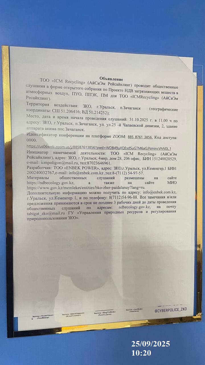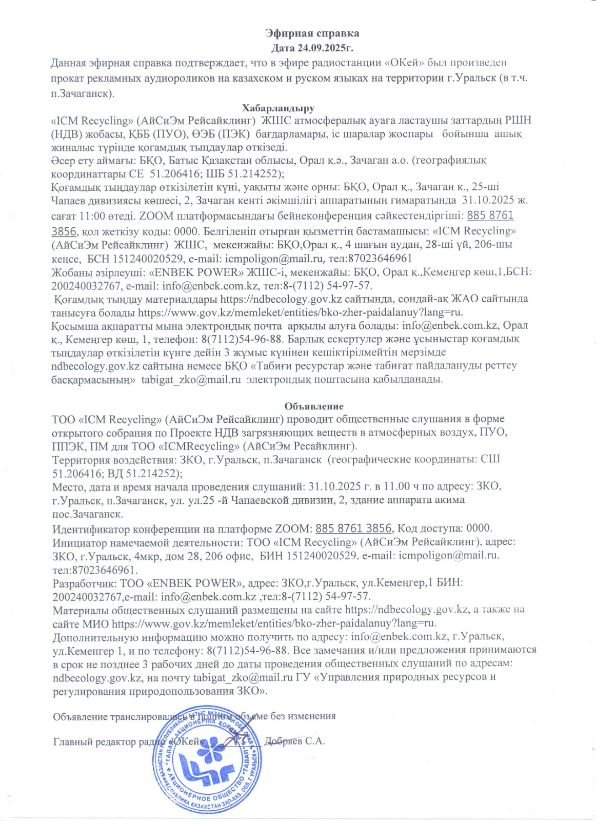 4. Повестка дня общественных слушаний: Настоящим проектом устанавливаются нормативы допустимых выбросов загрязняющих веществ в атмосферу (далее – проект НДВ) для ТОО «ICM Recycling» (АйСиЭм Рейсайклинг), на территории района г.Уральск Западно-Казахстанской области Республики Казахстан. Данная разработка Проекта нормативов допустимых выбросов загрязняющих ве ществ в окружающую среду для ТОО «ICM Recycling» (АйСиЭм Рейсайклинг) (далее Проект НДВ) выполнена на основе материалов действующего Проекта нормативов предельно-допустимых выбросов загрязняющих веществ для ТОО «ICM Recycling» (АйСиЭм Рейсайклинг) на 2021 – 2025 гг. и проведенной инвентаризации источников выбросов загрязняющих веществ в апреле 2025 года. Разработка Проекта НДВ осуществляется в связи с необходимостью получения экологического разрешения на воздействие ТОО «ICM Recycling» (АйСиЭм Рейсайклинг) на 2026 – 2029гг (в связи с истечением срока действия разрешения №: KZ27VCZ00749424 к концу 2025 года). Проект выполнен в соответствии с действующими законодательными и нормативно-методическими документами РК, регулирующими вопросы охраны окружающей среды и экологической безопасности. Проект выполнен в соответствии с действующими законодательными и нормативно-методическими документами РК, регулирующими вопросы охраны окружающей среды и экологической безопасности. Основой для разработки проекта НДВ явились результаты инвентаризации выбросов загрязняющих веществ в атмосферу (Приложение 1). По результатам проведенной инвентаризации, являющейся первым этапом разработки НДВ, установлены источники выбросов предприятия, перечень вредных веществ подлежащих нормированию, а также определен качественный и количественный состав выбросов в атмосферу. Вторым этапом является определение нормативов предельно-допустимых выбросов (ПДВ) по каждому источнику и ингредиенту и для предприятия в целом с учетом перспективной деятельности - расширения предприятия. На территории полигона ТБО выделено: • на существующее положение- 1 неорганизованный источник; • на 2026-2029 гг - 4 неорганизованных источников. Всего в атмосферу поступает 13 ингредиентов загрязняющих веществ, подлежащих нормированию, из которых 5 веществ обладают эффектом суммарного вредного воздействия (6 групп суммаций). Объем выбросов в целом по ТОО «ICM Recycling» (АйСиЭм Рейсайклинг)составит: На 2026 г- 5299,6582 т/год; 2027г-5379,145448 т/год; 2028 г- 5459,8249 т/год; 2029г- 5541,715 т/год. Ежегодное увеличение норматива допустимых выбросов на полигоне ТБО обусловлено спецификой его работы, а именно захоронением отходов и анаэробным разложением, в результате которого выделяется биогаз. Увеличение выбросов с каждым годом связано с методикой расчета, учитывающей отходы, размещенные за последние 20 лет. Расчетные максимально разовые концентрации загрязняющих веществ, создаваемые источниками на площадках ТОО «ICM Recycling» (АйСиЭм Рейсайклинг) в приземном слое атмосферного воздуха не превышает соответствующие гигиенические нормативы на границе СЗЗ площадок предприятия и в жилой зоне, поэтому согласно п.8 гл.2 «Методики определения нормативов эмиссий в окружающую среду, утвержденную Приказом Министра экологии, геологии и природных ресурсов РК №63 от 10 марта 2021 года нормативы эмиссий для предприятия установлены на уровне, предусмотренными технологическими регламентами и предлагают