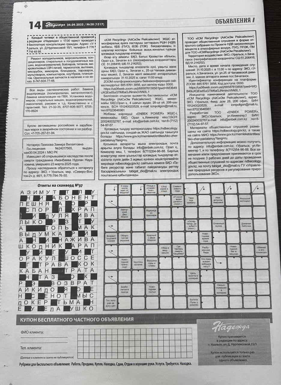 3. Общественные слушания организованны: Управление природных ресурсов и регулирования природопользования Западно-Казахстанской области, zko_forest@bko.gov.kz,