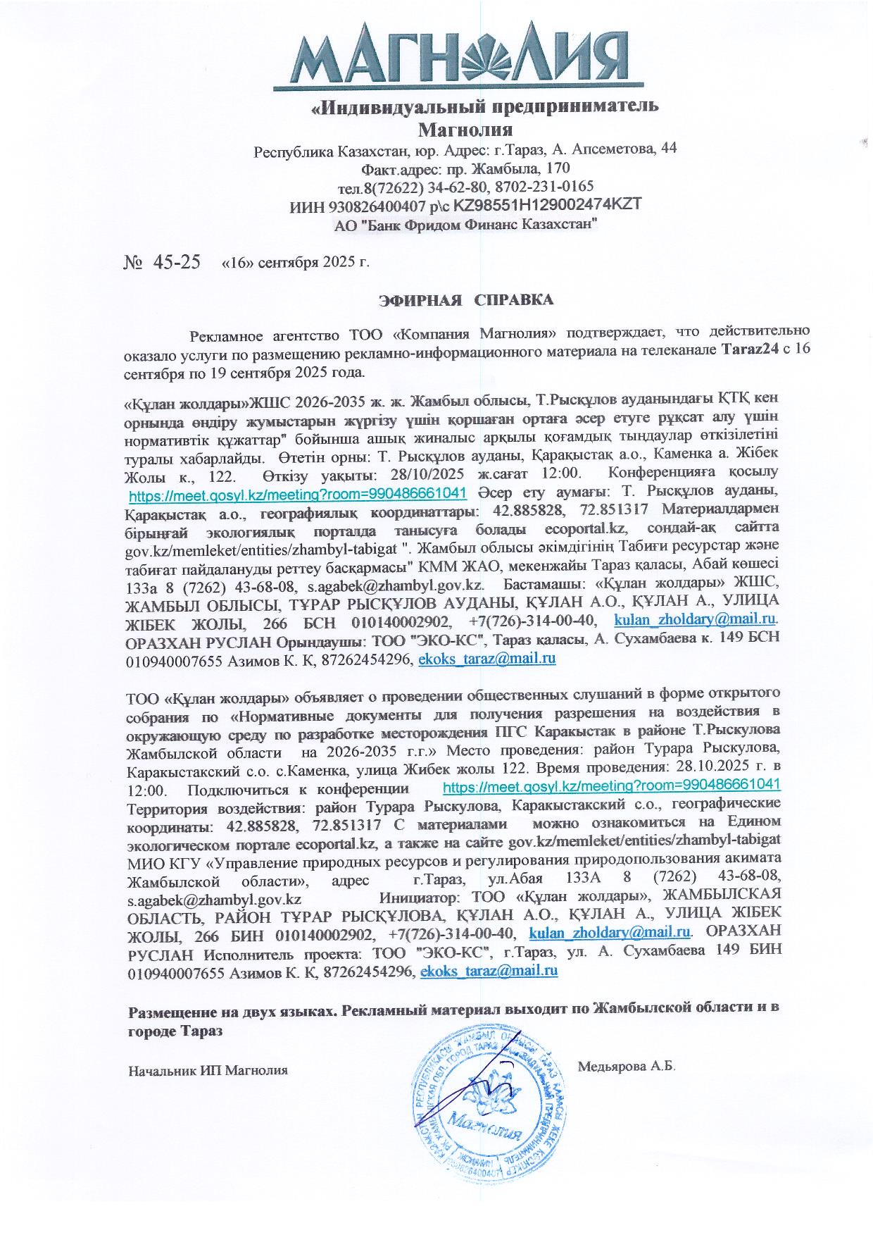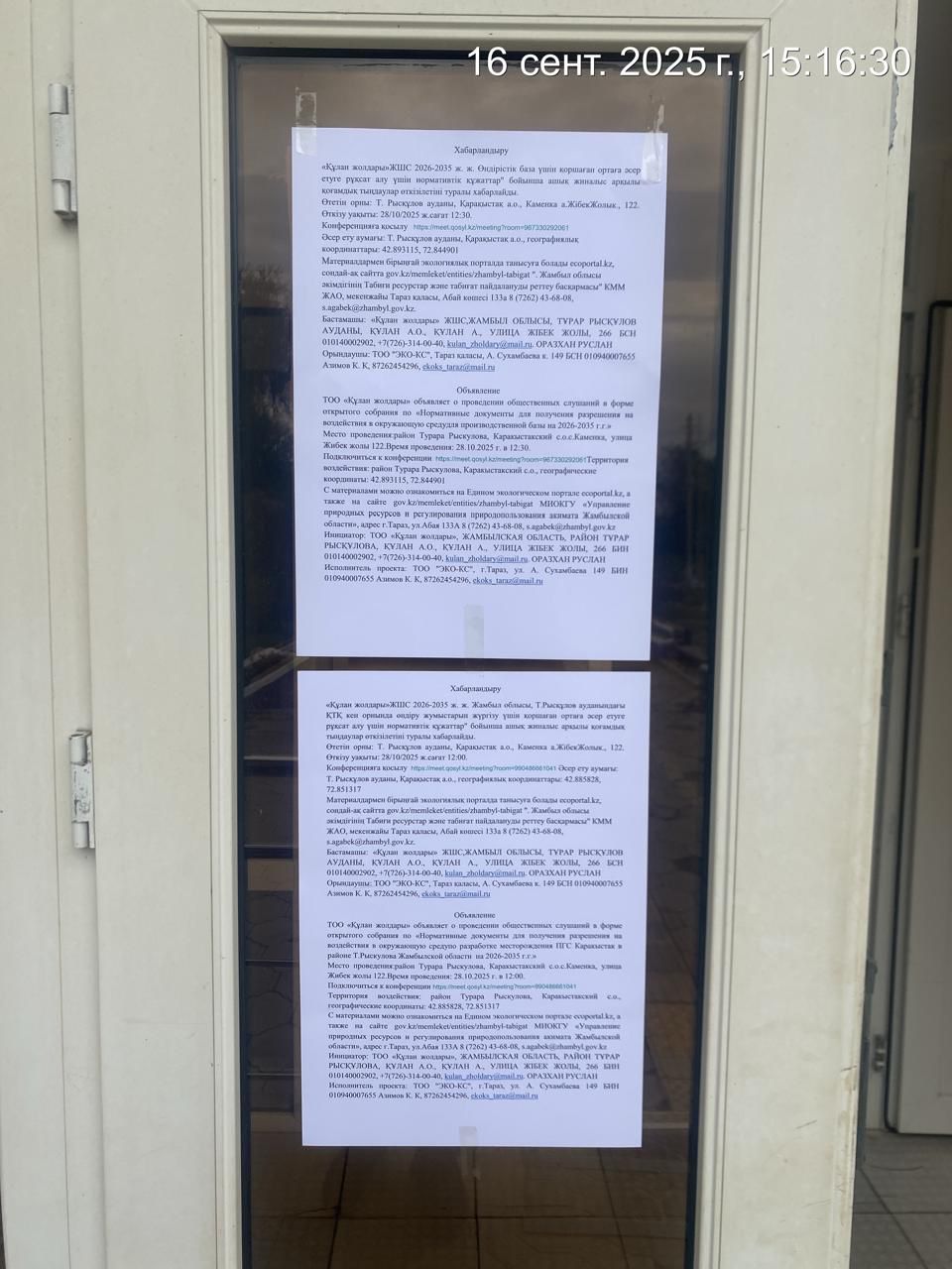 3. Общественные слушания организованны: Управление природных ресурсов и регулирования природопользования Жамбылской области, s.agabek@zhambyl.gov.kz,