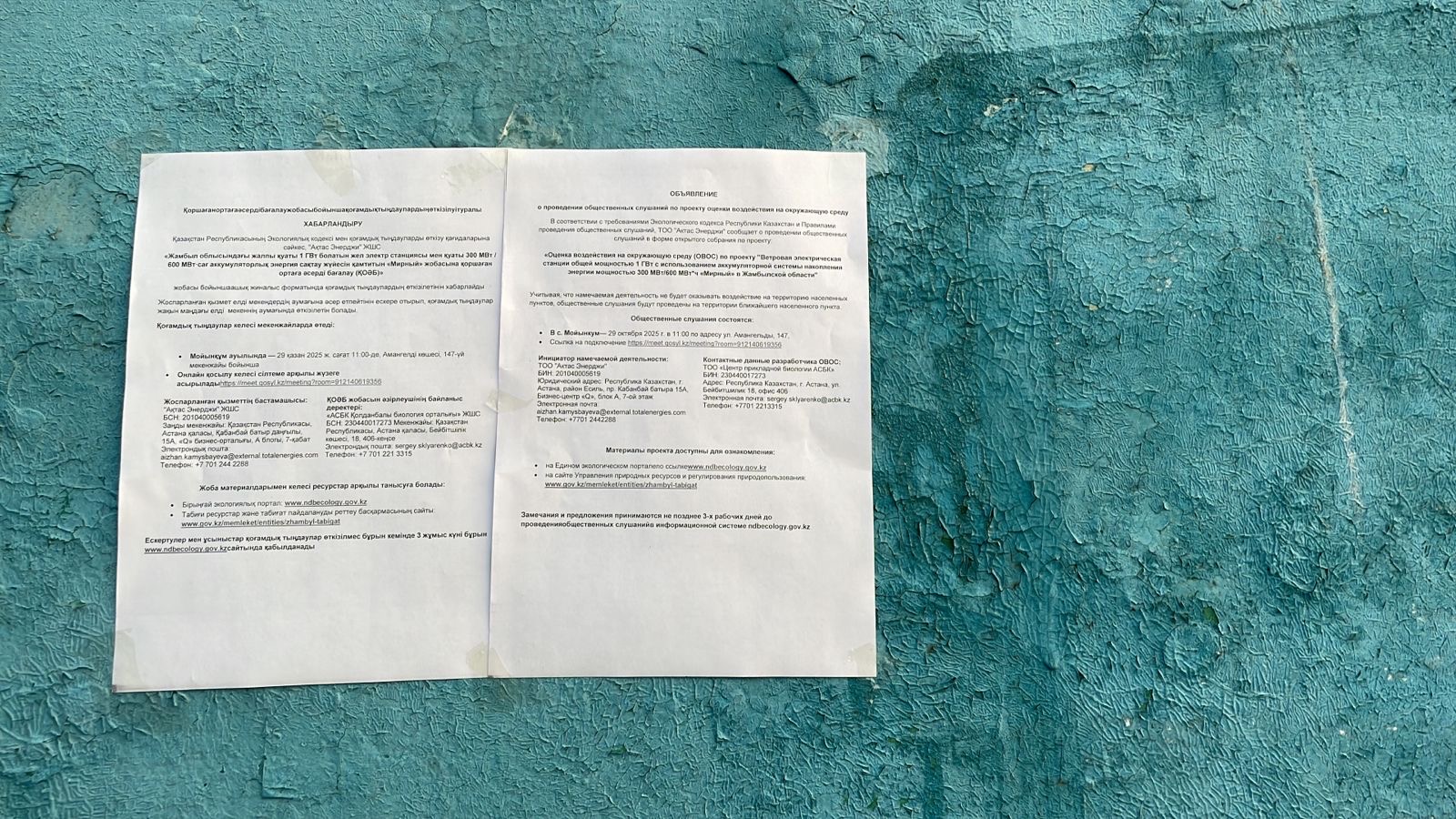 4. Повестка дня общественных слушаний: Проектом предусматривается строительство и эксплуатация следующих объектов: 1. Ветровая электрическая станция общей мощностью 1 ГВт (ветровой парк с инфраструктурой); 2. ПС 500 кВ Северная Мирный и ПС 500 кВ Южная Мирный ; 3 Система накопления энергии (СНЭ) 300 МВт/600 МВт ; 4. Воздушные линии электропередачи (ВЛ) 500 кВ (ВЛ 500 кВ ПС "Южная Мирный" - ПС "Шу", ВЛ 500 кВ ПС "Северная Мирный" - ПС "Улкен", ВЛ 500 кВ ПС "Cеверная Мирный" -ПС "Южная Мирный"); 5. Вахтовый лагерь; 6. Реконструкция ПС 500кВ Улкен; 7. Реконструкция ПС 500кВ Шу. Проект направлен на реализацию политики Республики Казахстан по борьбе с глобальным потеплением и достижению углеродной нейтральности к 2060 году и обеспечит ежегодное сокращение выбросов углекислого газа (CO₂) как минимум на 2 миллиона тонн, развитие возобновляемых источников энергии и укрепление национального энергобаланса. Указанные объекты будут обеспечивать производство электроэнергии из возобновляемых источников энергии в течение 25 лет.