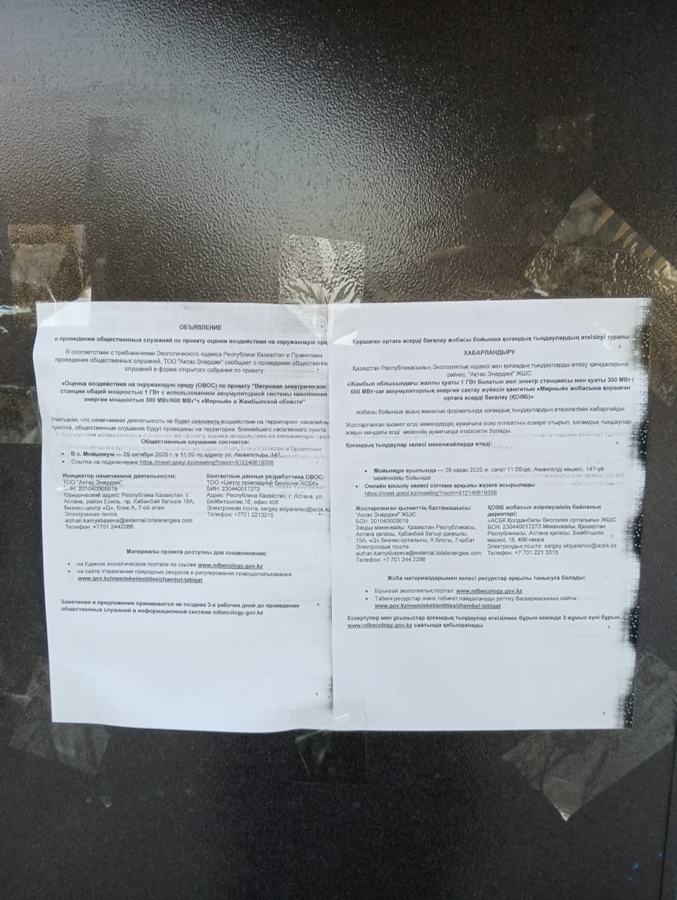 6. Объявление о проведении общественных слушаний на казахском и русском языках будет распространено следующими способами: