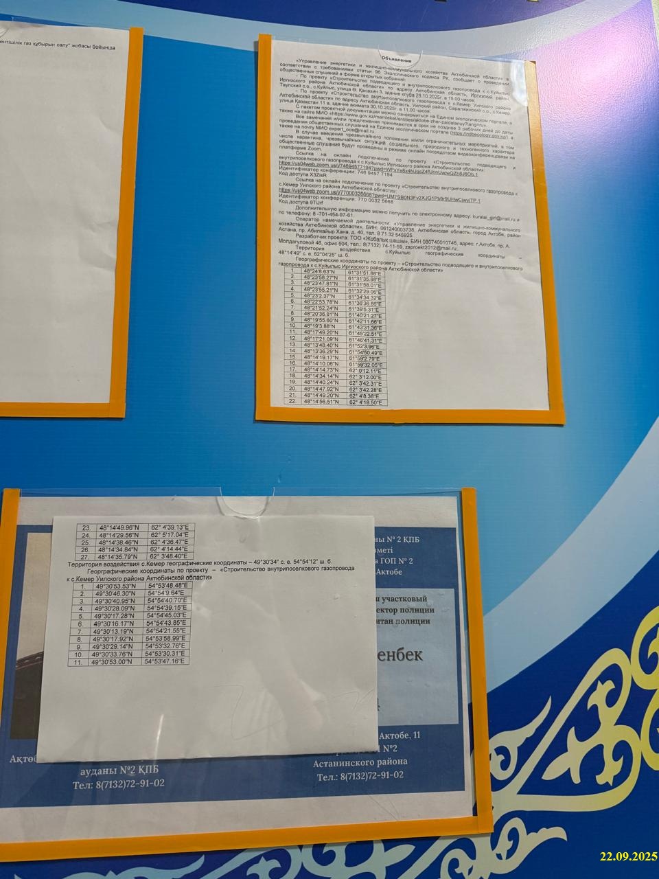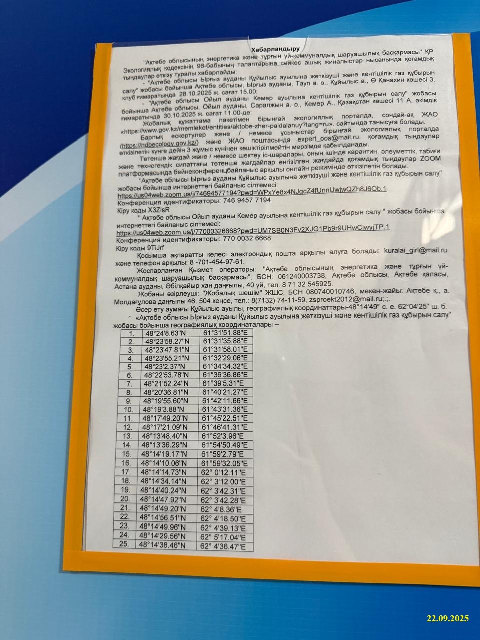 4. Повестка дня общественных слушаний: Строительство внутрипоселкового газопровода к с.Кемер Уилского района Актюбинской области Ссылка приглашения https://us04web.zoom.us/j/77000326668?pwd=UM7SB0N3Fv2XJG1Pb9r9UHwCjwyjTP.1 Идентификатор конференции 770 0032 6668 Код доступа 9TiJrf