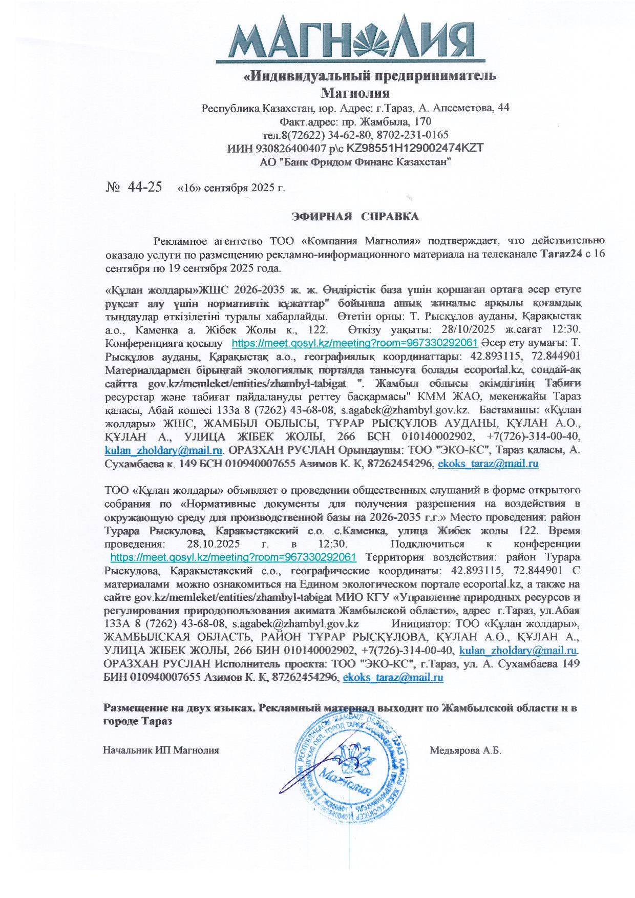 3. Общественные слушания организованны: Управление природных ресурсов и регулирования природопользования Жамбылской области, s.agabek@zhambyl.gov.kz,