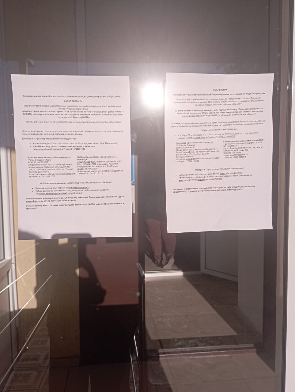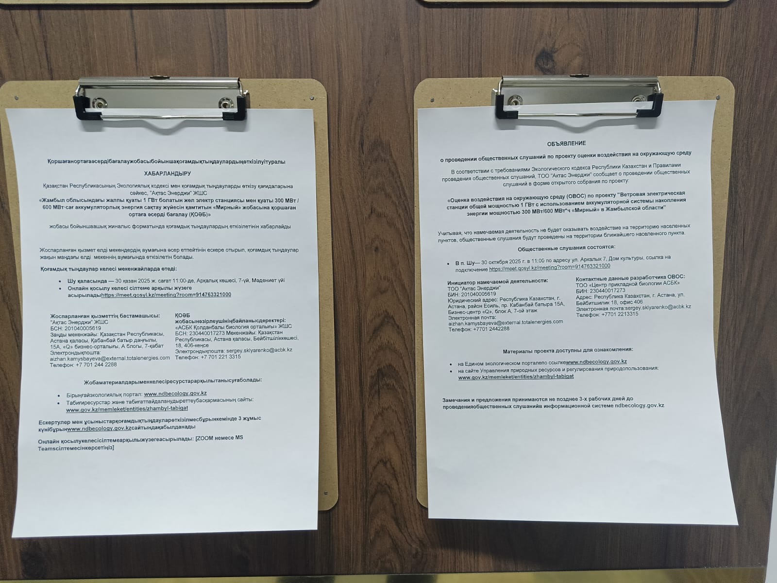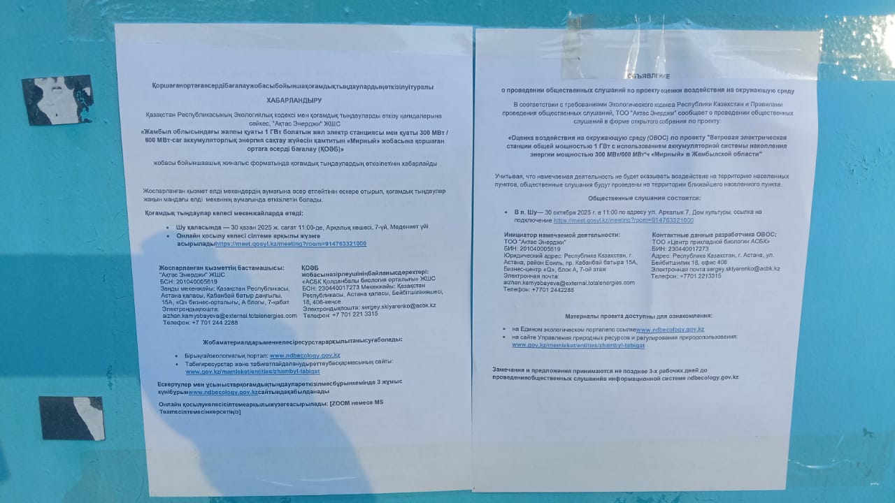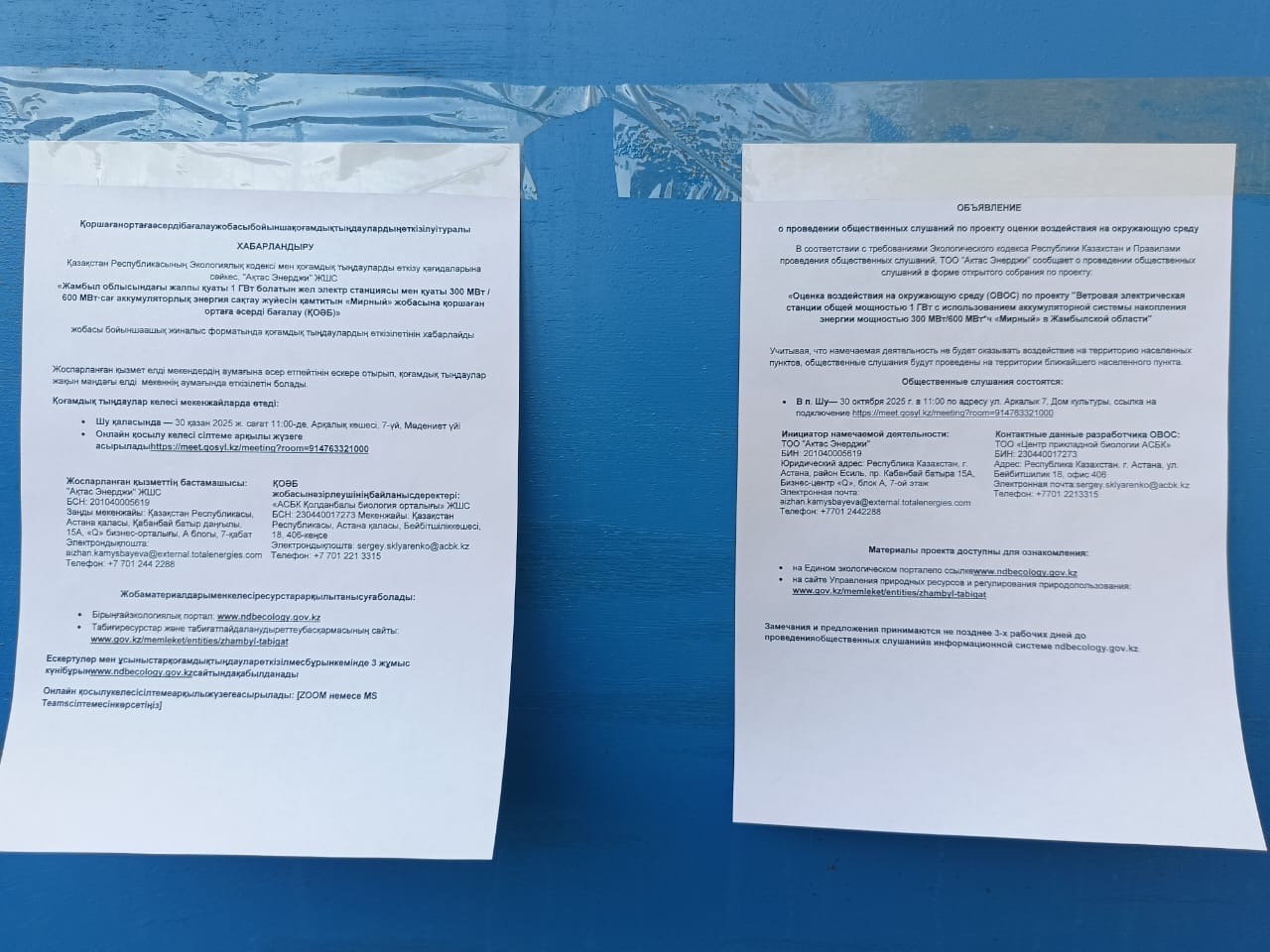 4. Повестка дня общественных слушаний: Проектом предусматривается строительство и эксплуатация следующих объектов: 1. Ветровая электрическая станция общей мощностью 1 ГВт (ветровой парк с инфраструктурой); 2. ПС 500 кВ Северная Мирный и ПС 500 кВ Южная Мирный ; 3 Система накопления энергии (СНЭ) 300 МВт/600 МВт ; 4. Воздушные линии электропередачи (ВЛ) 500 кВ (ВЛ 500 кВ ПС "Южная Мирный" - ПС "Шу", ВЛ 500 кВ ПС "Северная Мирный" - ПС "Улкен", ВЛ 500 кВ ПС "Cеверная Мирный" -ПС "Южная Мирный"); 5. Вахтовый лагерь; 6. Реконструкция ПС 500кВ Улкен; 7. Реконструкция ПС 500кВ Шу. Проект направлен на реализацию политики Республики Казахстан по борьбе с глобальным потеплением и достижению углеродной нейтральности к 2060 году и обеспечит ежегодное сокращение выбросов углекислого газа (CO₂) как минимум на 2 миллиона тонн, развитие возобновляемых источников энергии и укрепление национального энергобаланса. Указанные объекты будут обеспечивать производство электроэнергии из возобновляемых источников энергии в течение 25 лет.