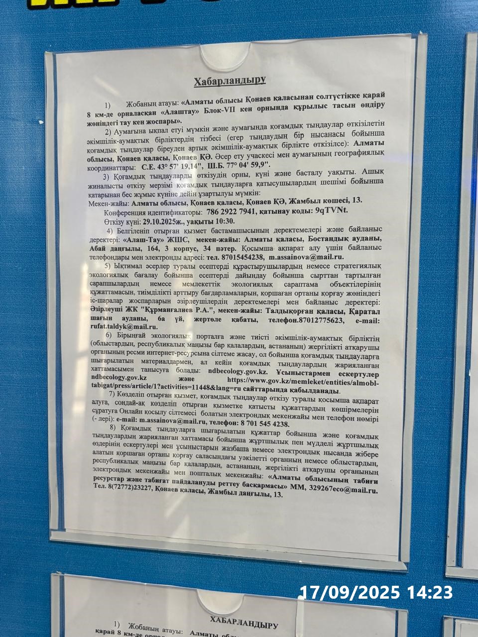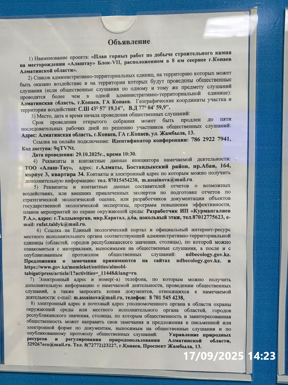 3. Общественные слушания организованны: Управление природных ресурсов и регулирования природопользования Алматинской области, 329267eco@mail.ru,