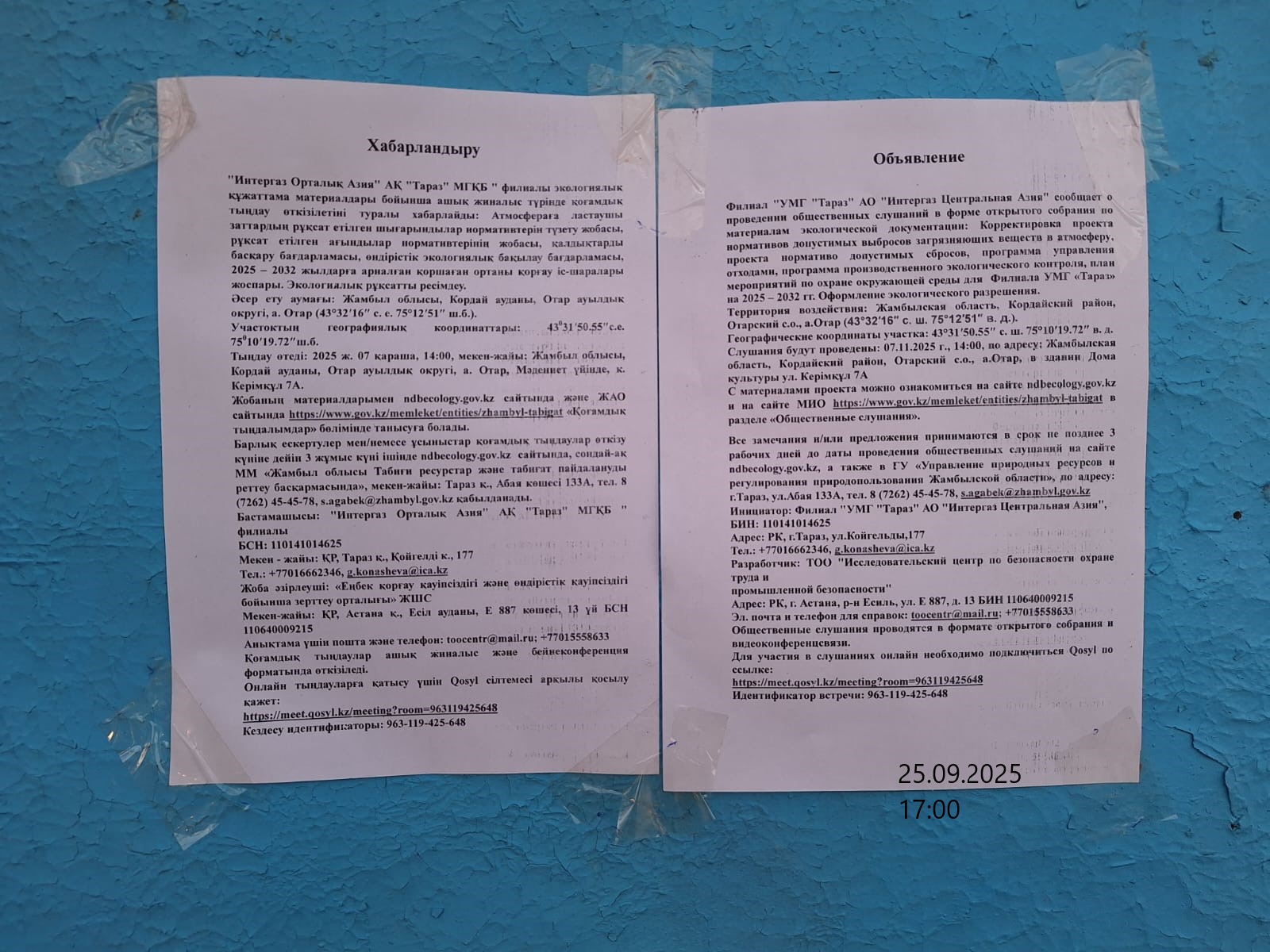 1.4. Описание для подключения к онлайн трансляции при прохождении общественного слушания: Приглашение на запланированную встречу в Qosyl Тема встречи: Проектные документы на получение экологического разрешение на воздействия для Филиала "УМГ "Тараз" АО "Интергаз Центральная Азия" Время встречи: 07.11.2025 14:00 Длительность встречи: 1 час. Идентификатор встречи: 963-119-425-648 Подключиться к встрече в Qosyl: https://meet.qosyl.kz/meeting?room=963119425648