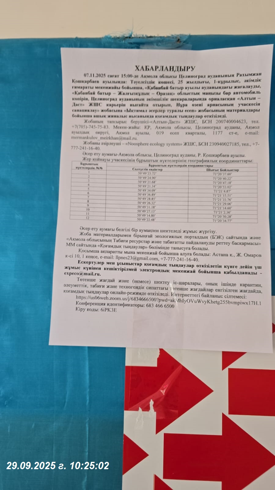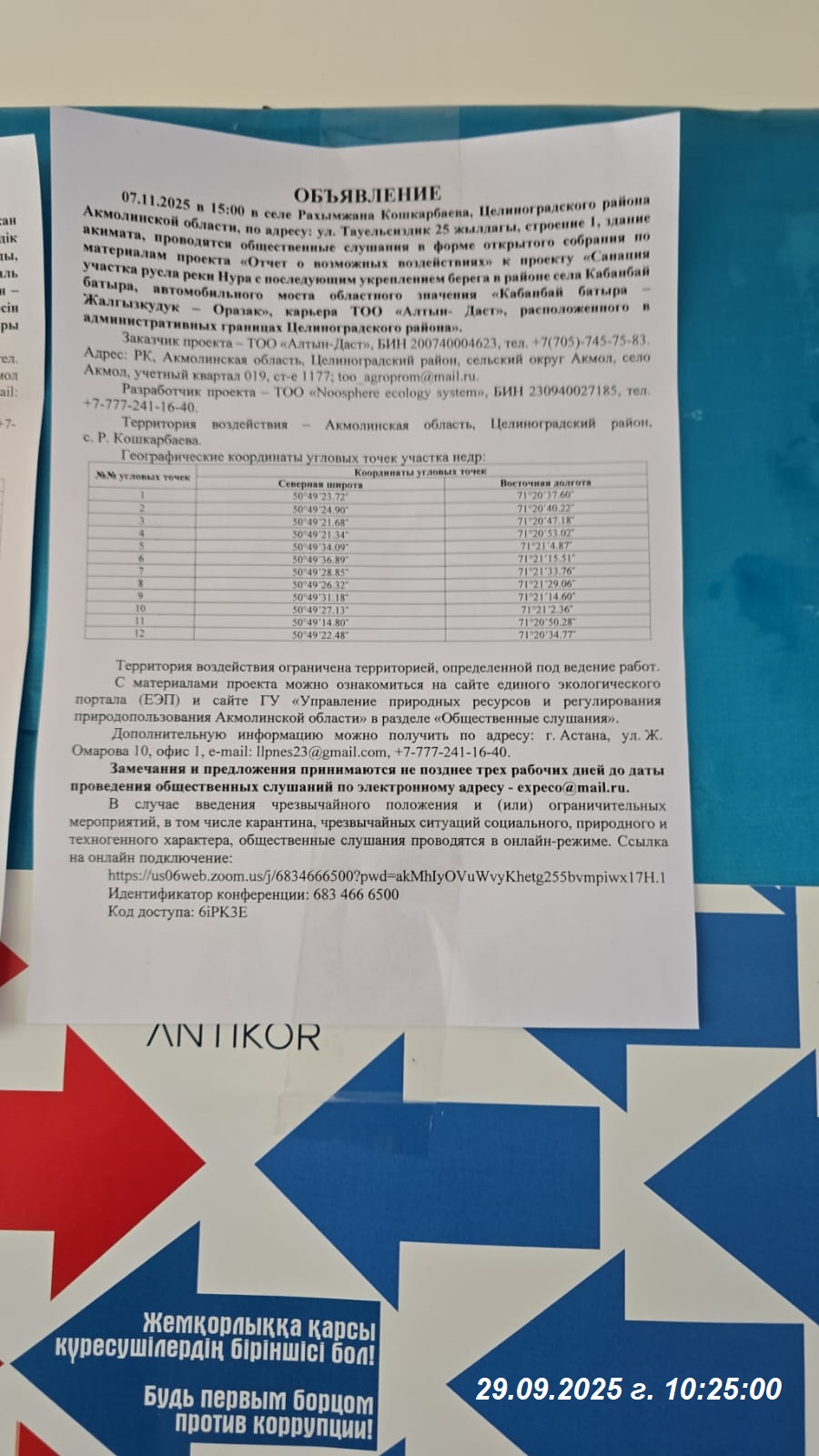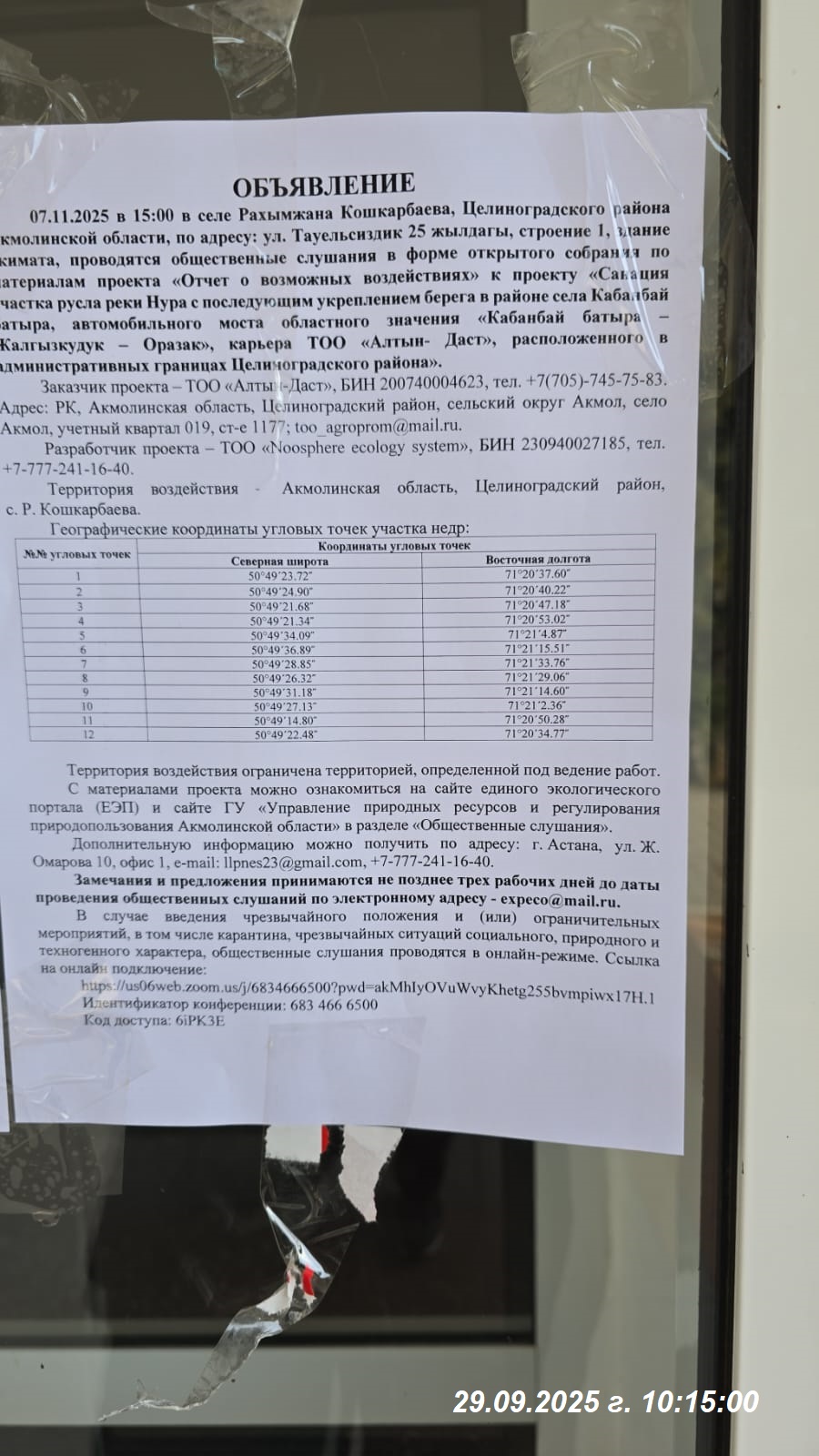 4. Повестка дня общественных слушаний: Целью данного проекта является укрепление береговой линии участка р.Нура для исключения дальнейшего подтопления села Кабанбай батыра, автомобильного моста областного значения «Кабанбай батыра – Жалгызкудук – Оразак», карьера ТОО «Алтын-Даст», предотвращения дальнейшего загрязнения, засорения и подмыва правого берега р. Нура, поддержания водного объекта в состоянии, соответствующим санитарно-эпидемиологическим и экологическим требованиям. На данном участке береговой линии ежегодно в результате резкого увеличения объема воды в весенний период происходит размыв береговой линии в сторону села, участков хозяйствующих субъектов, линий коммуникаций и сельскохозяйственных угодий. Для выполнения поставленных целей настоящим проектом предусмотрена санация р. Нура, включающая в себя: культуртехнические работы (береговая зона). спрямление и отвод русла реки от контрактной территории по добыче строительного песка участка Южный месторождения Рождественское, принадлежащего ТОО «Алтын-Даст». очистка дна русла реки от донных и иловых отложений. дноуглубительные, русло выпрямительные и берегоукрепительные работы. расчистка от растительности и мусора русла реки и береговой территории. Начало проведения мероприятий по санации реки Нура – 2026 год. Ожидаемые результаты: предотвращение ЧС в паводковый период; улучшение гидрологического режима р. Нура в районе села Кабанбай батыра, автомобильного моста областного значения «Кабанбай батыра – Жалгызкудук –Оразак», карьера ТОО «Алтын-Даст»; улучшение состояния окружающей природной среды.