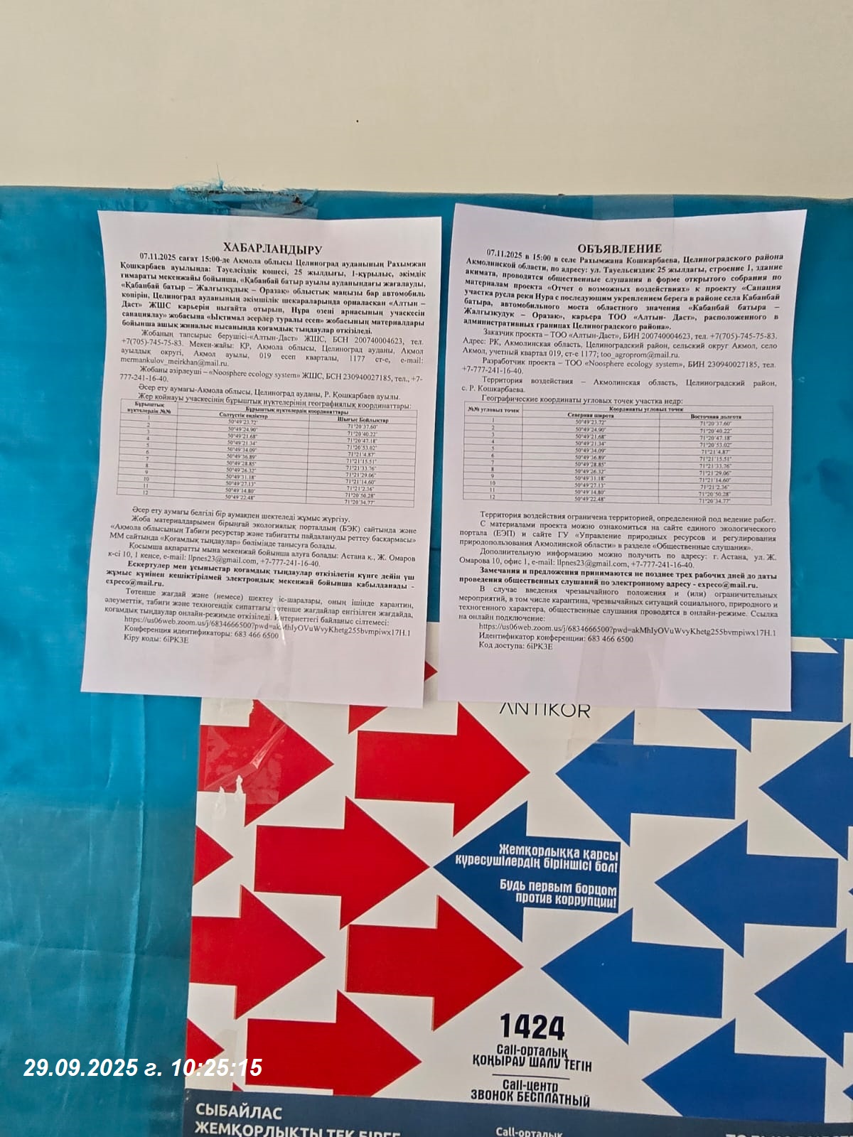 6. Объявление о проведении общественных слушаний на казахском и русском языках будет распространено следующими способами:
