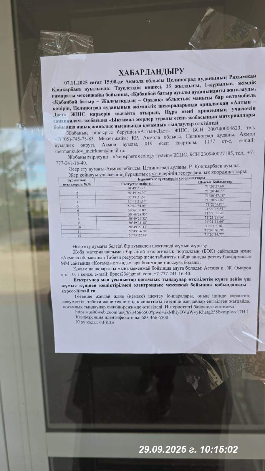3. Общественные слушания организованны: Управление природных ресурсов и регулирования природопользования Акмолинской области, expeco@mail.ru,