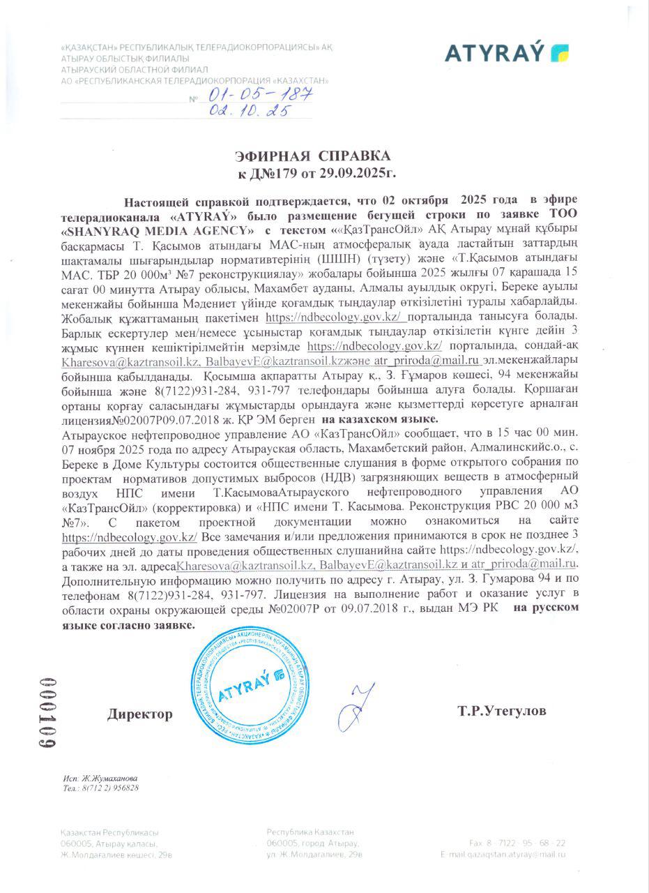 По проекту: Проект нормативов допустимых выбросов (НДВ) загрязняющих веществ НПС имени Т.Касымова Атырауского нефтепроводного управления АО "КазТрансОйл" (корректировка); «НПС имени Т. Касымова. Реконструкция РВС 20 000 м3 №7»
