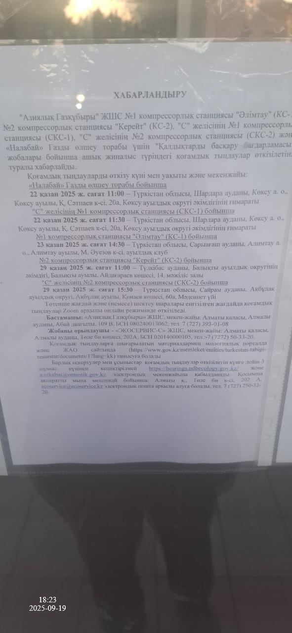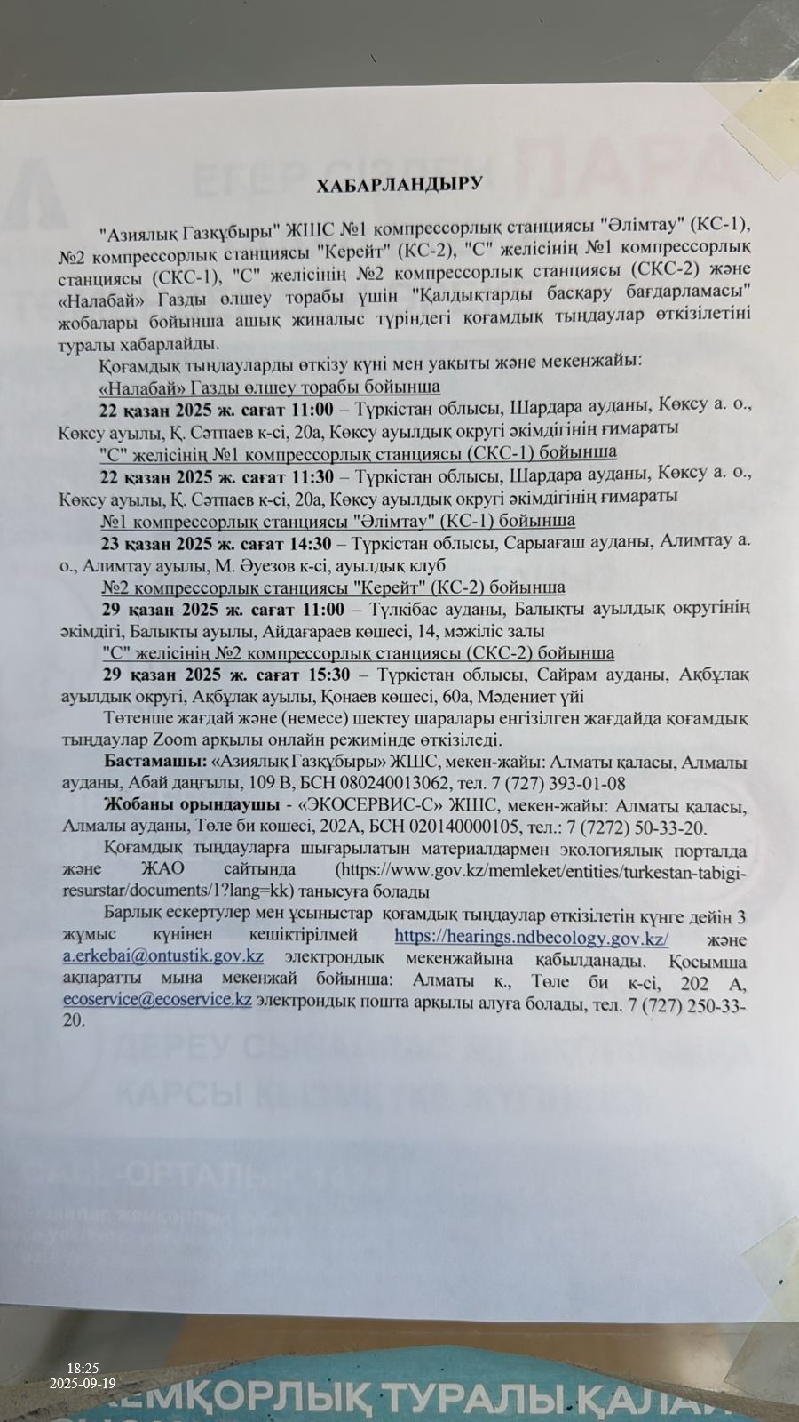 3. Общественные слушания организованны: Управление природных ресурсов и регулирования природопользования Туркестанской области, a.erkebai@ontustik.gov.kz,