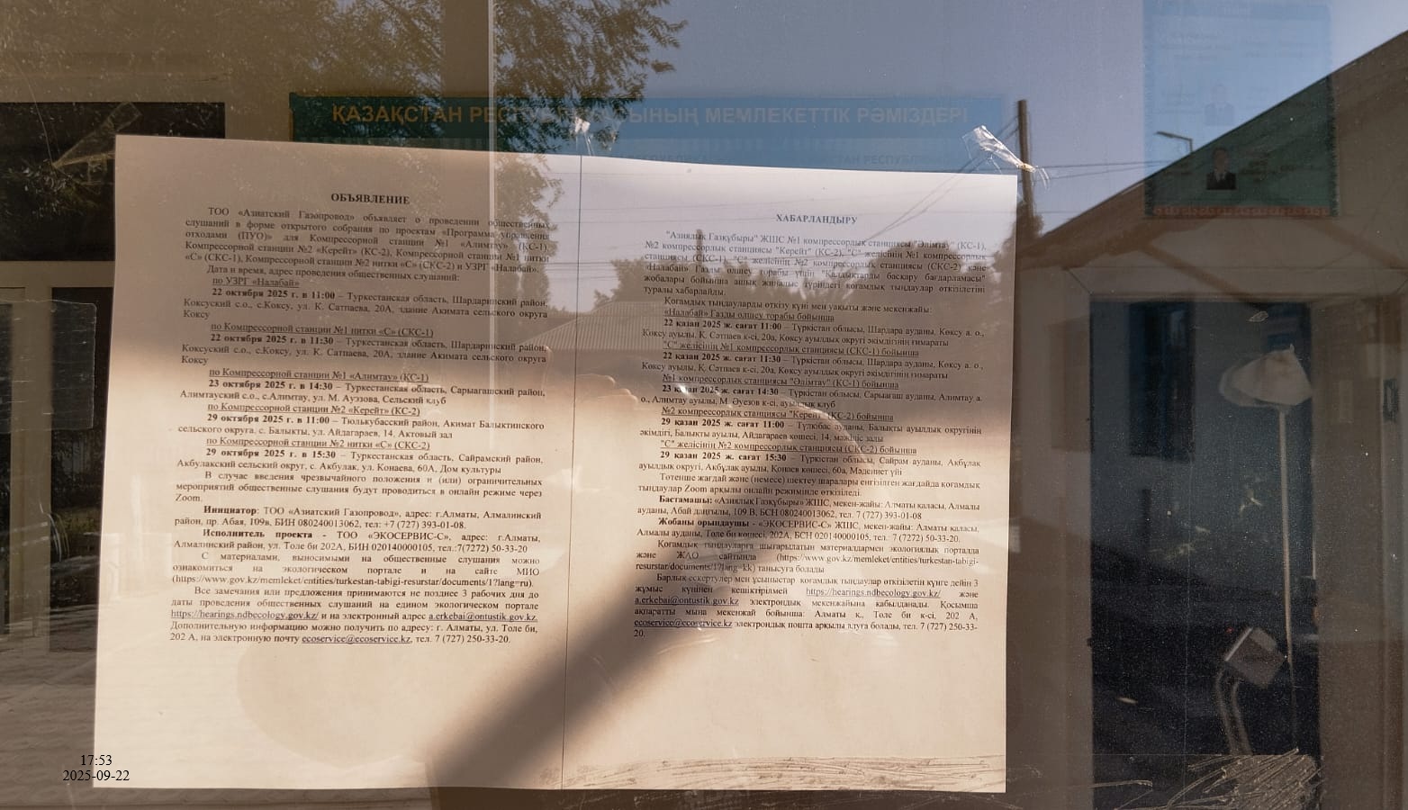 6. Объявление о проведении общественных слушаний на казахском и русском языках будет распространено следующими способами: