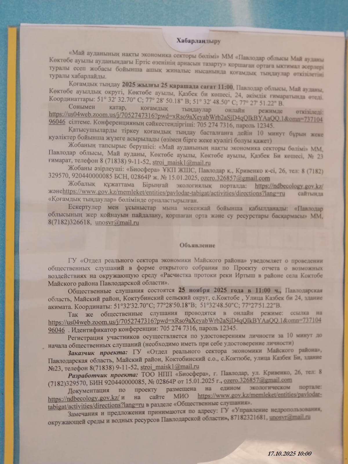 3. Общественные слушания организованны: УПРАВЛЕНИЕ НЕДРОПОЛЬЗОВАНИЯ, ОКРУЖАЮЩЕЙ СРЕДЫ И ВОДНЫХ РЕСУРСОВ ПАВЛОДАРСКОЙ ОБЛАСТИ, unosvr@mail.ru, 87182321681,