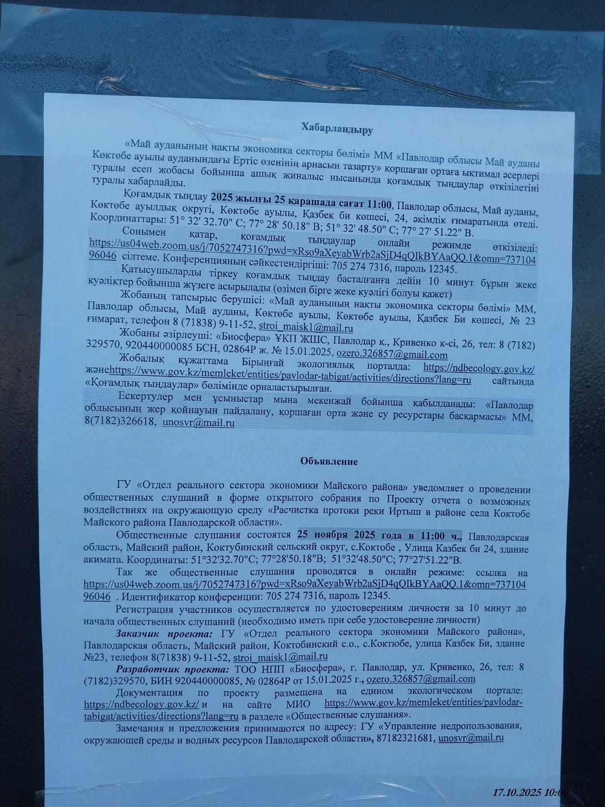 По проекту: Проект отчета о возможных воздействиях «Расчистка протоки реки Иртыш в районе села Коктобе Майского района Павлодарской области»