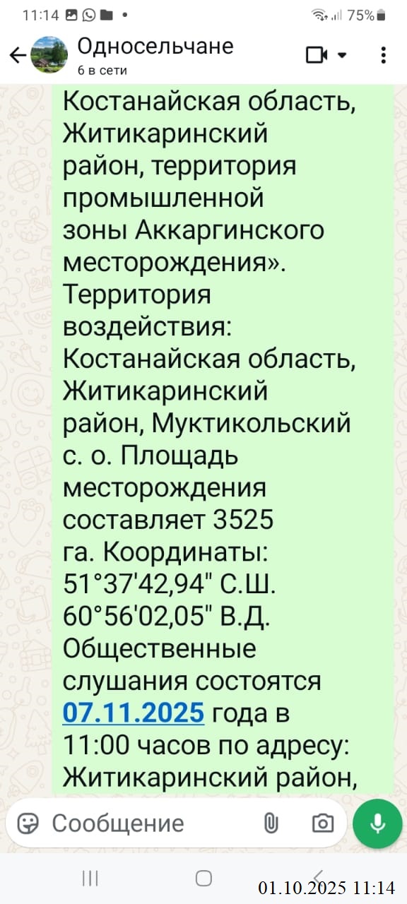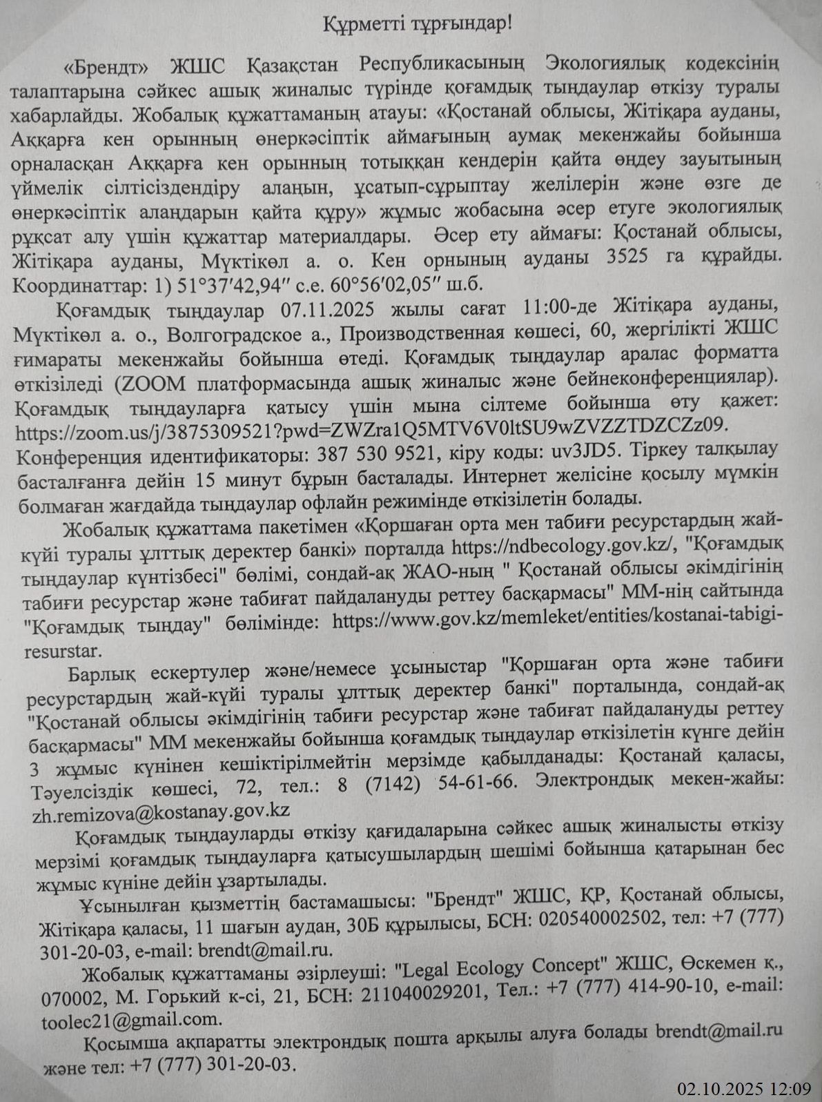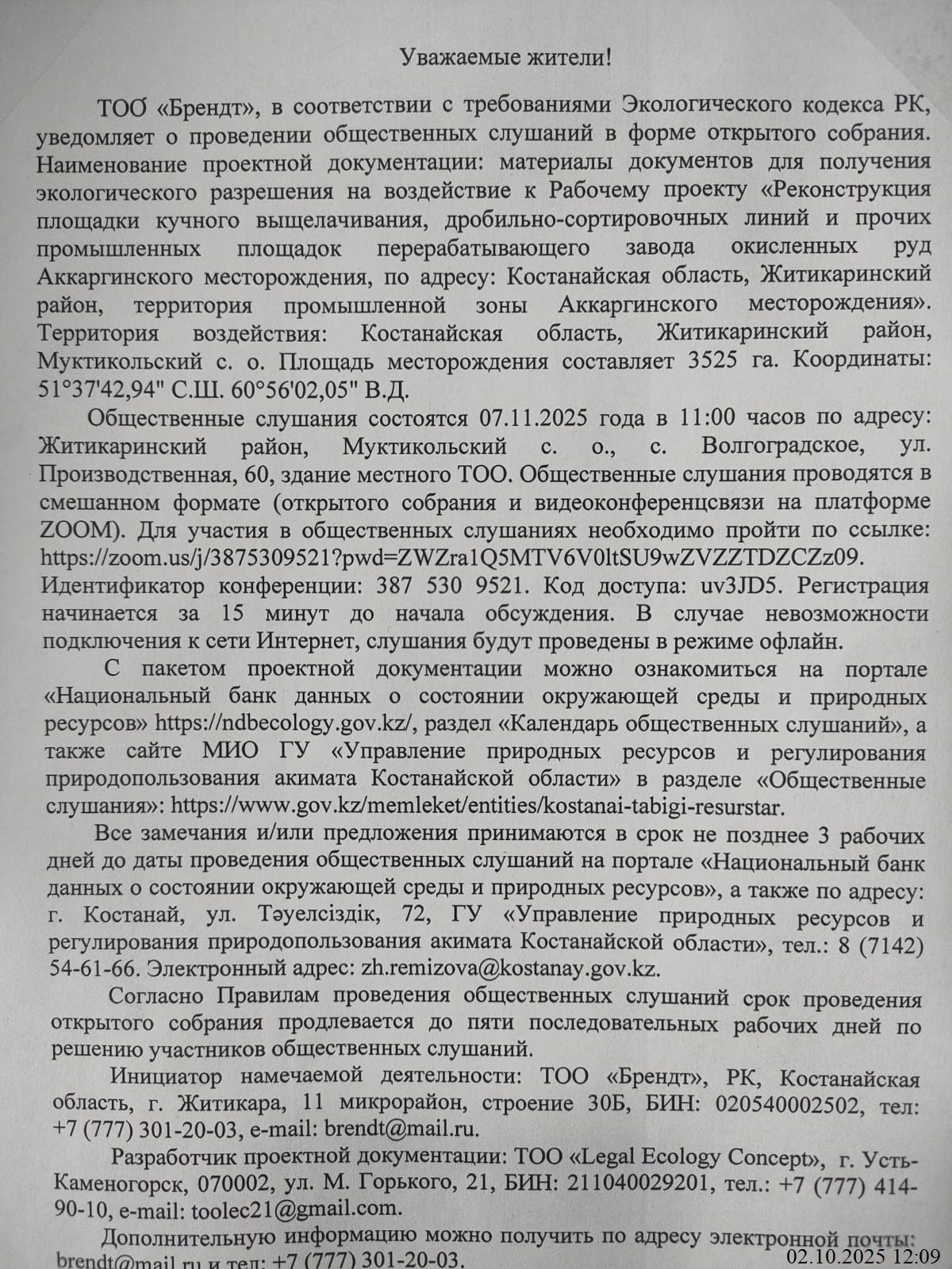 4. Повестка дня общественных слушаний: В рамках проекта «Реконструкция площадки кучного выщелачивания, дробильно-сортировочных линий и других промышленных площадок перерабатывающего завода окисленных руд Аккаргинского месторождения» предусматривается модернизация ключевых объектов производственного процесса с целью обеспечения качественной работы предприятия и повышения эффективности использования ресурсов переработки. Существующие кучи ПКВ №1,2 высотой 6 м. в четыре яруса полностью исчерпали свой ресурс и не пригодны к дальнейшему использованию. В связи с этим необходима организация новой технологической зоны для складирования, подготовки и переработки окисленных руд методом кучного выщелачивания. Проектом предусмотрено: Размещение новых ПКВ №3,4 с учетом требований промышленной безопасности, гидрогеологических условий и технологических параметров; Организация системы дренажа, гидроизоляции и орошений согласно современным стандартам кучного выщелачивания; Формирование штабеля в несколько ярусов по аналогии с ранее эксплуатируемым кучами; Внедрение усовершенствованных технологических решений, позволяющих повысить коэффициент извлечения металла; Перенос и модернизация отдельных узлов технологической схемы, включая КТП 630 кВА, и узел перекачки решения №3; Перенос 1-й, 2-й, 3-й линий дробильно-агломерационного комплекса (ДАК); Устройство технологических и эксплуатационных проездов; Обустройство аварийного пруда. Реализация данного проекта обеспечит стабильную работу перерабатывающего предприятия, разумное использование минерально-сырьевой базы месторождения и повышение эффективности переработки руды. Перед началом строительства предусматривается снятие плодородного растительного слоя (ПРС) на глубину 0,20 м. Проектные решения по добыче и переработке руды не изменяются и соответствуют ранее выданному заключению по результатам оценки воздействия на окружающую среду № KZ88VVX00290105 от 12.03.2024 года, экологическому разрешению на воздействие №KZ54VCZ03480555 от 17.05.2024 года. В административном отношении территория месторождений Аккаргинского рудного поля расположена в Житикаринском районе Костанайской области и географически приурочены к западному обрамлению Тургайского прогиба. Расстояние от месторождений Аккаргинского рудного поля до областного центра г. Костанай составляет 350 км, с ближайшим развитым промышленным и районным центром г. Житикара месторождения связаны асфальтовой и участками полевой дорогой общей протяженностью около 110 км. Ближайшая ж/д станция находится в г. Житикара. Координаты угловых точек: 1) 51 ̊31`50"сш, 61 ̊09`26"вд; 2) 51 ̊31`50"сш, 61 ̊09`37"вд; 3) 51 ̊31`39"сш, 61 ̊09`39"вд; 4) 51 ̊31`00"сш, 61 ̊09`56"вд; 5) 51 ̊30`39"сш, 61 ̊09`56"вд; 6) 51 ̊30`33,68"сш, 61 ̊09`59,09"вд; 7) 51 ̊29`34,85"сш, 61 ̊10`4,31"вд; 8) 51 ̊29`19,16"сш, 61 ̊10`5,31"вд; 9) 51 ̊29`17"сш, 61 ̊10`03"вд; 10) 51 ̊28`31"сш, 61 ̊10`16"вд; 11) 51 ̊28`04"сш, 61 ̊10`24"вд; 12) 51 ̊27`35,96"сш, 61 ̊10`34,07"вд; 13) 51 ̊29`11,89"сш, 61 ̊04`3,49"вд; 14) 51 ̊31`56,65"сш, 61 ̊06`3,17"вд; 15) 51 ̊36`28,84"сш, 61 ̊09`13,68"вд; 16) 51 ̊36`30,74"сш, 61 ̊11`17,3"вд; 17) 51 ̊28`45,74"сш, 61 ̊03`44,54"вд; 18) 51 ̊32`36,39"сш, 61 ̊07`11"вд; 19) 51 ̊33`17,81"сш, 61 ̊07`32,14"вд; 20) 51 ̊33`17,94"сш, 61 ̊07`38,31"вд; 21) 51 ̊33`40,82"сш, 61 ̊07`53,68"вд; 22) 51 ̊34`3,59"сш, 61 ̊08`2,74"вд; 23) 51 ̊34`3,68"сш, 61 ̊08`22,73"вд; 24) 51 ̊33`56"сш, 61 ̊08`20,04"вд; 25) 51 ̊33`56"сш, 61 ̊08`24"вд; 26) 51 ̊33`28"сш, 61 ̊08`13"вд; 27) 51 ̊33`23,7"сш, 61 ̊08`8,7"вд; 28) 51 ̊33`6,66"сш, 61 ̊08`2,71"вд. Площадь месторождения 3525 га. Промышленные кондиции были впервые утверждены ГКЗ