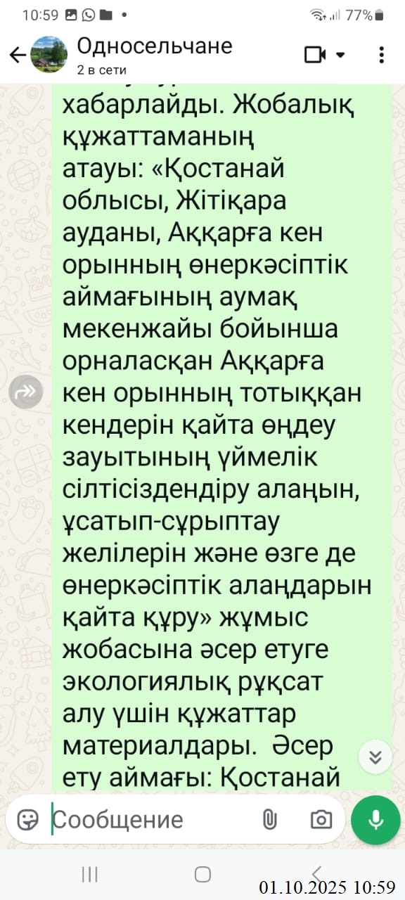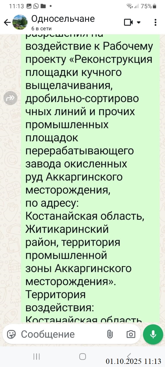 По проекту: Материалы документов для получения экологического разрешения на воздействие к Рабочему проекту "Реконструкция площадки кучного выщелачивания, дробильно-сортировочных линий и прочих промышленных площадок перерабатывающего завода окисленных руд Аккаргинского месторождения по адресу: Костанайская область, Житикаринский район, территория промышленной зоны Аккаргинского месторождения"