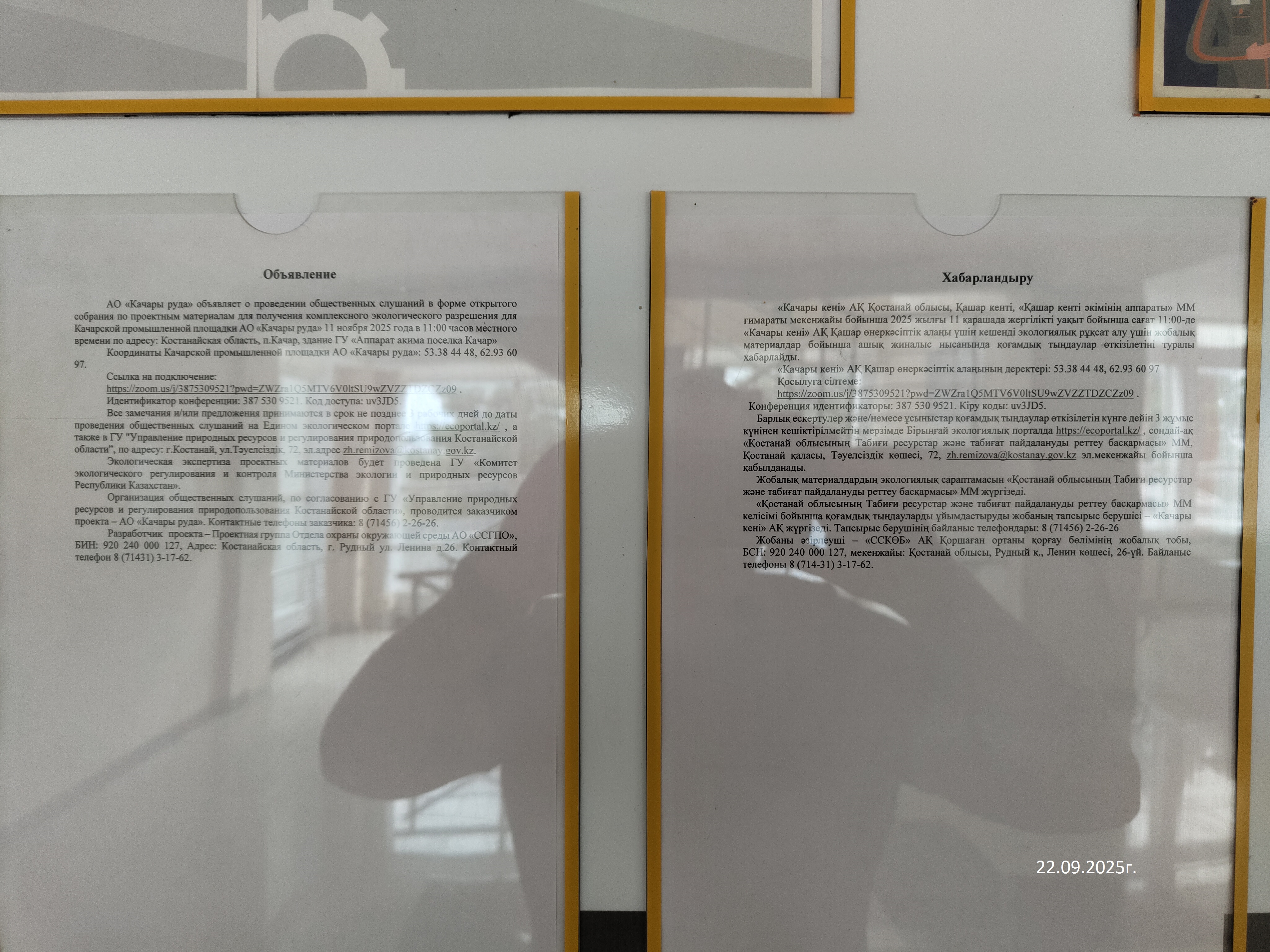 6.3. расположение мест, специально предназначенных для Размещения печатных объявлений (доски объявлений): АО "Качары руда", АБК