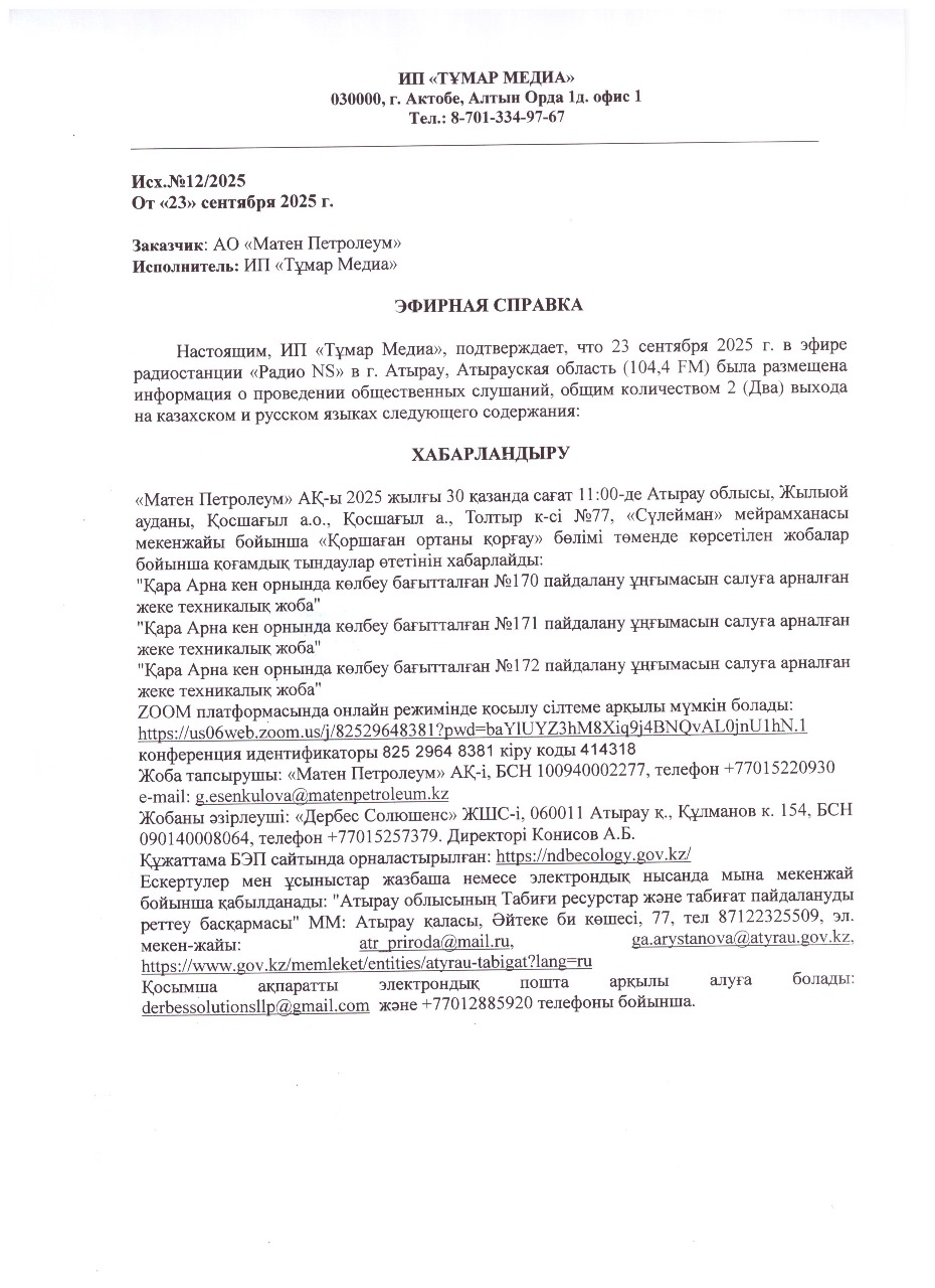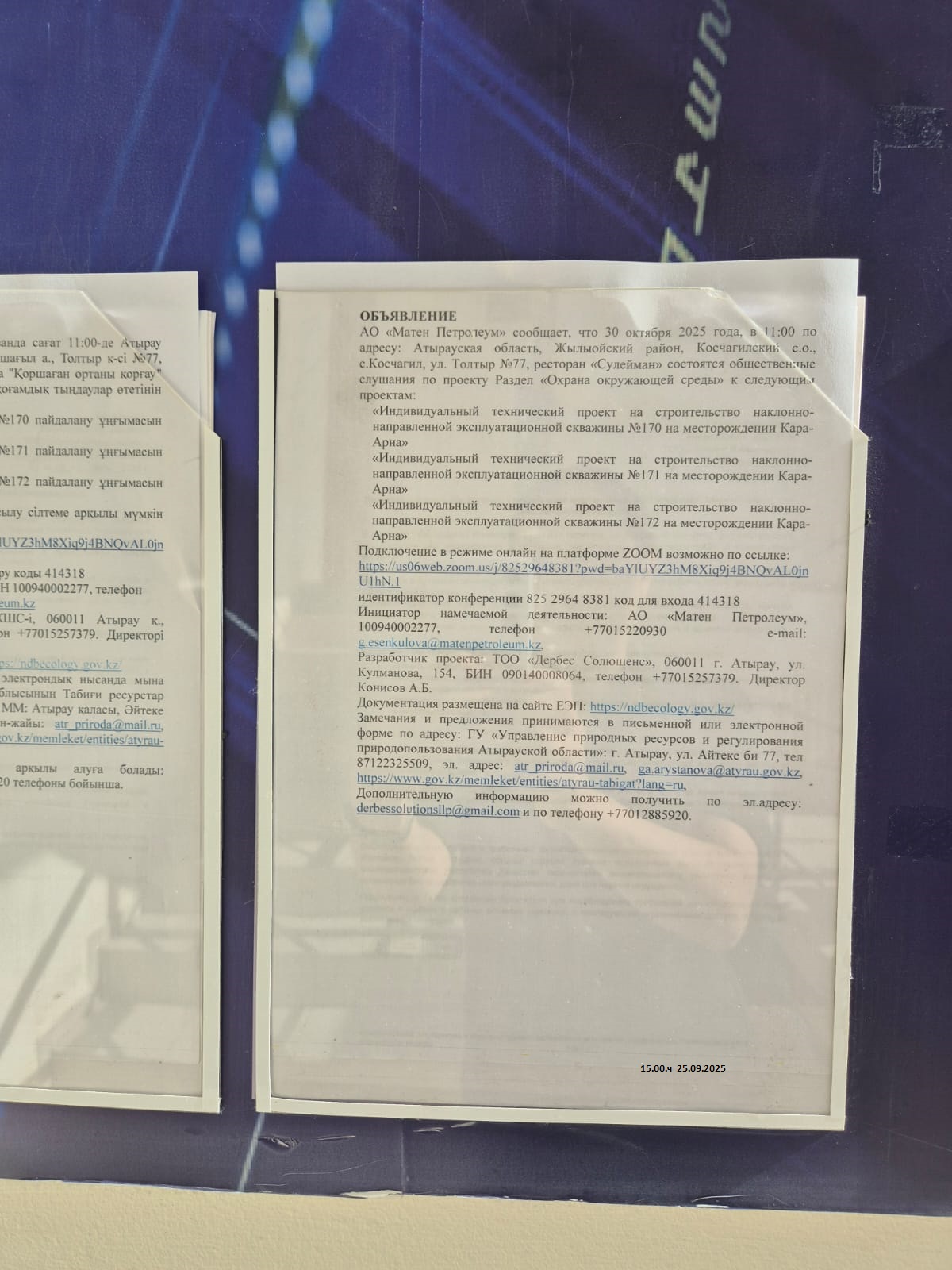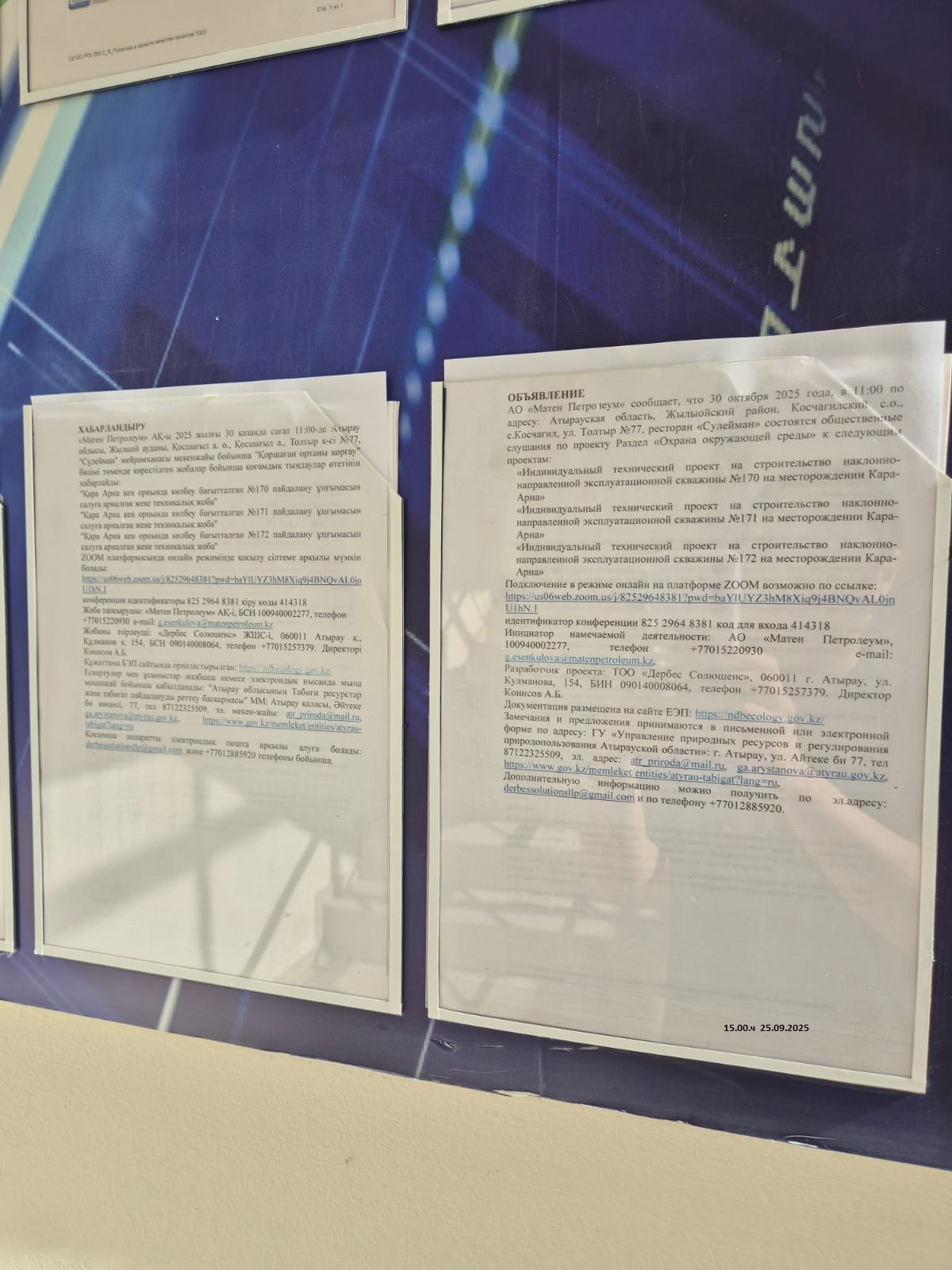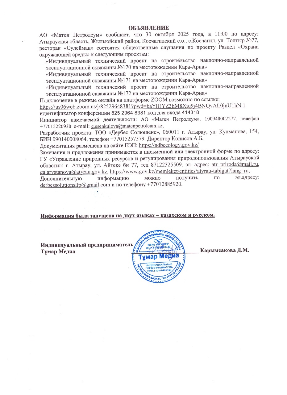 4. Повестка дня общественных слушаний: Проектом предусмотрено строительство наклонно-направленных эксплуатационных скважин №170, №171, №172 на месторождении Кара-Арна в Жылыойском районе Атырауской области контрактной территории АО «Матен Петролеум». Строительно-монтажные работы включают: • планировку площадки под буровое оборудование; • строительство площадки под буровое оборудование. Район строительных работ обеспечивается устройством площадок для монтажа узлов оборудования, подводят электролинию (световую и силовую), обеспечивают радиосвязь в режиме диспетчерской связи, производится монтаж бурового оборудования. Подготовительные работы к бурению состоят из следующих видов работ: • стыковка технологических линий; • проверка работоспособности оборудования. Бурение и крепление скважин. В проекте процесс бурения и крепления скважины включает ряд операций: спуск бурильных труб с разрушающим инструментом в скважину; разрушение породы забоя; наращивание бурильного инструмента по мере углубления скважины; промывка забоя скважины буровым раствором с целью выноса разрушенной породы из скважины; укрепление (крепление) стенок скважины при достижении определенной глубины обсадными трубами с последующим цементированием пространства между стенкой скважины и спущенными трубами (разобщение пластов). Испытание скважины. После окончания процесса бурения и крепления скважины буровая установка ZJ30 демонтируется, и на устье скважины монтируется установка для испытания скважин АПРС-40. Строительство скважин запланирован на 2025-2026 гг. Координаты горного отвода: 1) 46°14' 58.458"СШ, 53° 21' 43.443" ВД, 2) 46°13' 40.424"СШ, 53°22' 38.706" ВД, 3) 46°15' 7.998"СШ, 53°21' 51.930"ВД. ссылка на онлайн подключение https://us06web.zoom.us/j/82529648381?pwd=baYlUYZ3hM8Xiq9j4BNQvAL0jnU1hN.1 идентификатор входа 825 2964 8381 код входа 414318