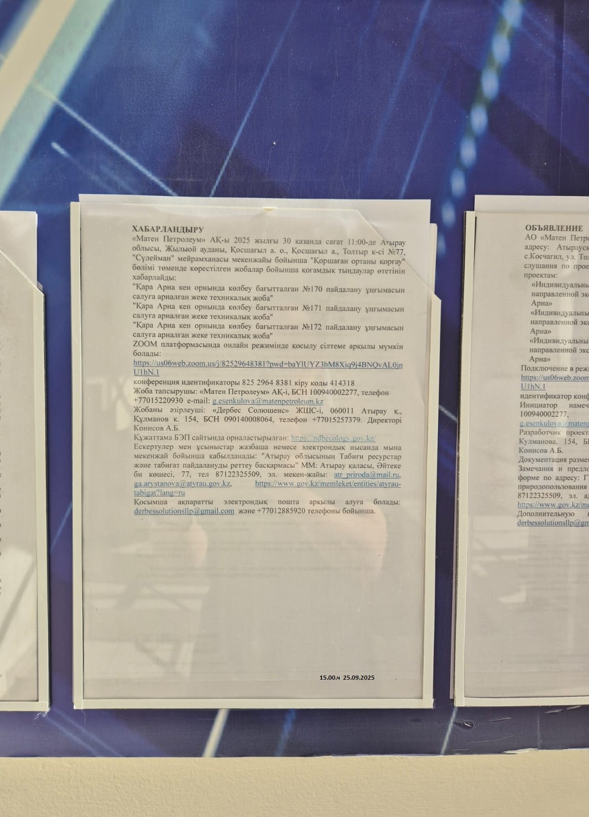 3. Общественные слушания организованны: Управление природных ресурсов и регулирования природопользования Атырауской области, atr.priroda@atyrau.gov.kz,
