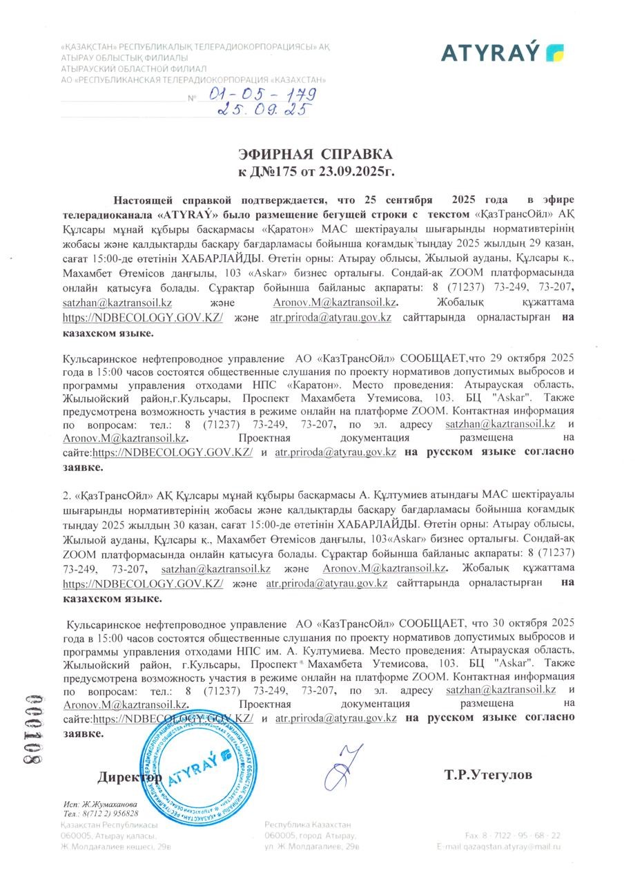 3. Общественные слушания организованны: Управление природных ресурсов и регулирования природопользования Атырауской области, atr.priroda@atyrau.gov.kz,