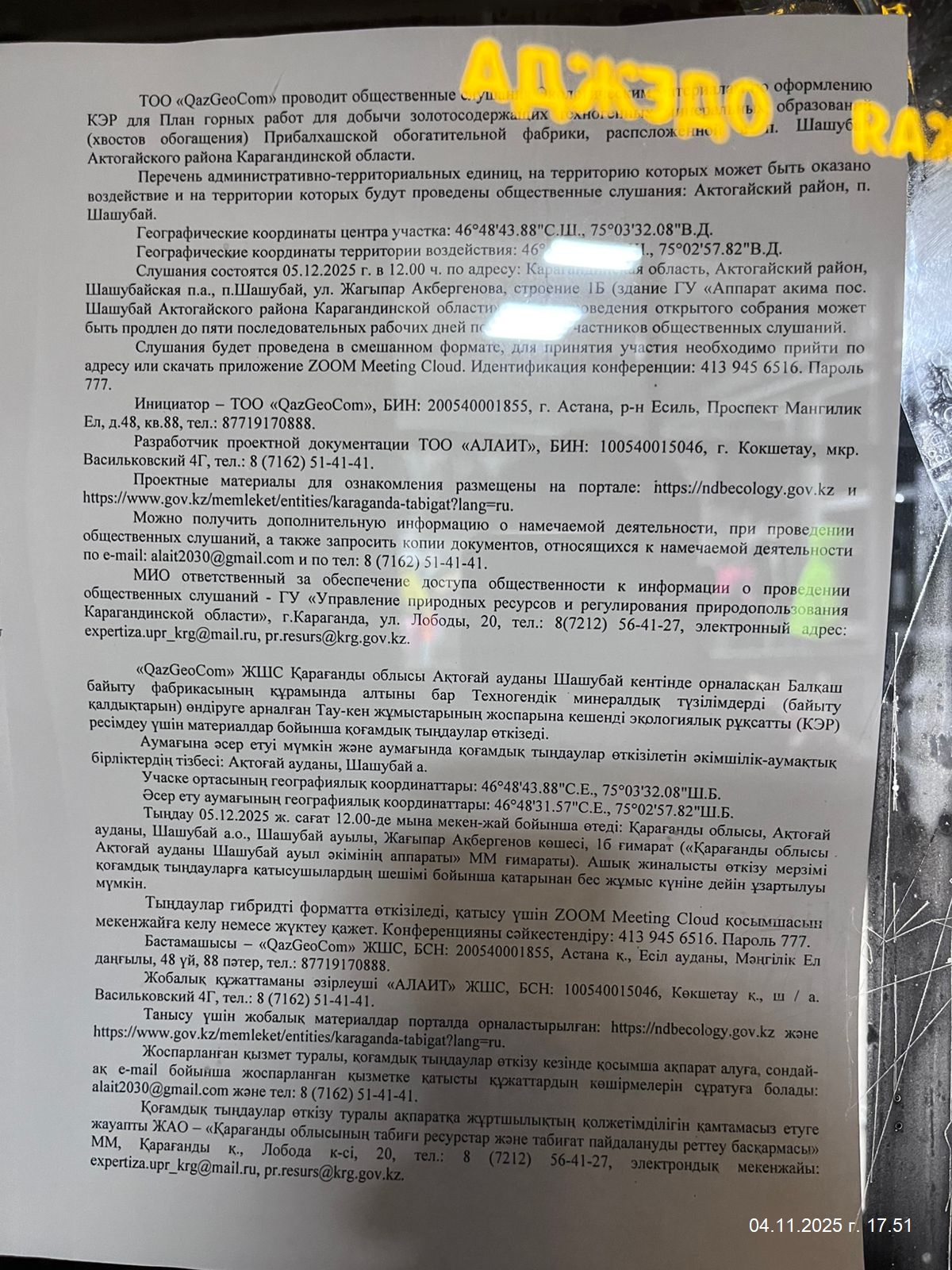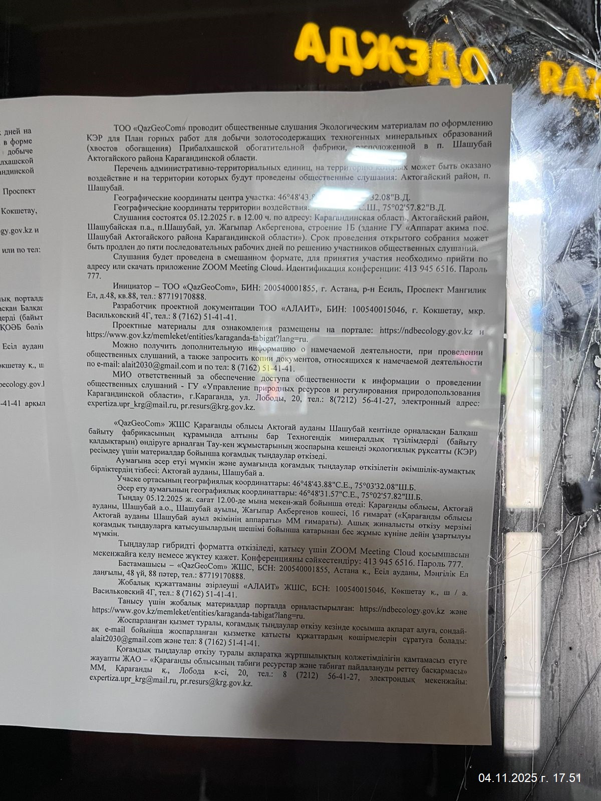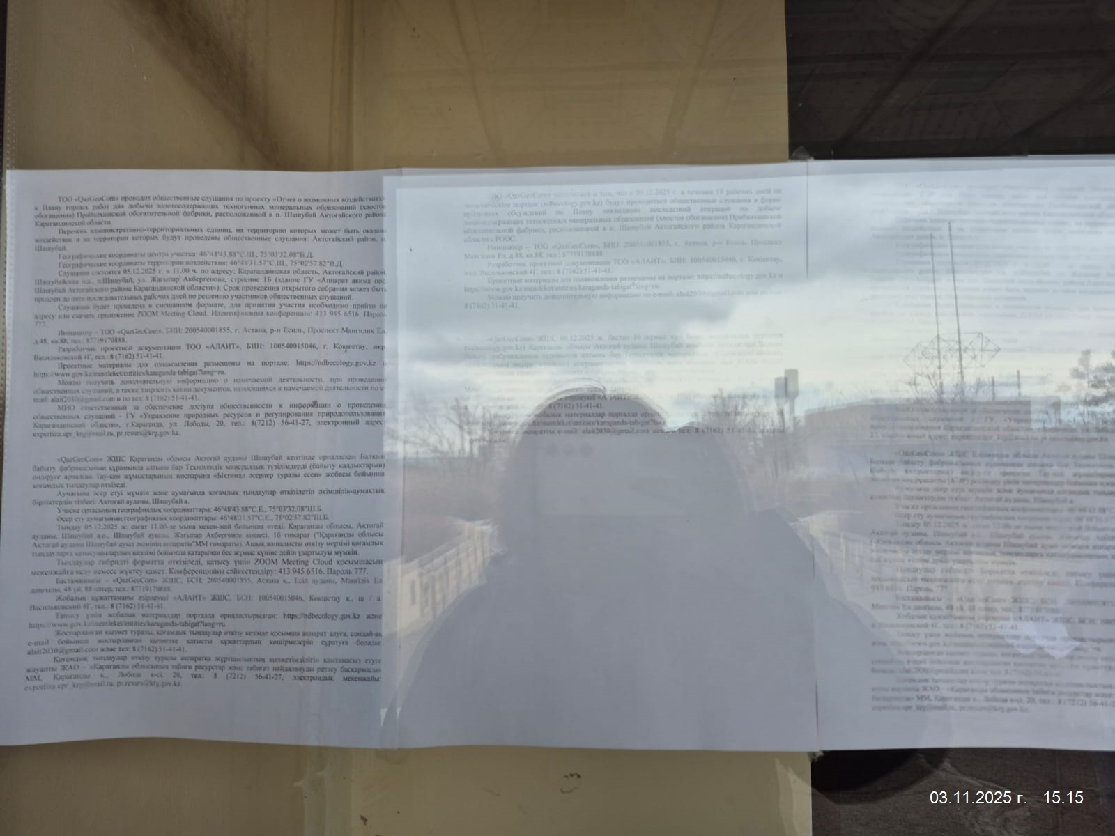 3. Общественные слушания организованны: Управление природных ресурсов и регулирования природопользования Карагандинской области, expertiza.upr_krg@mail.ru,