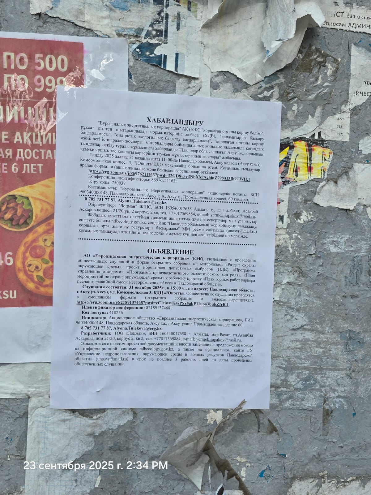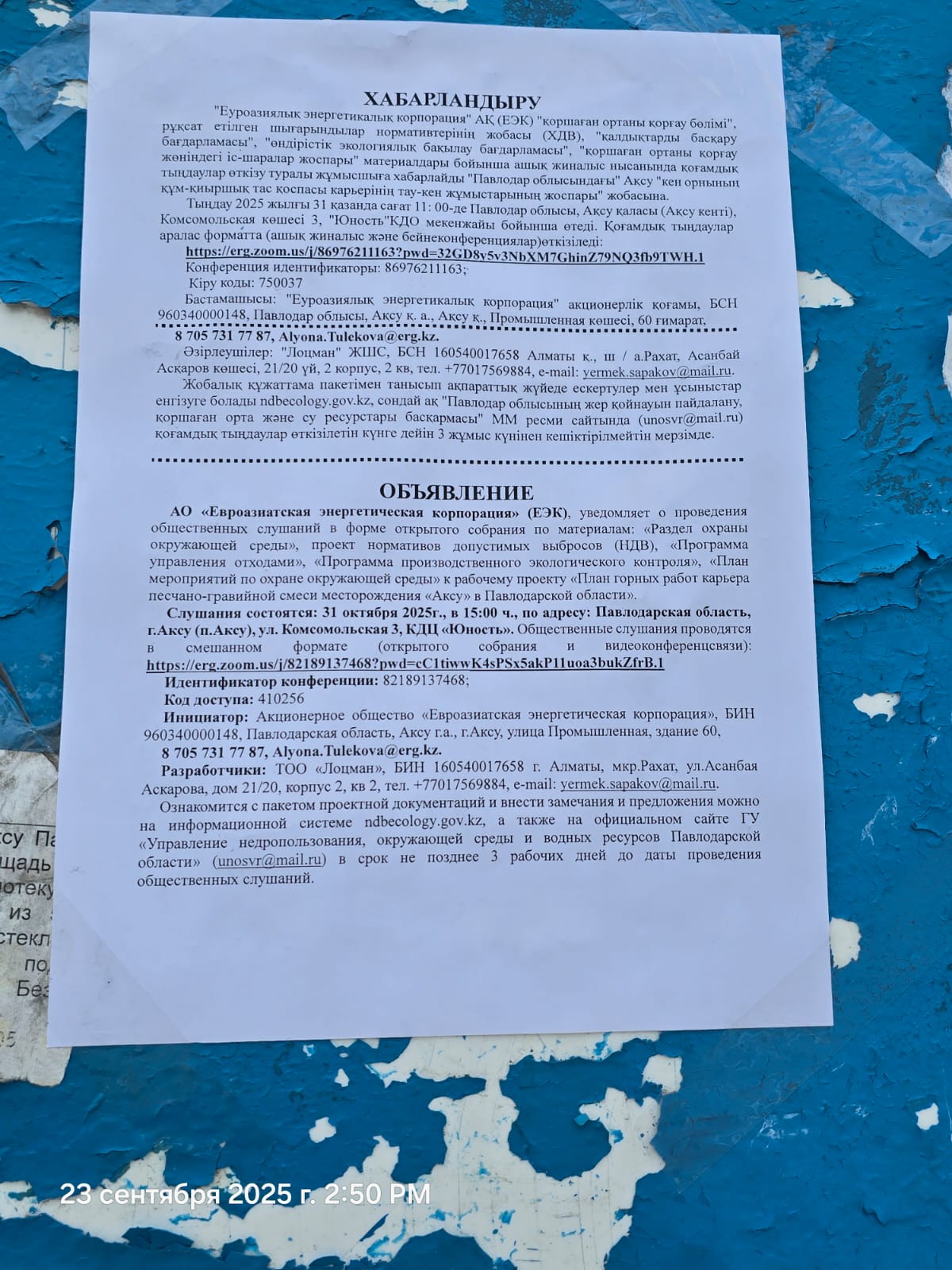 3. Общественные слушания организованны: УПРАВЛЕНИЕ НЕДРОПОЛЬЗОВАНИЯ, ОКРУЖАЮЩЕЙ СРЕДЫ И ВОДНЫХ РЕСУРСОВ ПАВЛОДАРСКОЙ ОБЛАСТИ, unosvr@mail.ru, 87182321681,