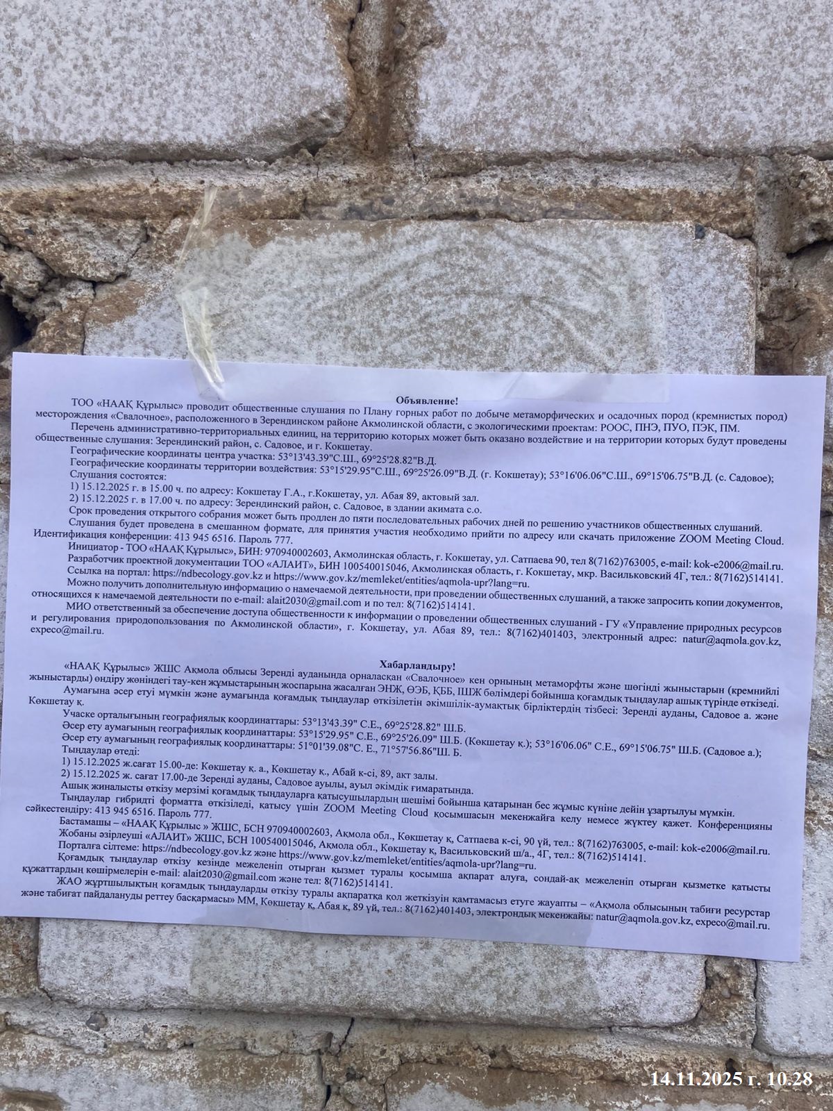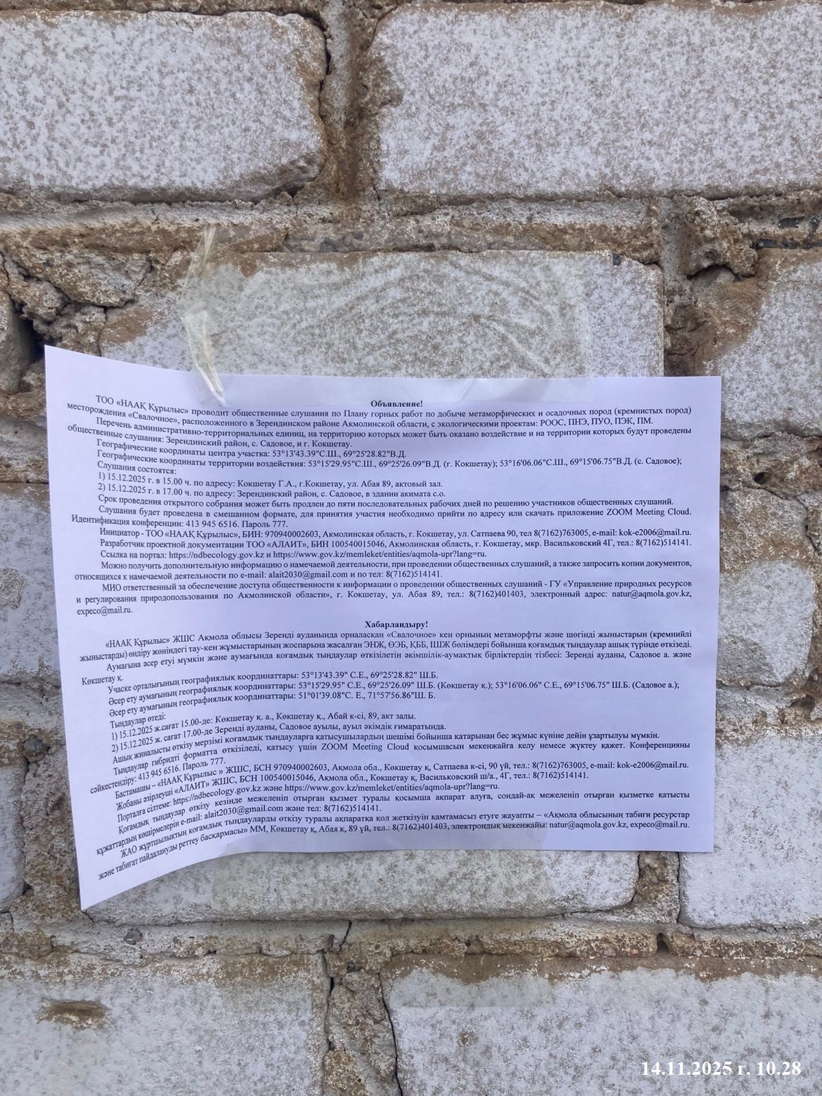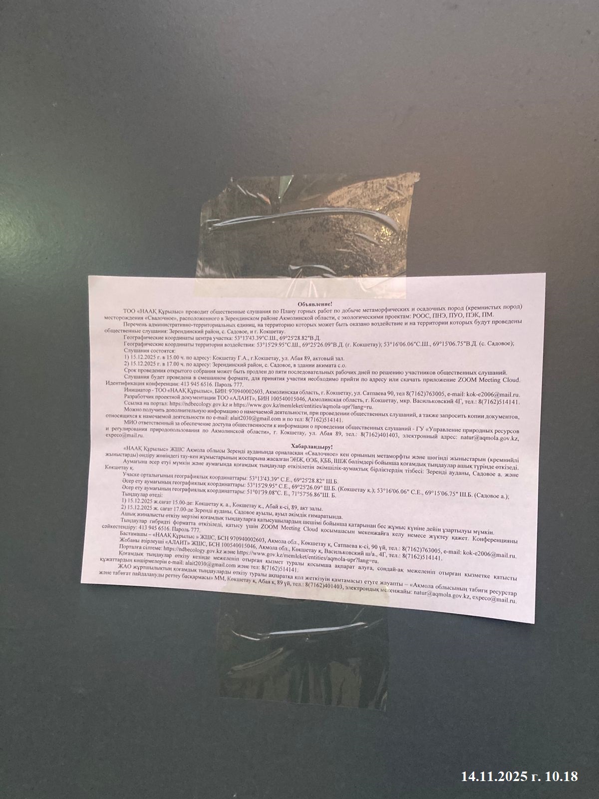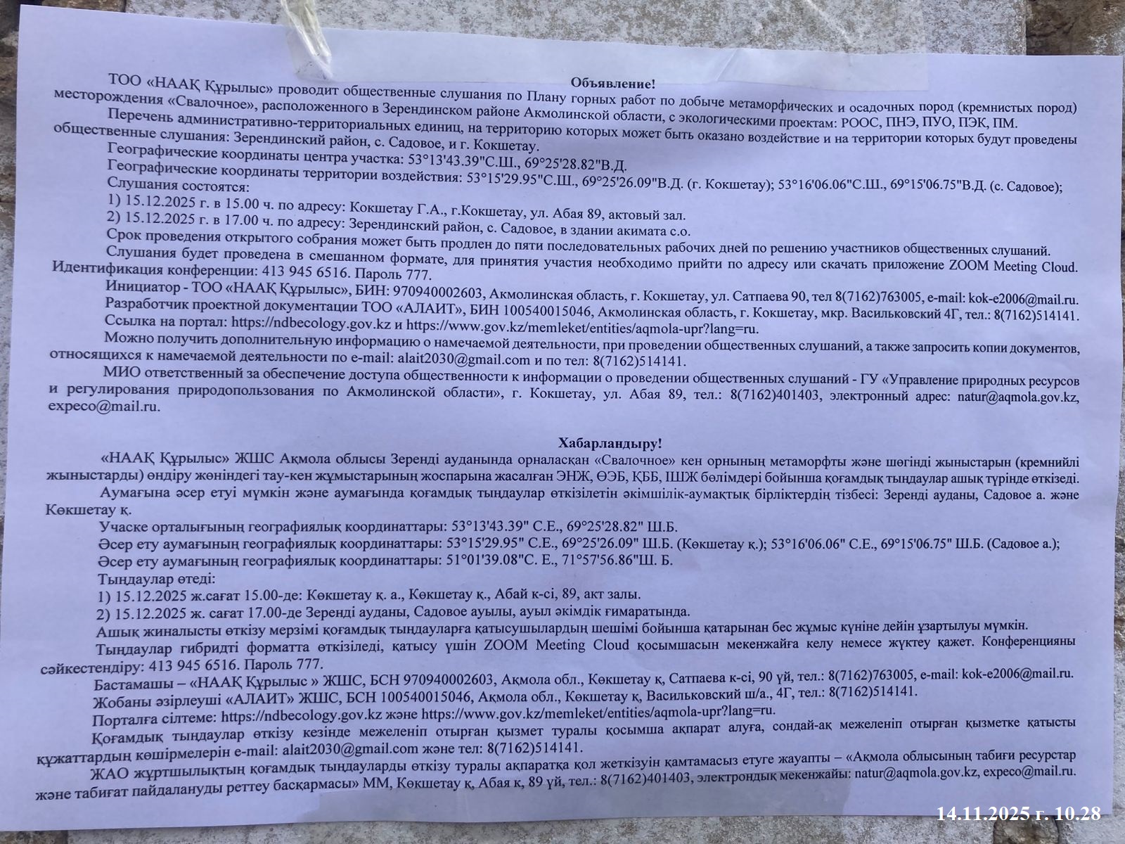 3. Общественные слушания организованны: Управление природных ресурсов и регулирования природопользования Акмолинской области, expeco@mail.ru,